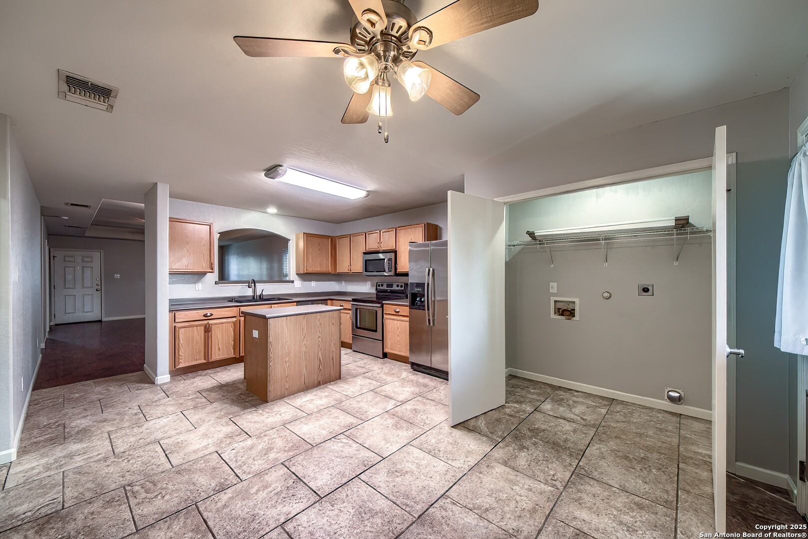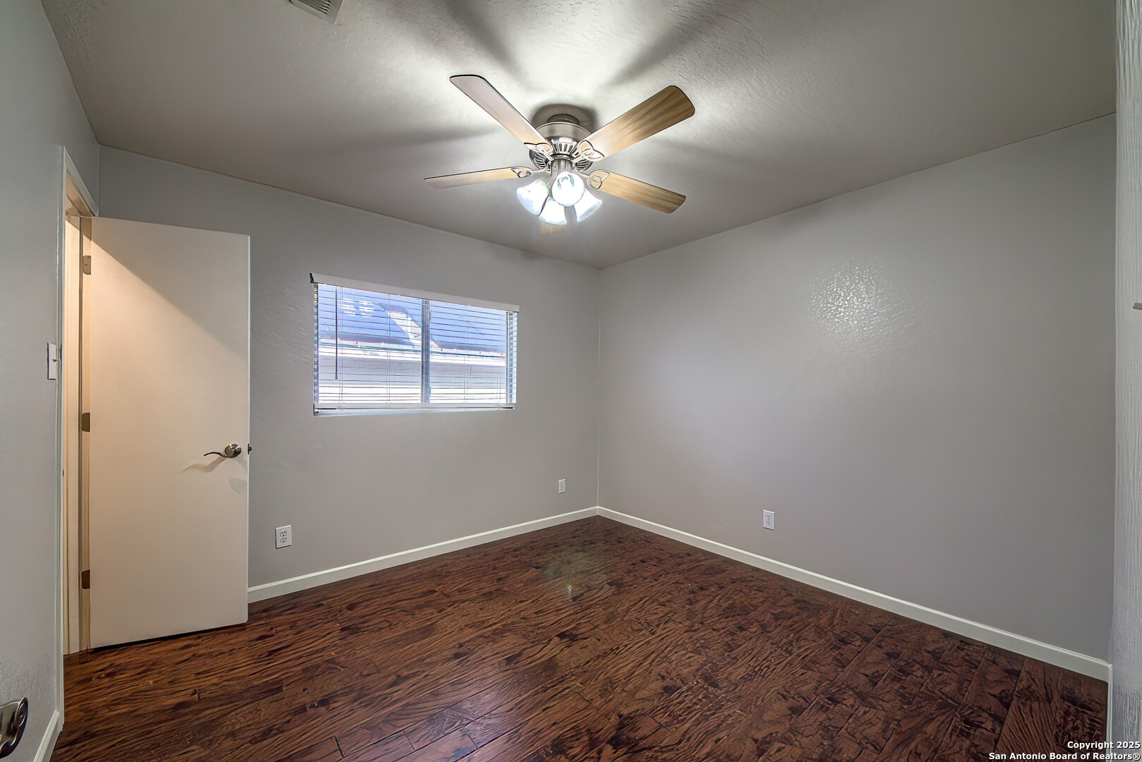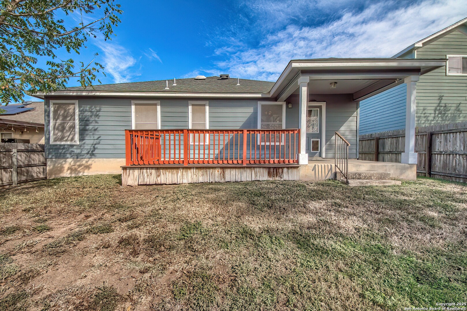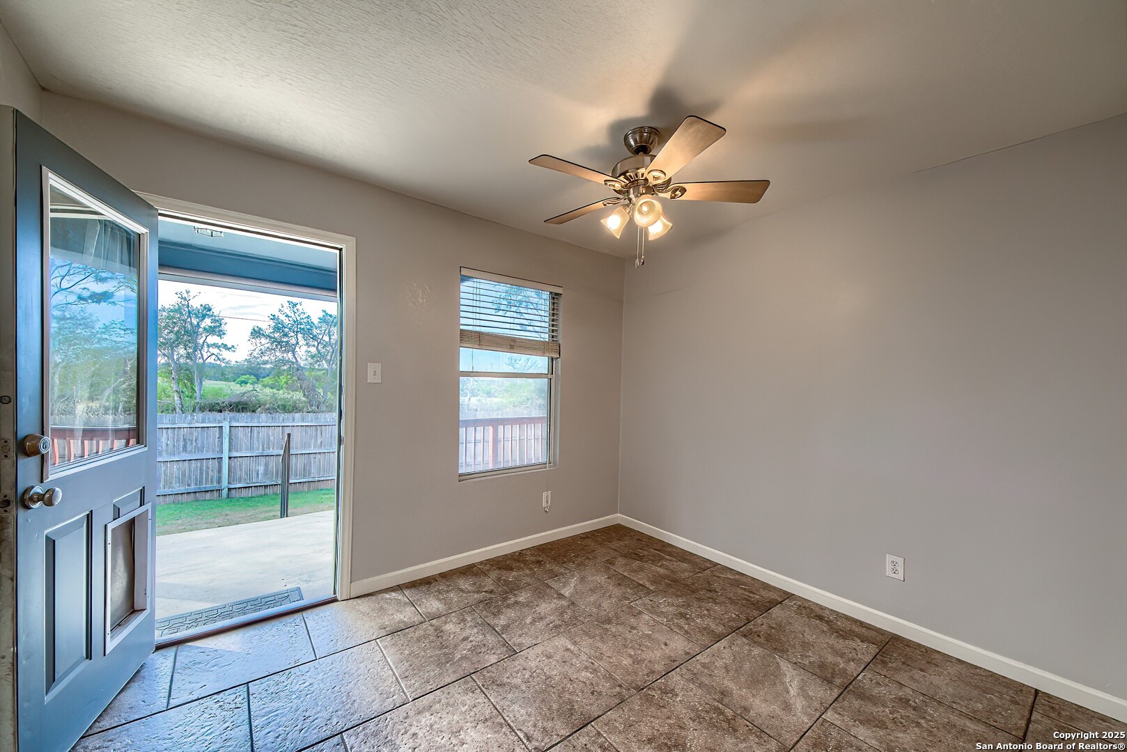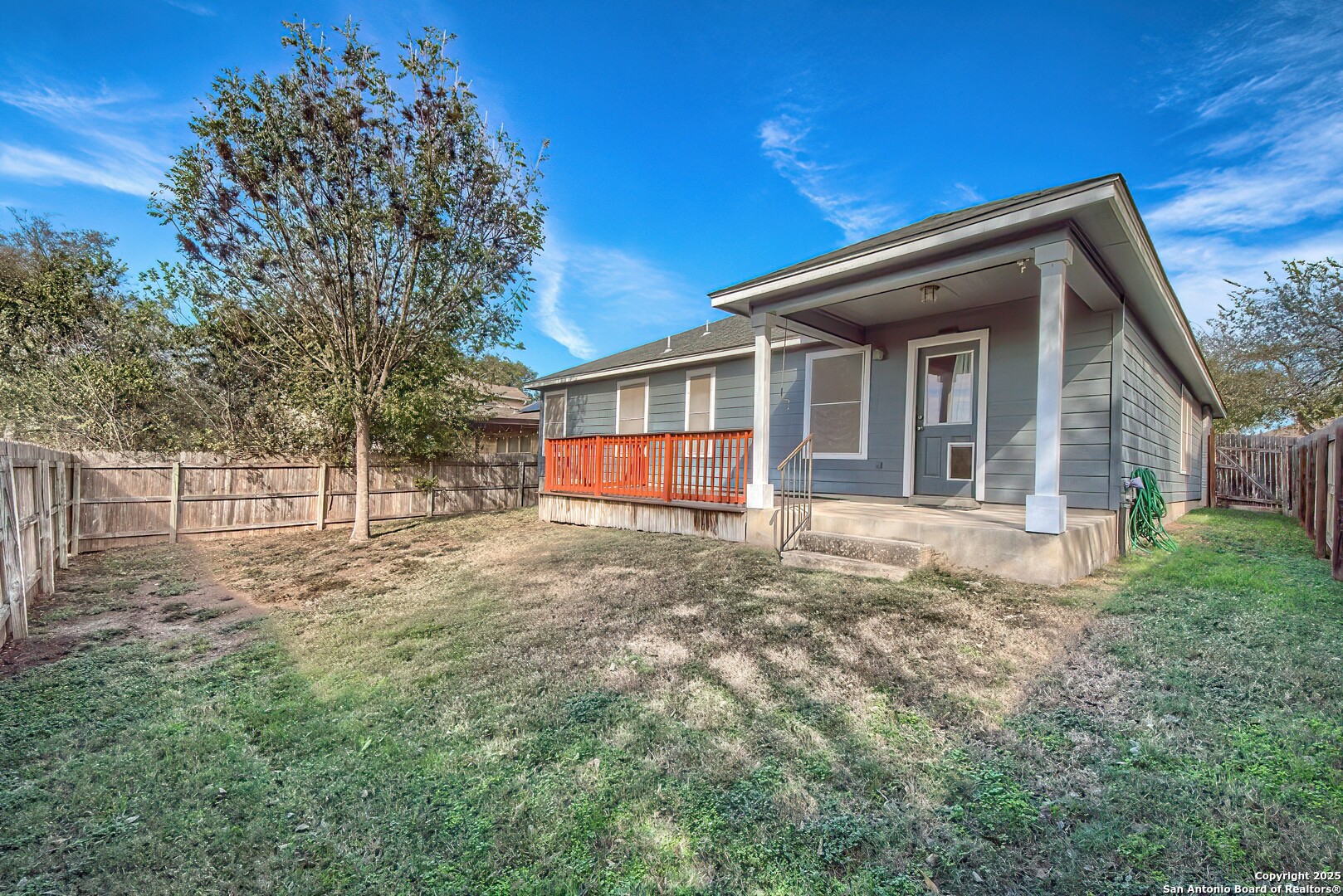 Step inside this beautifully maintained single-story home offering an open and inviting floor plan with no wasted space. From the moment you enter, you're greeted by rich wood laminate flooring, fresh neutral paint, and a bright layout perfect for comfortable living and entertaining. A dedicated office with French doors sits off the entry - ideal for working from home or flexible use. The spacious living and dining area features tray ceilings and abundant natural light, flowing seamlessly into the large kitchen. The kitchen includes ample cabinet storage, a center island, stainless steel appliances, and a window pass-through that keeps the space open to the main living area. Oversized laundry room offers extra storage and convenience. The generously sized primary suite includes wood laminate flooring, a ceiling fan, and an updated bath featuring a dual-sink granite vanity, soaking tub, tiled shower surround, and a massive walk-in closet with built-in shelving. Enjoy peaceful mornings or relaxing evenings on the covered back patio overlooking a private yard with no rear neighbors - just open views and mature trees. Fully fenced and ready for pets or outdoor enjoyment. This home offers clean finishes, functional spaces, and move-in readiness. A must-see for tenants seeking a well-kept property with great layout and privacy.