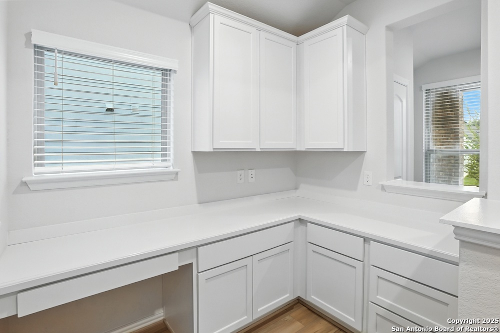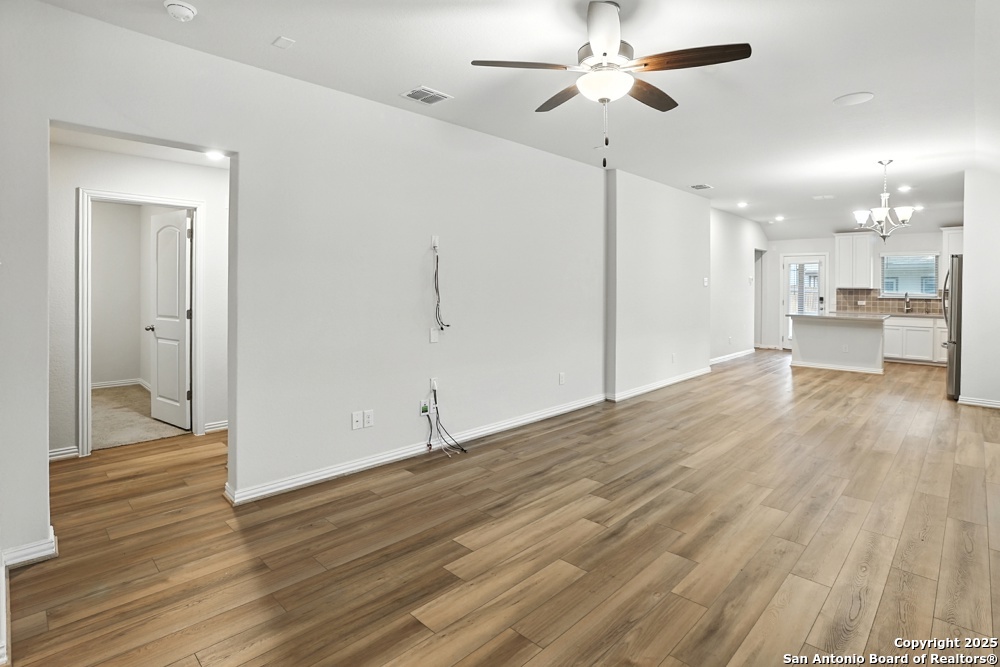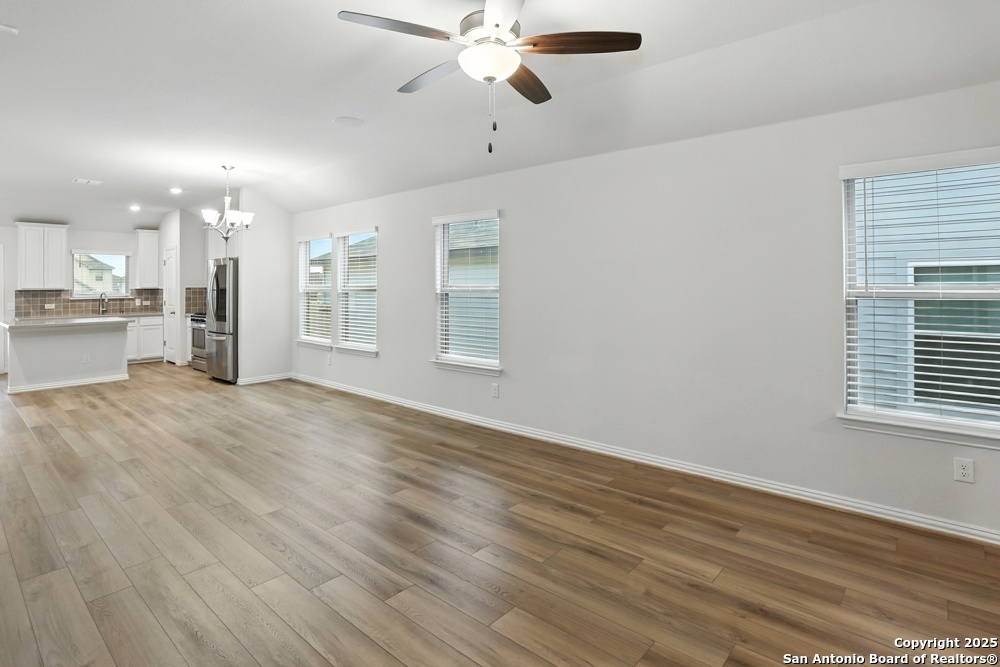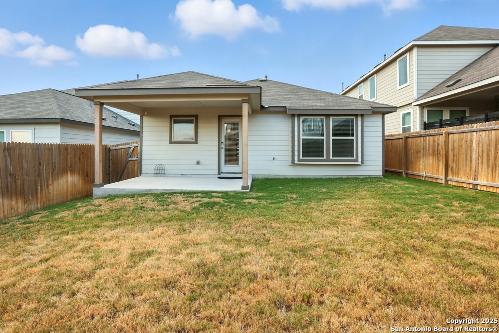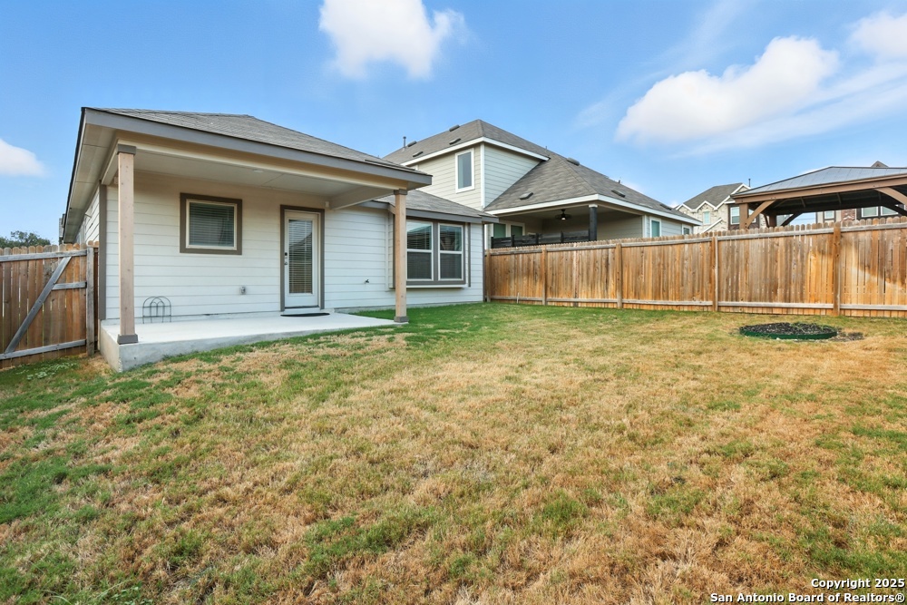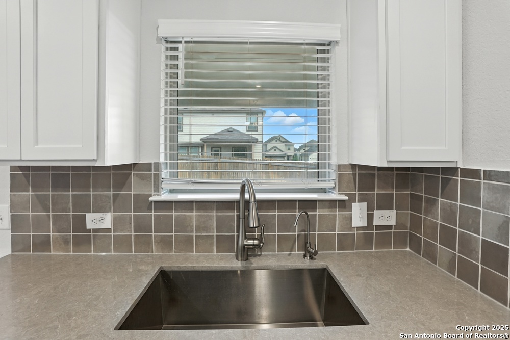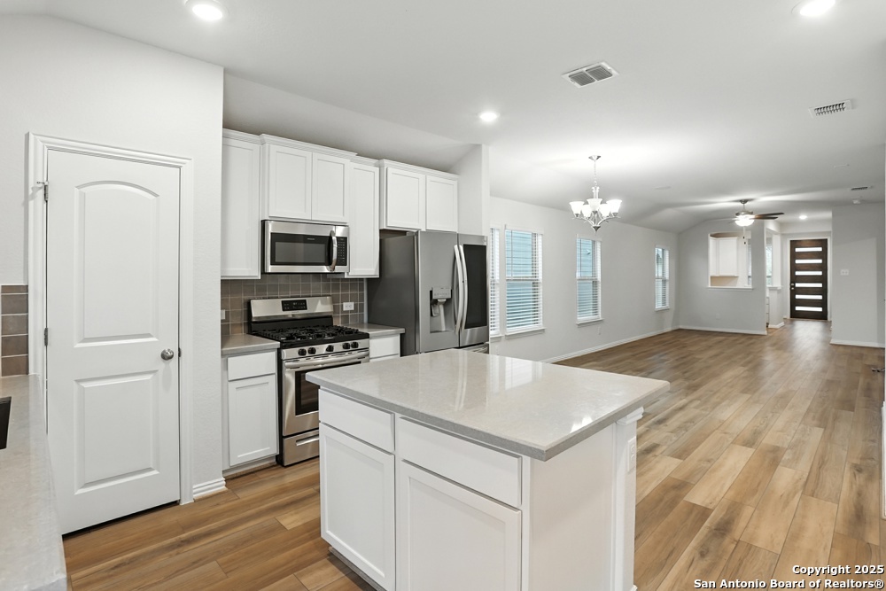 This stunning one-story home in the Veranda Subdivision combines modern style with everyday comfort. The open floor plan includes a versatile bonus room that's perfect for a home office, while the spacious living room boasts luxury laminate flooring, abundant natural light, and built-in surround sound for effortless entertaining. The chef's kitchen is a showstopper with stainless steel appliances, including a gas stove and refrigerator, custom cabinets, quartz countertops, a decorative backsplash, recessed lighting, and a large island that anchors the space. The master suite is a peaceful retreat featuring high ceilings, a ceiling fan, plush carpet, and a generous walk-in closet, while the master bath offers a double vanity and oversized walk-in shower. A washer and dryer add convenience, and the private backyard with a covered patio and privacy fence is perfect for gatherings or quiet evenings. Enjoy community amenities including a pool, clubhouse, and playground, all while being just minutes from major highways, Lackland Air Force Base, SeaWorld, Northwest Vista, shopping, and dining.