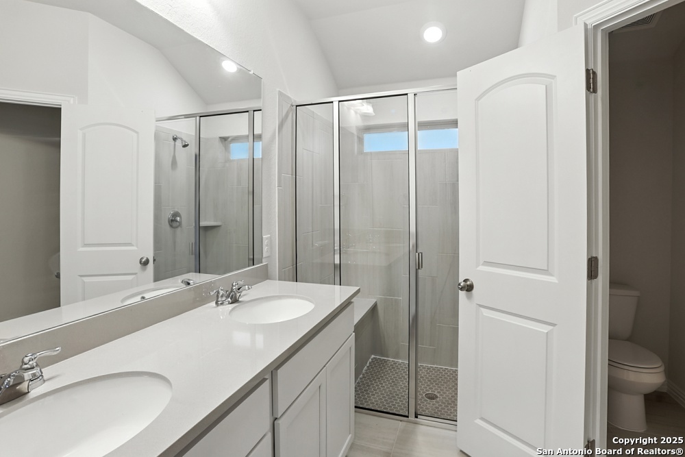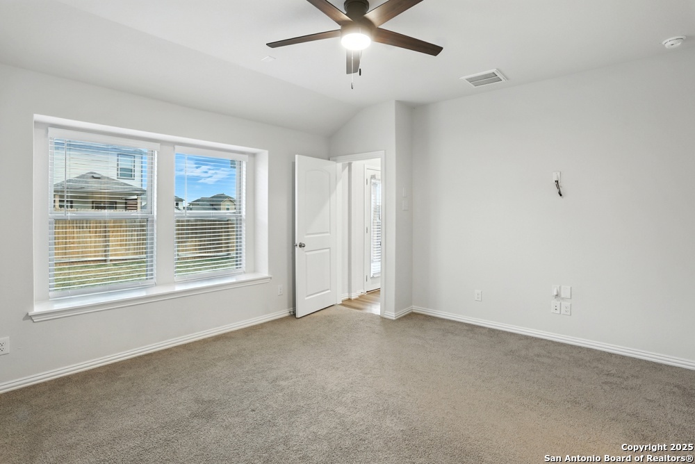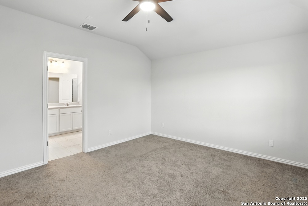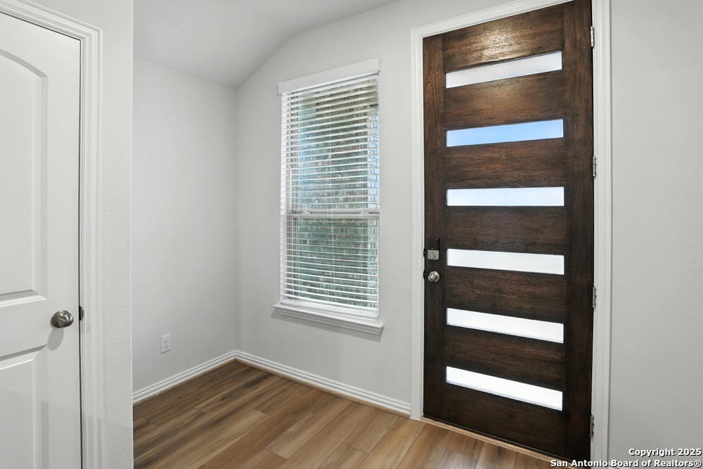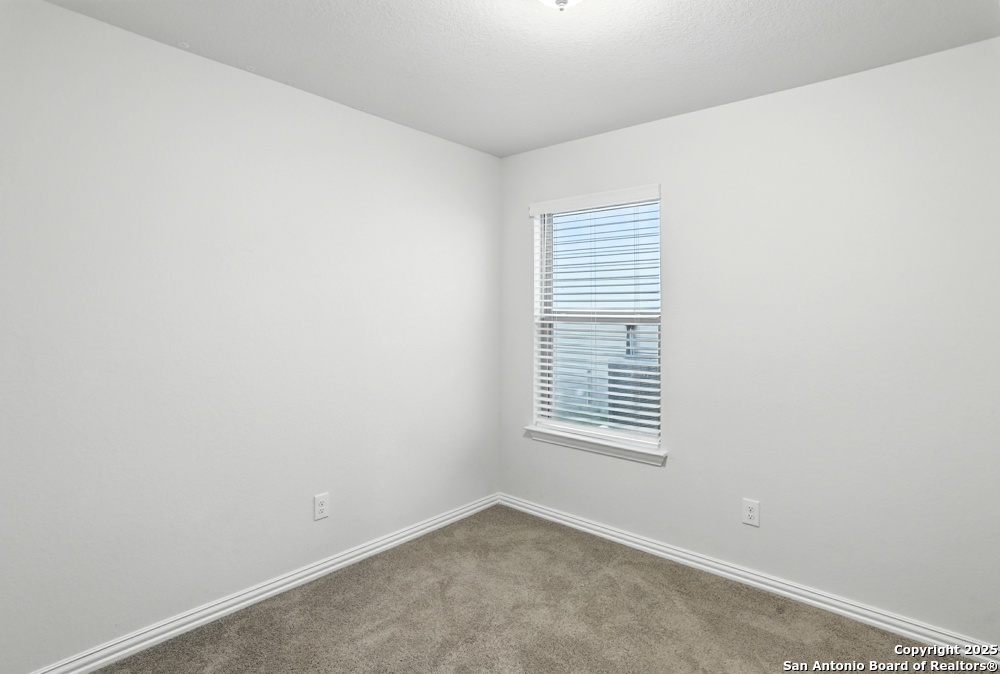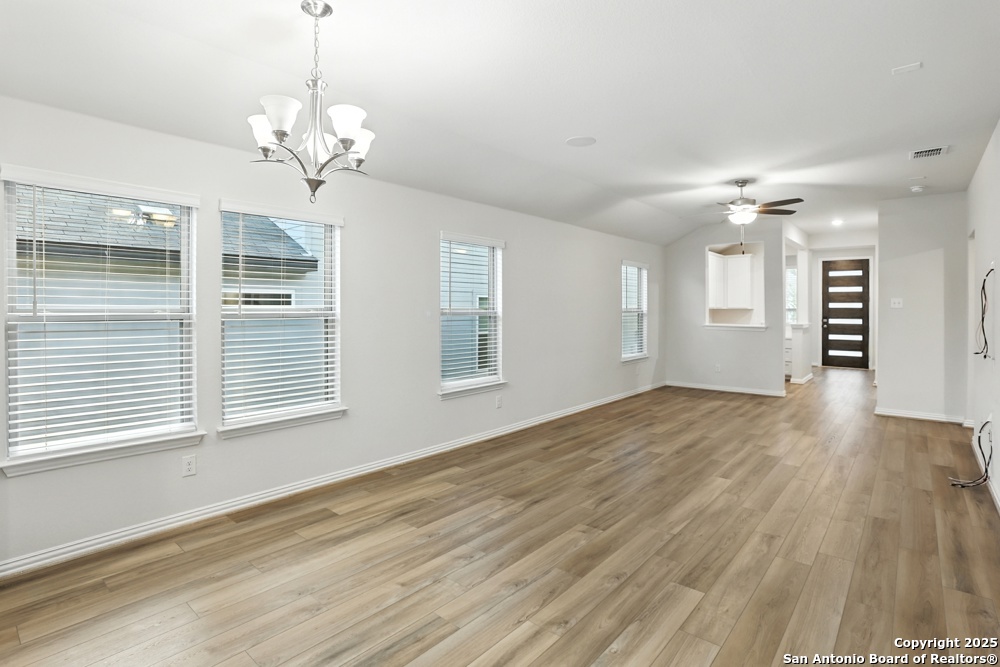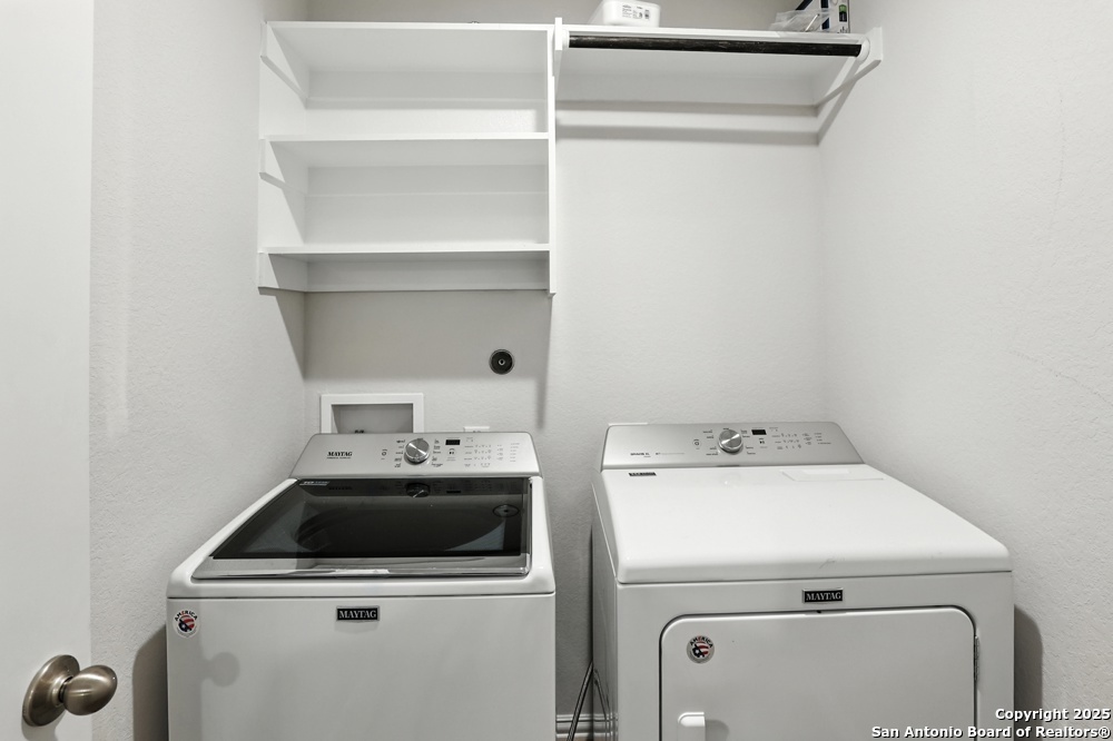 This stunning one-story home in the Veranda Subdivision combines modern style with everyday comfort. The open floor plan includes a versatile bonus room that's perfect for a home office, while the spacious living room boasts luxury laminate flooring, abundant natural light, and built-in surround sound for effortless entertaining. The chef's kitchen is a showstopper with stainless steel appliances, including a gas stove and refrigerator, custom cabinets, quartz countertops, a decorative backsplash, recessed lighting, and a large island that anchors the space. The master suite is a peaceful retreat featuring high ceilings, a ceiling fan, plush carpet, and a generous walk-in closet, while the master bath offers a double vanity and oversized walk-in shower. A washer and dryer add convenience, and the private backyard with a covered patio and privacy fence is perfect for gatherings or quiet evenings. Enjoy community amenities including a pool, clubhouse, and playground, all while being just minutes from major highways, Lackland Air Force Base, SeaWorld, Northwest Vista, shopping, and dining.