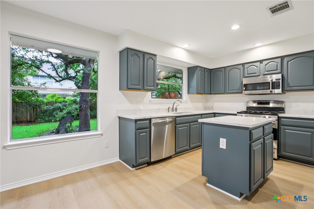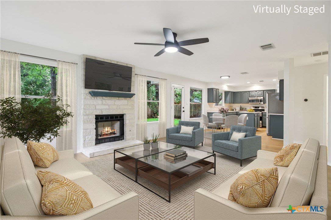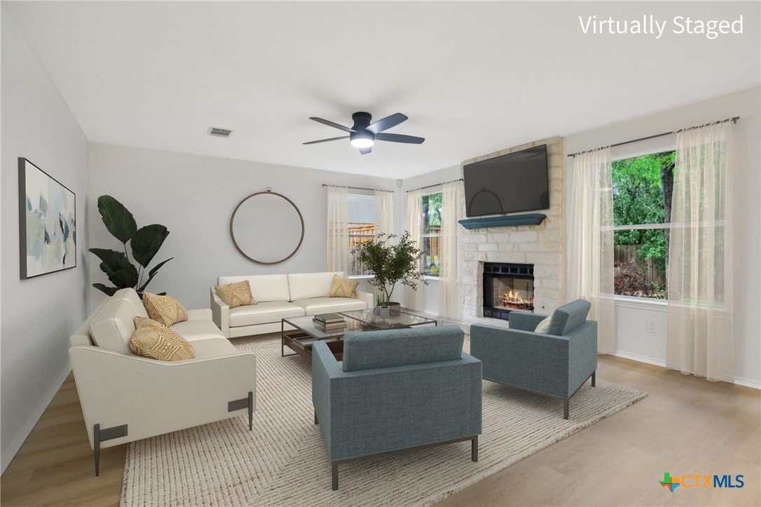 Stylishly updated home in prime NW Austin neighborhood just over a mile from the new Apple campus! Nearly every major feature has been recently updated including the roof, interior and exterior paint, flooring and lighting. Gorgeous quartz countertops in the kitchen and bathrooms along with stunning tile surrounds and flooring in both bathrooms. Popular Texas limestone exterior and matching floor-to-ceiling fireplace in the family room. The layout is perfect for entertaining, with two large living areas off the open kitchen downstairs and an additional spacious living area upstairs. Abundant natural light fills the home through large windows, and all bedrooms are oversized with walk-in closets. Step outside onto the back patio shaded by mature live oaks overlooking the lush, spacious backyard. Enjoy walkable access to two neighborhood parks with amenities including a Jr. Olympic pool (heated in winter), tennis and pickleball courts, basketball, sand volleyball, playgrounds, sports fields, and scenic hike-and-bike trails. The community also hosts fun events throughout the year like egg hunts, crawfish boils, Rattan Fest, and Holiday in the Park! Zoned to highly rated Round Rock ISD schools, including an elementary school right in the neighborhood. Just minutes from Hwy 183, Parmer, SH 45, and 620, this home offers unbeatable convenience near major employers, shopping, dining, and just 10 minutes from The Domain - Austin’s vibrant second downtown.
