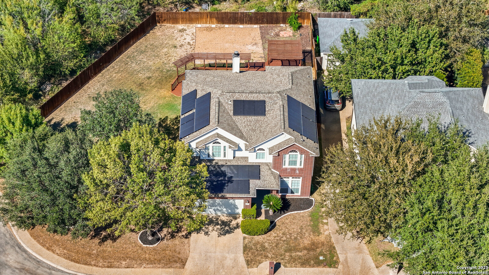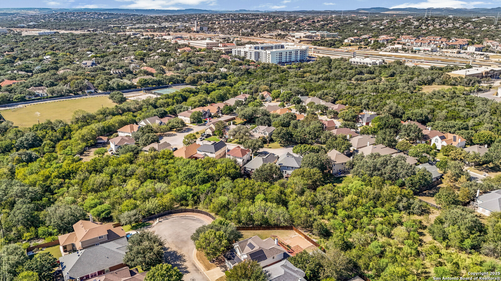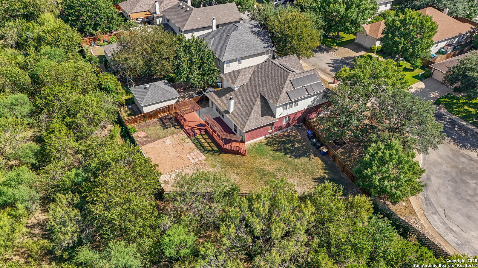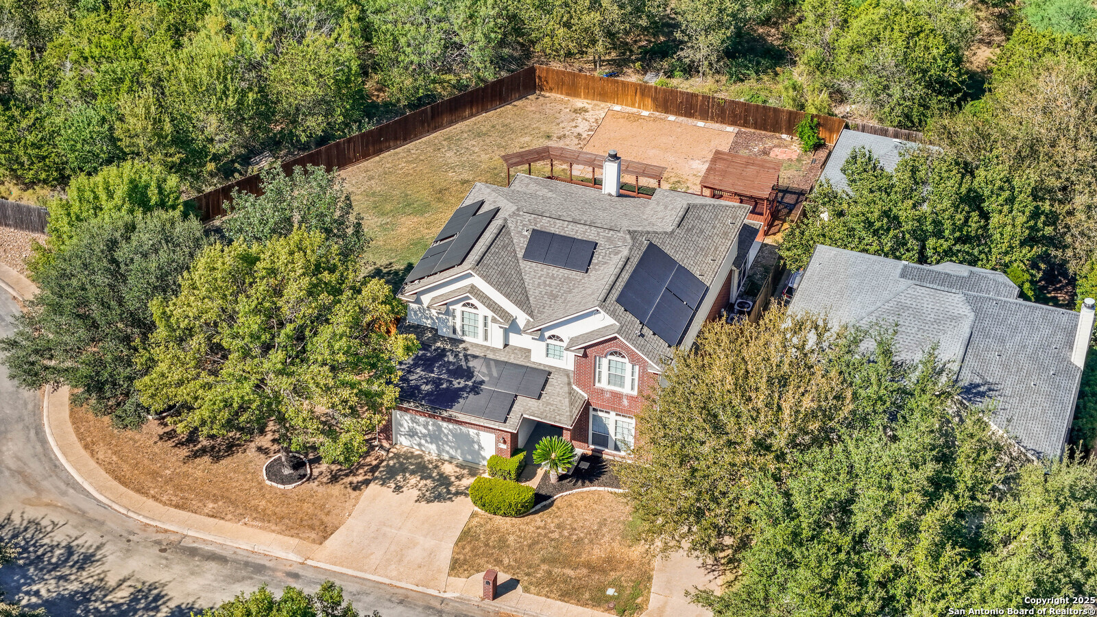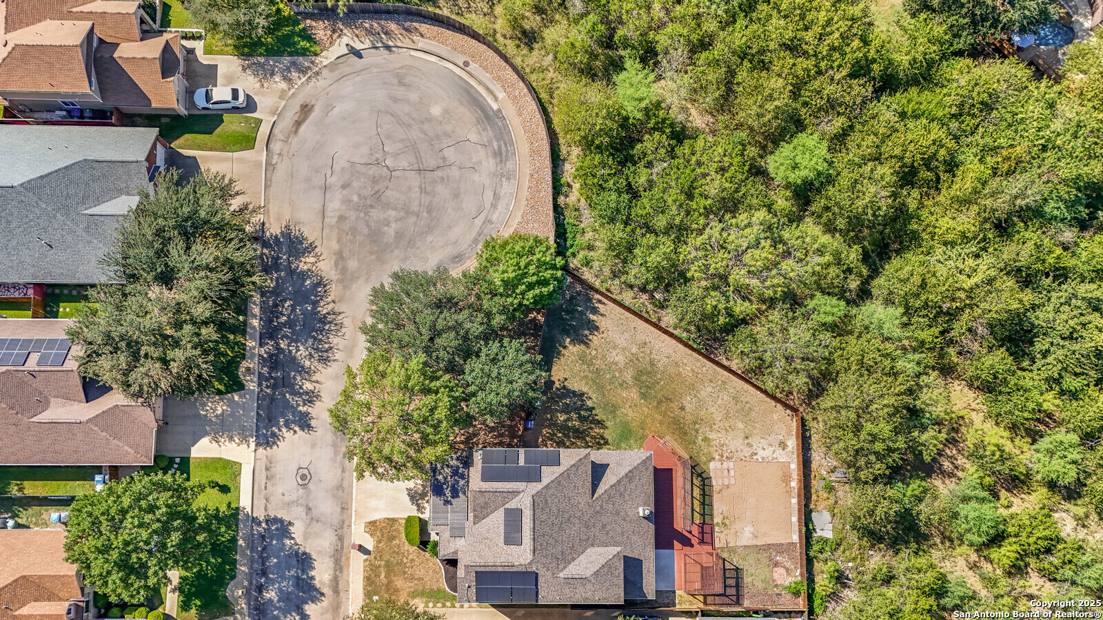 Located in the highly sought-after Blanco Bluffs community, this beautifully maintained 4-bedroom, 2.5-bath home offers an ideal blend of space, style, and privacy. With approximately 3,115 sq ft of living area, this home features multiple gathering spaces including a formal living room, family room, and an upstairs game room-perfect for entertaining or relaxing. Recent cosmetic updates exceeding $25,000 include fresh interior paint, upgraded kitchen cabinetry, and an extended back-patio concrete slab, creating a light and inviting atmosphere throughout. The home sits on a generous 0.27-acre cul-de-sac lot shared with only one other property, providing extra parking and outdoor flexibility. The backyard backs up to a peaceful greenbelt lined with mature trees, offering a private and scenic setting rarely found in this area. Fully paid-off solar panels deliver exceptional energy savings-reducing average utility costs by more than 65%. Enjoy efficiency and long-term value without any additional costs! This is where the magic happens for the new home buyer who loves to keep their home cold at all times without the feeling like you're paying a car payment to do so! Conveniently located near Blanco Road, Loop 1604, and Highway 281, this home offers quick access to shopping, dining, and top North Central ISD schools while maintaining a quiet residential feel. It's literally like living in the country at the VERY BACK of the neighborhood but still being right in the heart of EVERYTHING! PERFECTION OF LOCATION! Don't miss the opportunity to own one of the most private and spacious lots in Blanco Bluffs-schedule your showing today.