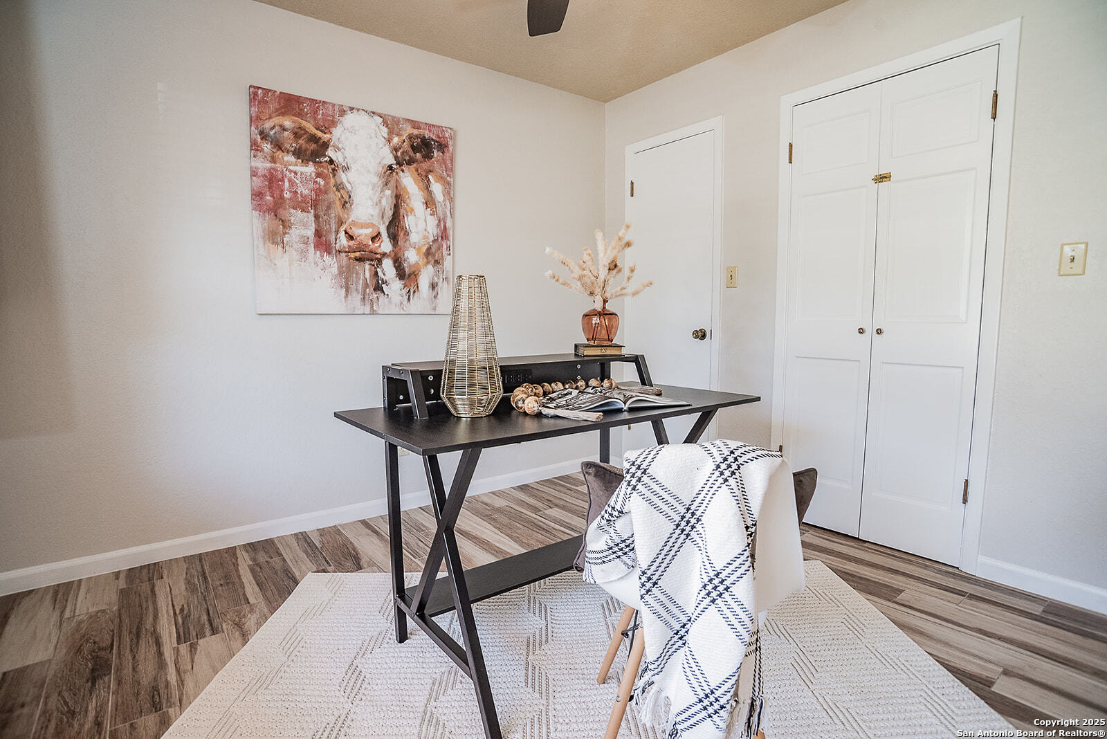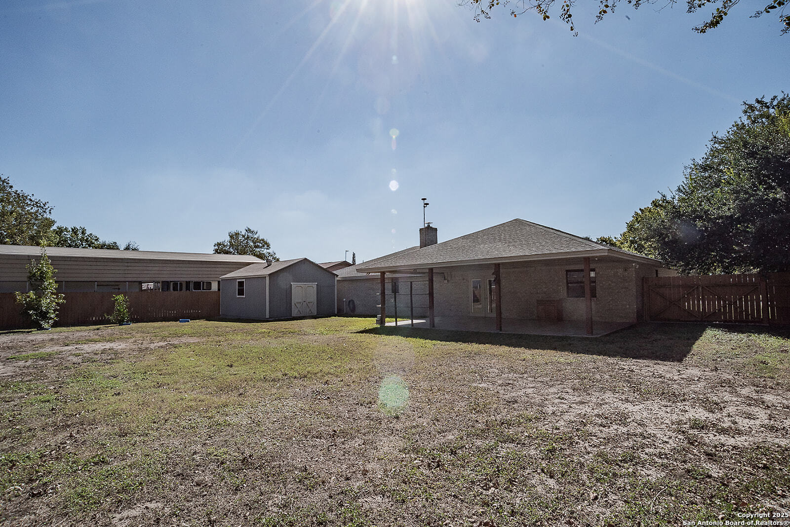 This home is located in a quiet, peaceful neighborhood and is move-in-ready! Freshly painted exterior and interior. The roof and AC system were replaced in 2023. Nice size kitchen has stainless appliances and opens into the large family room. Three oversized bedrooms and a fourth bonus room that could be used as an office or fourth bedroom. WOW, the fully fenced backyard is HUGE and has a large covered patio and two storage sheds!! This house is perfect for all of your family and friends gatherings!