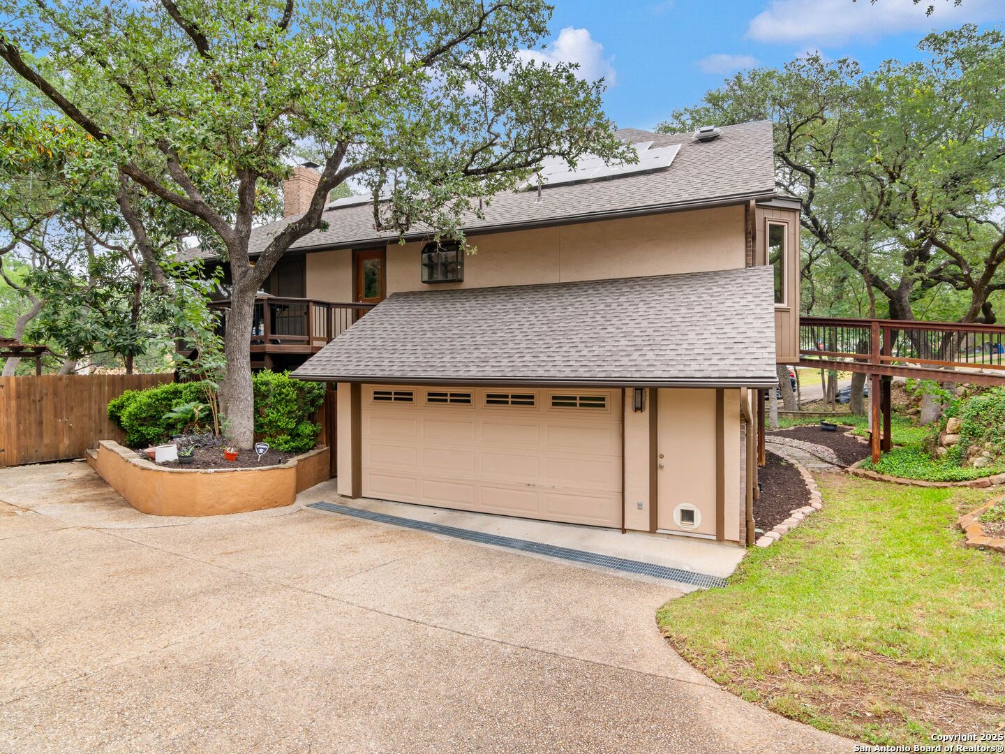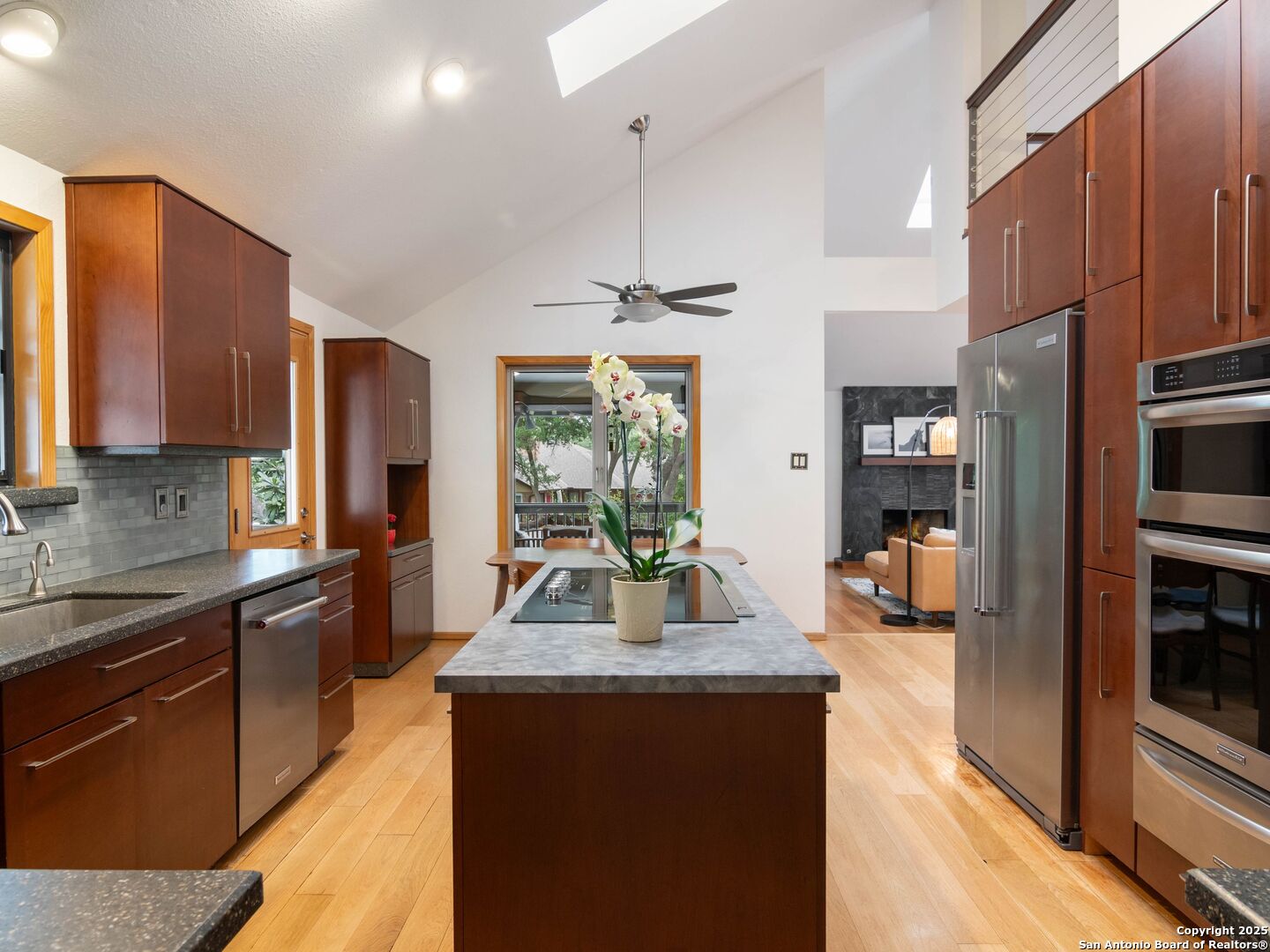 Tucked beneath a canopy of live oaks in sought-after Vista Del Norte, this one-of-a-kind home blends modern design with the peace and privacy of nature. Inspired by Frank Lloyd Wright's contemporary style, the home welcomes you across a private bridge and through a leaded glass door into a space that's truly custom from the inside out. Three stories of glass span the front elevation, flooding the interior with natural light. Open floor plan with vaulted ceilings and skylights in the family room anchored by a custom slate fireplace with gas. Wide-plank wood floors run throughout the main level. The chef's kitchen is built to entertain, with solid cabinetry, stainless KitchenAid appliances (including a warming drawer), a large island, and a walk-in pantry. Dishwasher and stove replaced in 2022. There's a formal dining room, a breakfast area, and French doors that open onto a screened-in porch with a tiled floor-perfect for dining al fresco under the trees. A lofted second living space or home office floats above it all, open on three sides with views of the great room, kitchen, and entry below. On the main level, the spacious primary suite feels like a retreat with a spa-like bathroom featuring a walk-in shower with Hansgrohe rain and body jets, heated floors, a towel warmer, and a teak bench. Cable railings throughout the loft and stairwell add a clean, modern edge. Downstairs, three spacious guest rooms, large utility and mud rooms, and two fully renovated guest bathrooms (2022). Step out to the large backyard, surrounded by mature trees, where the elevated deck and private Jacuzzi spa make every evening feel like a resort getaway. Raised garden beds along the back of the yard. The oversized garage features epoxy floors and plenty of room for additional storage. Don't miss the the flexible workshop space, currently used as a gym, located in the breezeway off the laundry room. This home also includes high-end casement windows, solar panels, a full sprinkler system, water softener with whole-house filtration, and space to park a boat or small RV. Six-year-old roof, upgraded HVAC system. Full interior paint in 2022.