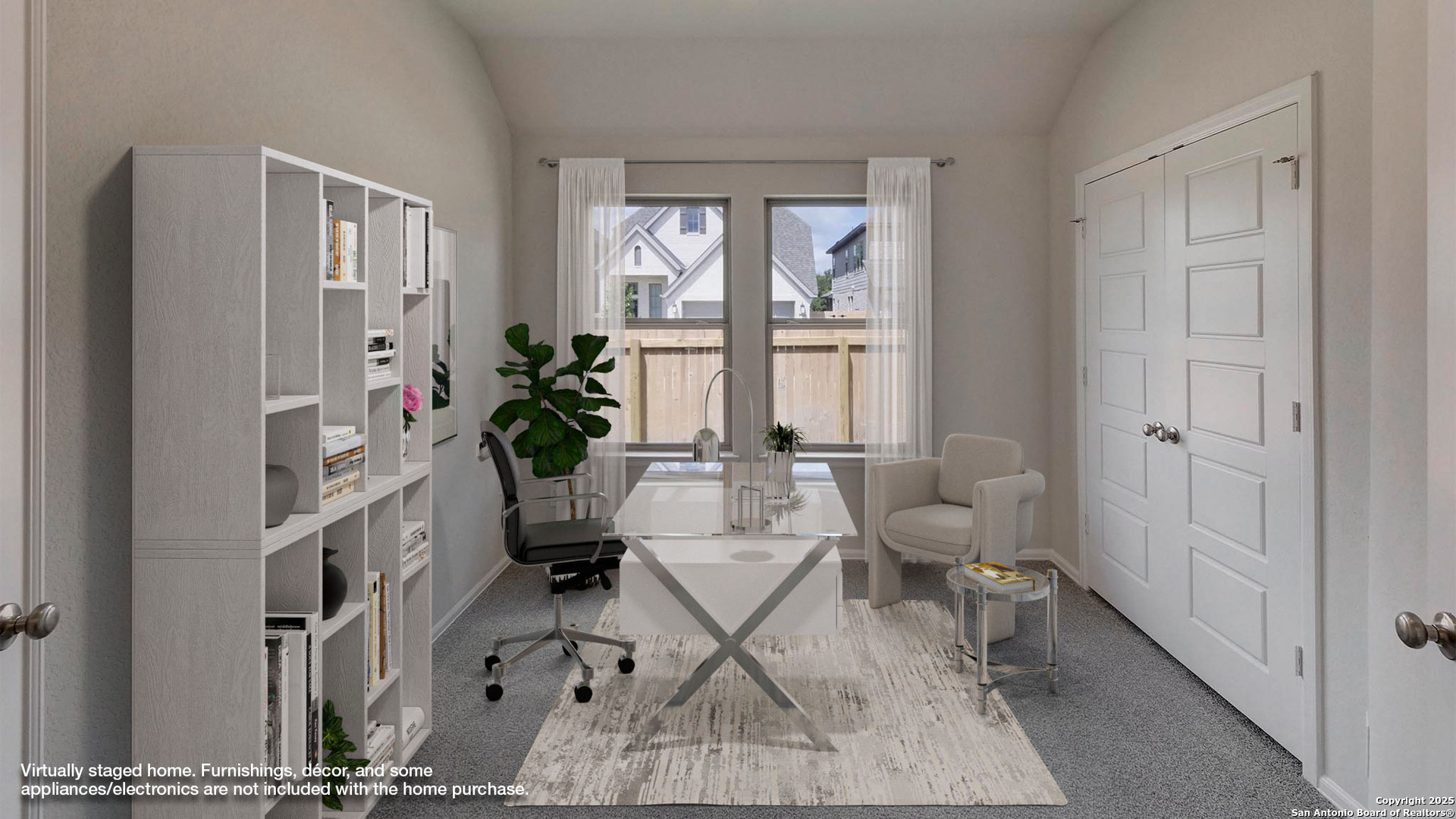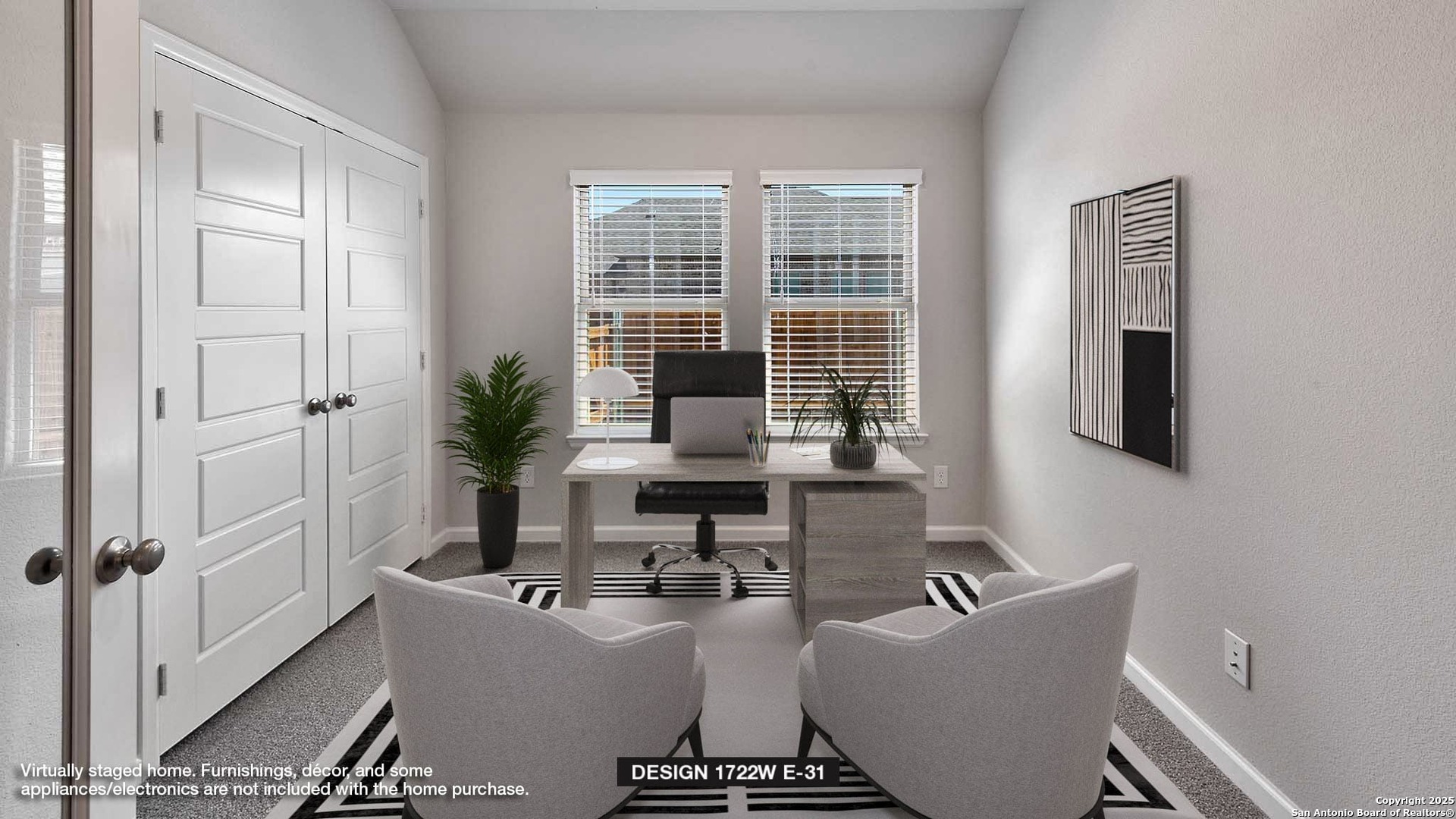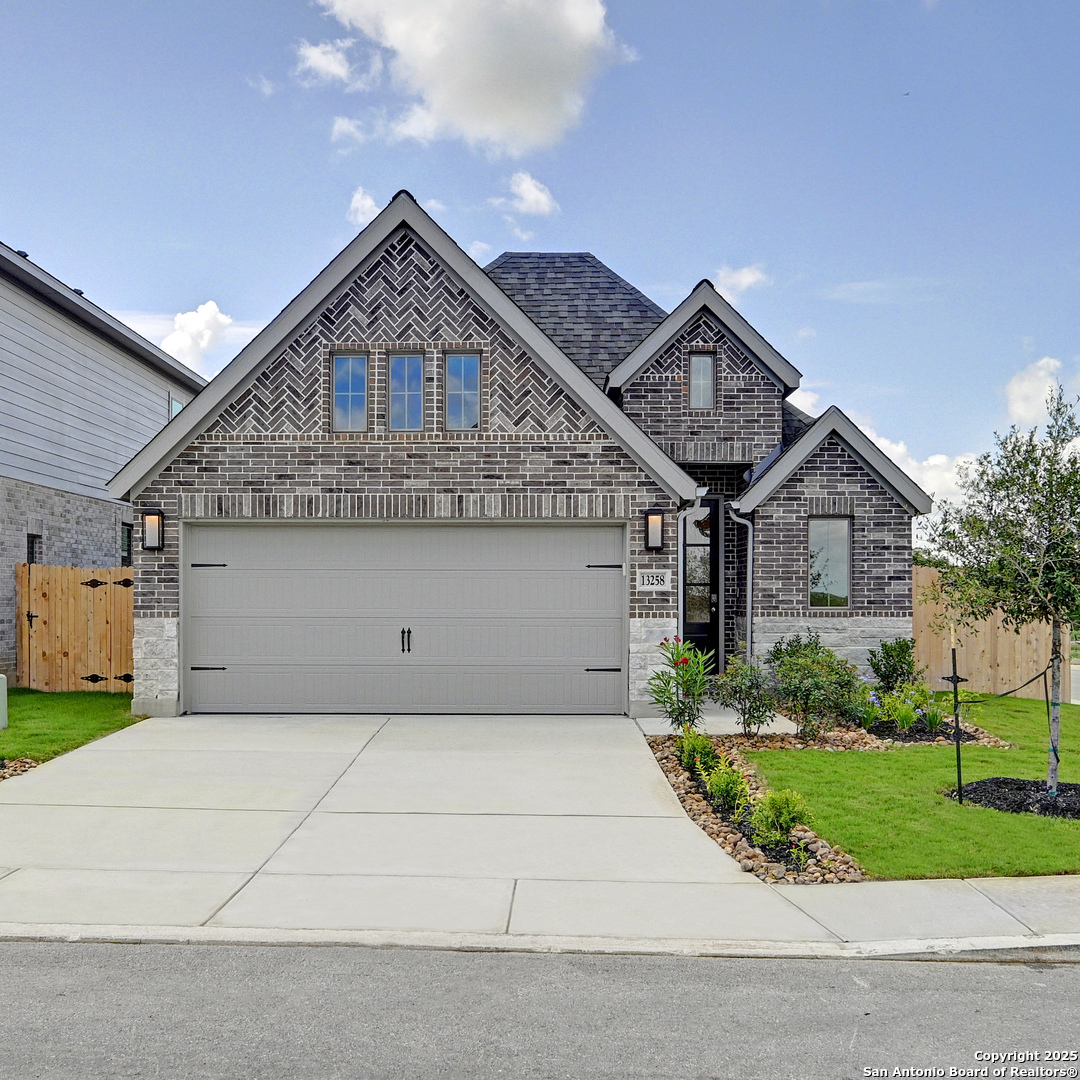Entry leads past utility room and mud room. Home office with French door entry. Large family room with a wood mantel fireplace opens to dining area. Kitchen hosts a corner walk-in pantry and 5-burner gas cooktop. Secluded primary suite. Primary bath features dual vanities, a walk-in closet, linen closet, and a large glass enclosed shower. Secondary bedrooms with walk-in closets. Covered backyard patio and multi-zone sprinkler system. Two-car garage.