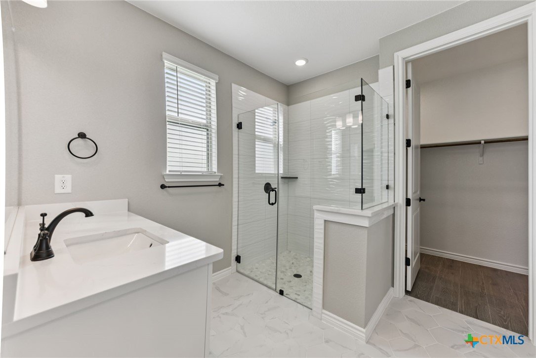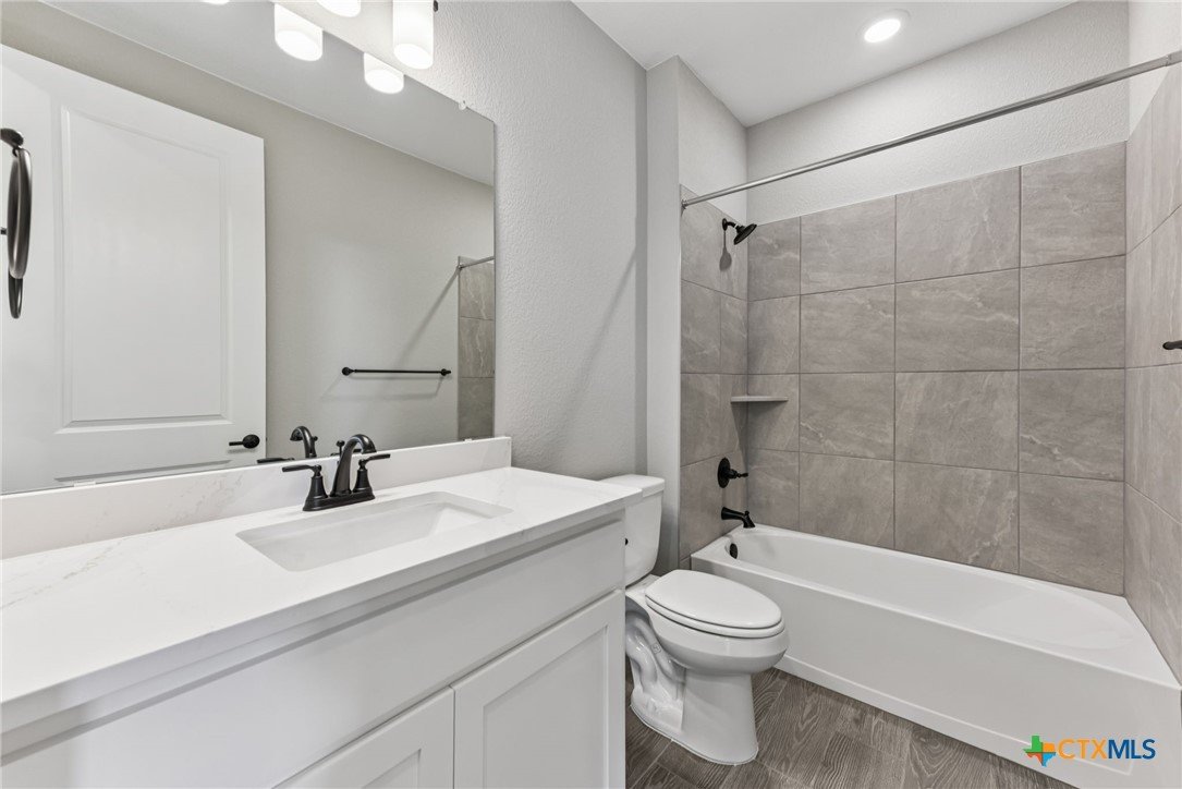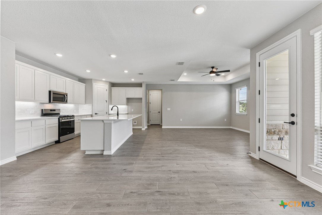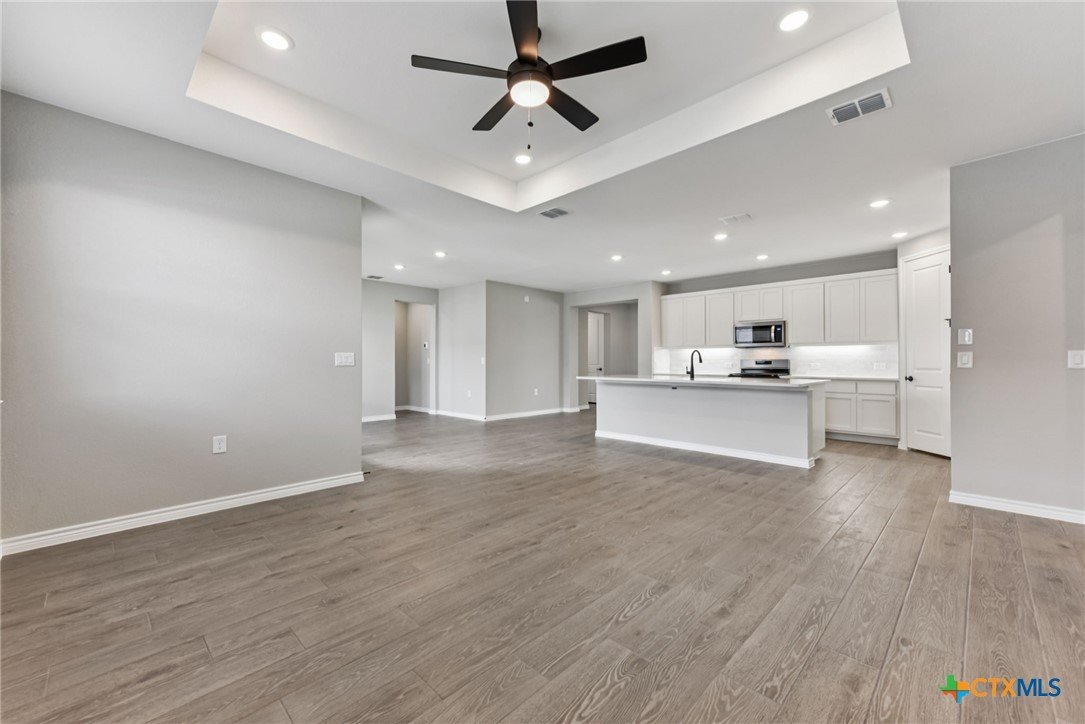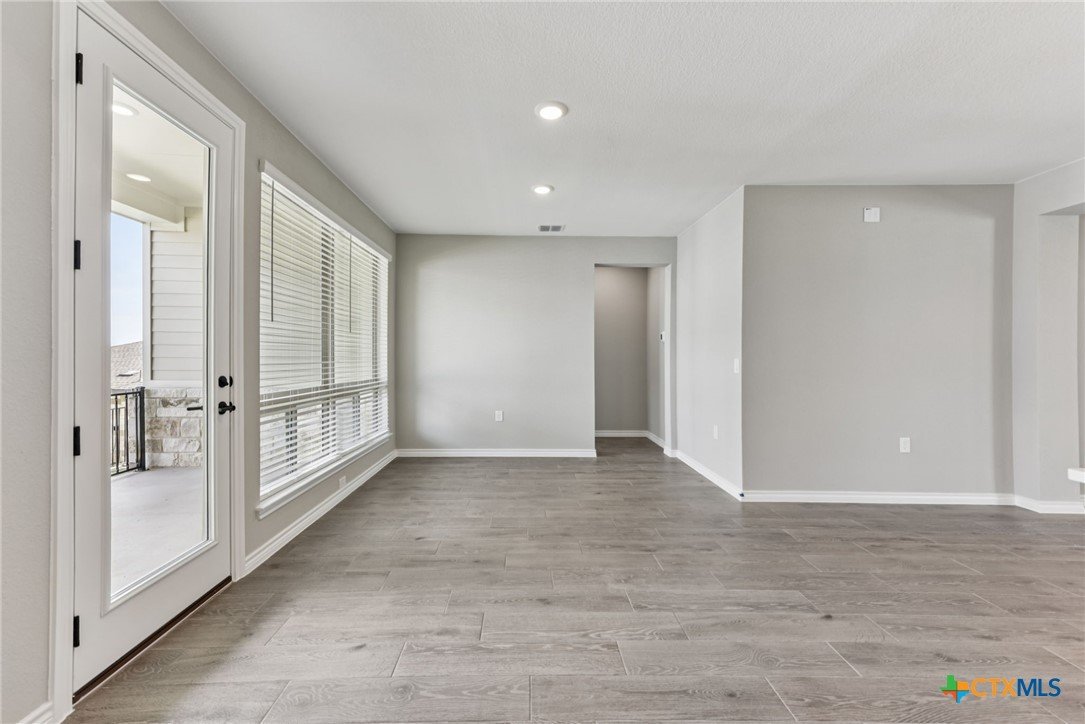 Trevino plan with upgraded PEBBLE flooring, quartz countertops, 8' doors throughout, optional tray ceiling in living, full gutters, Express cordless blinds