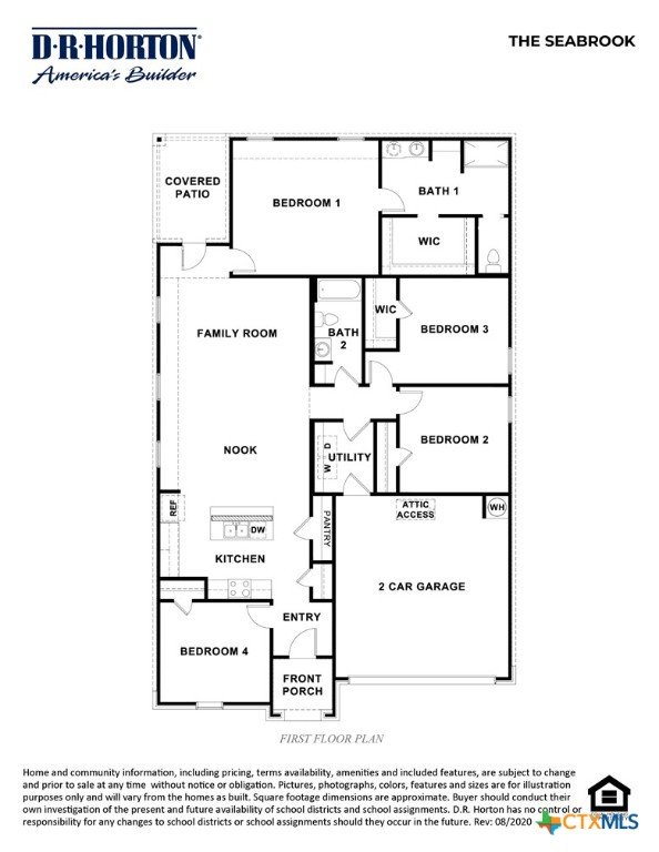 The Seabrook is a single-story, 4-bedroom, 2-bathroom home that features approximately 1,873 square feet of living space. The bright and welcoming foyer flows into the open concept kitchen and dining area. The kitchen includes a breakfast bar and perfect sized pantry. The main bedroom, bedroom 1, features a sloped ceiling and attractive bathroom with dual vanities and spacious walk-in closet. The standard covered patio is located off the breakfast area. Additional finishes include granite countertops and stainless-steel appliances. You’ll enjoy added security in your new D.R. Horton home with our Home is Connected features. Using one central hub that talks to all the devices in your home, you can control the lights, thermostat and locks, all from your cellular device. With D.R. Horton's simple buying process and ten-year limited warranty, there's no reason to wait! (Prices, plans, dimensions, specifications, features, incentives, and availability are subject to change without notice obligation)