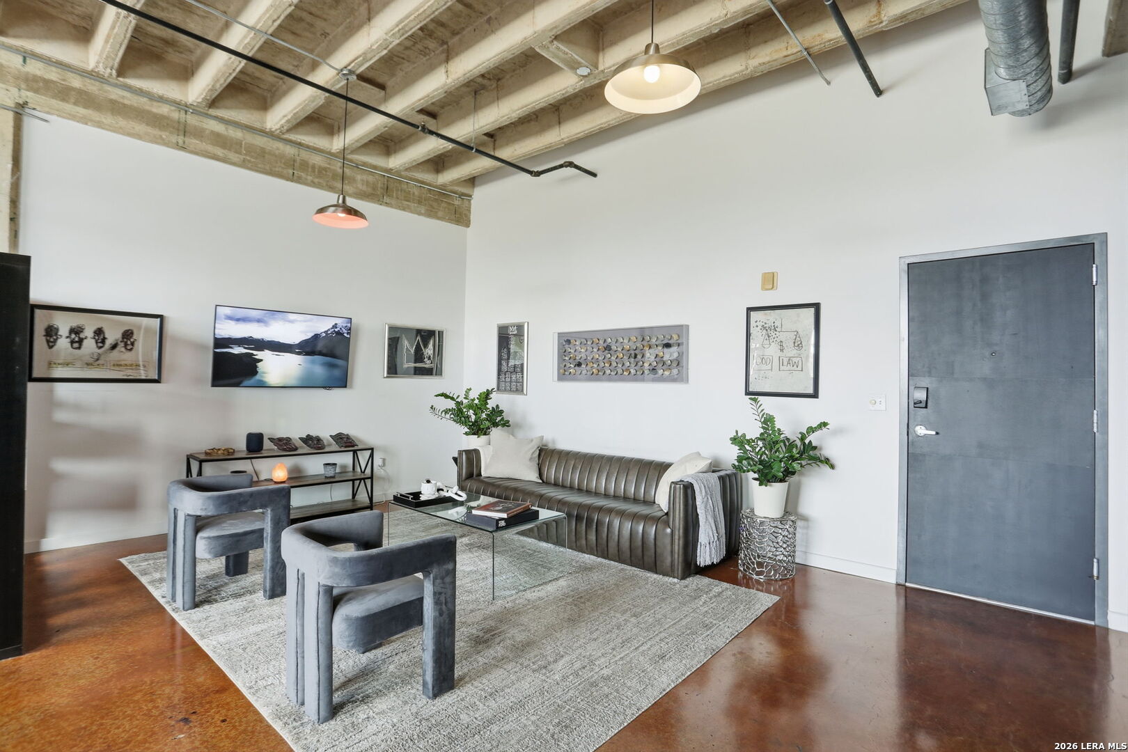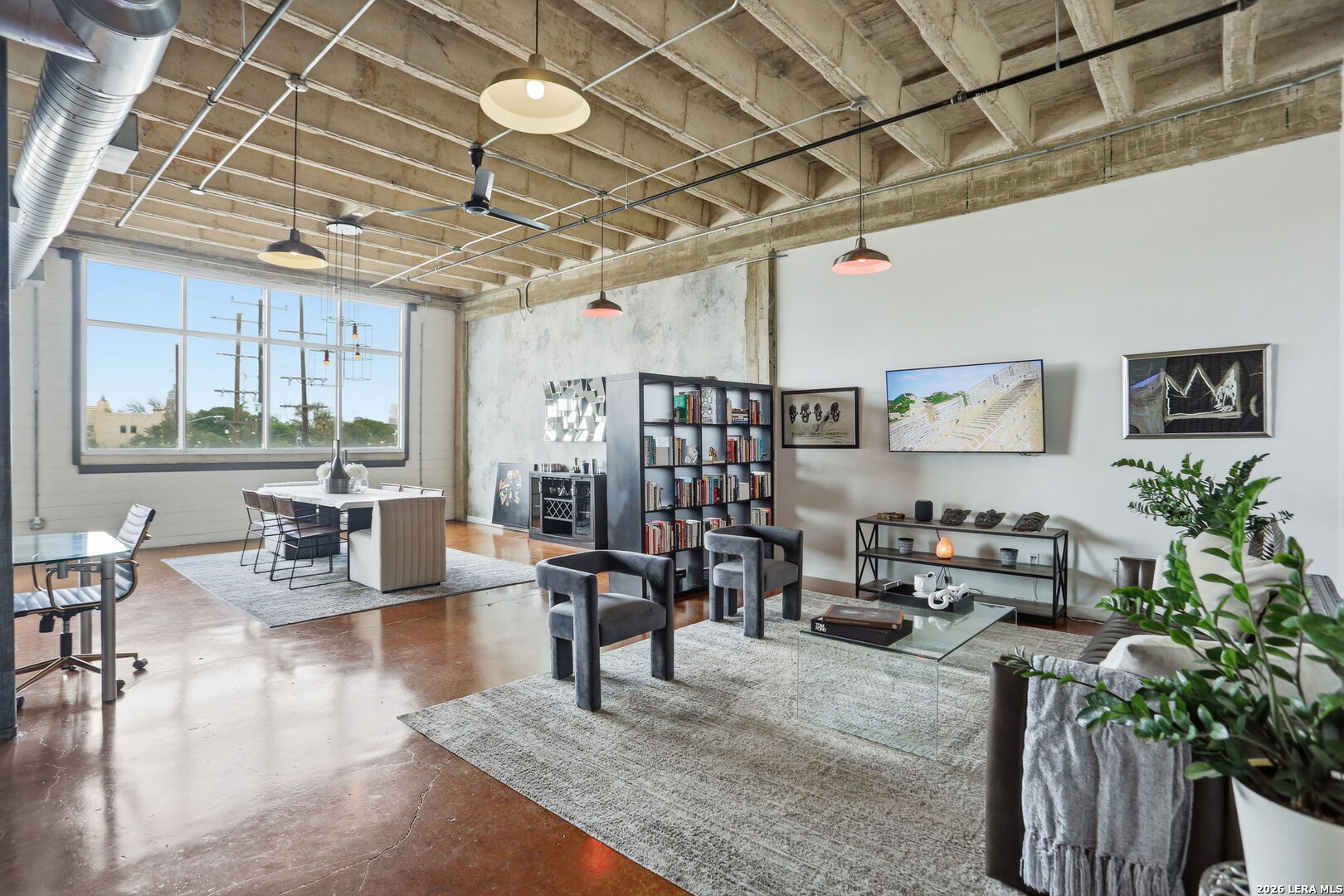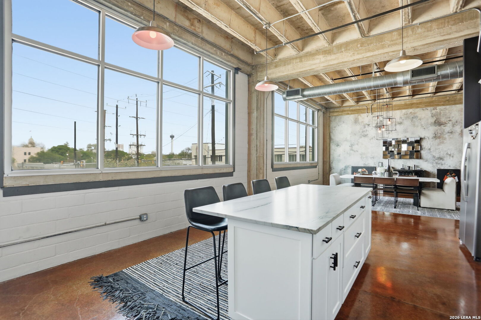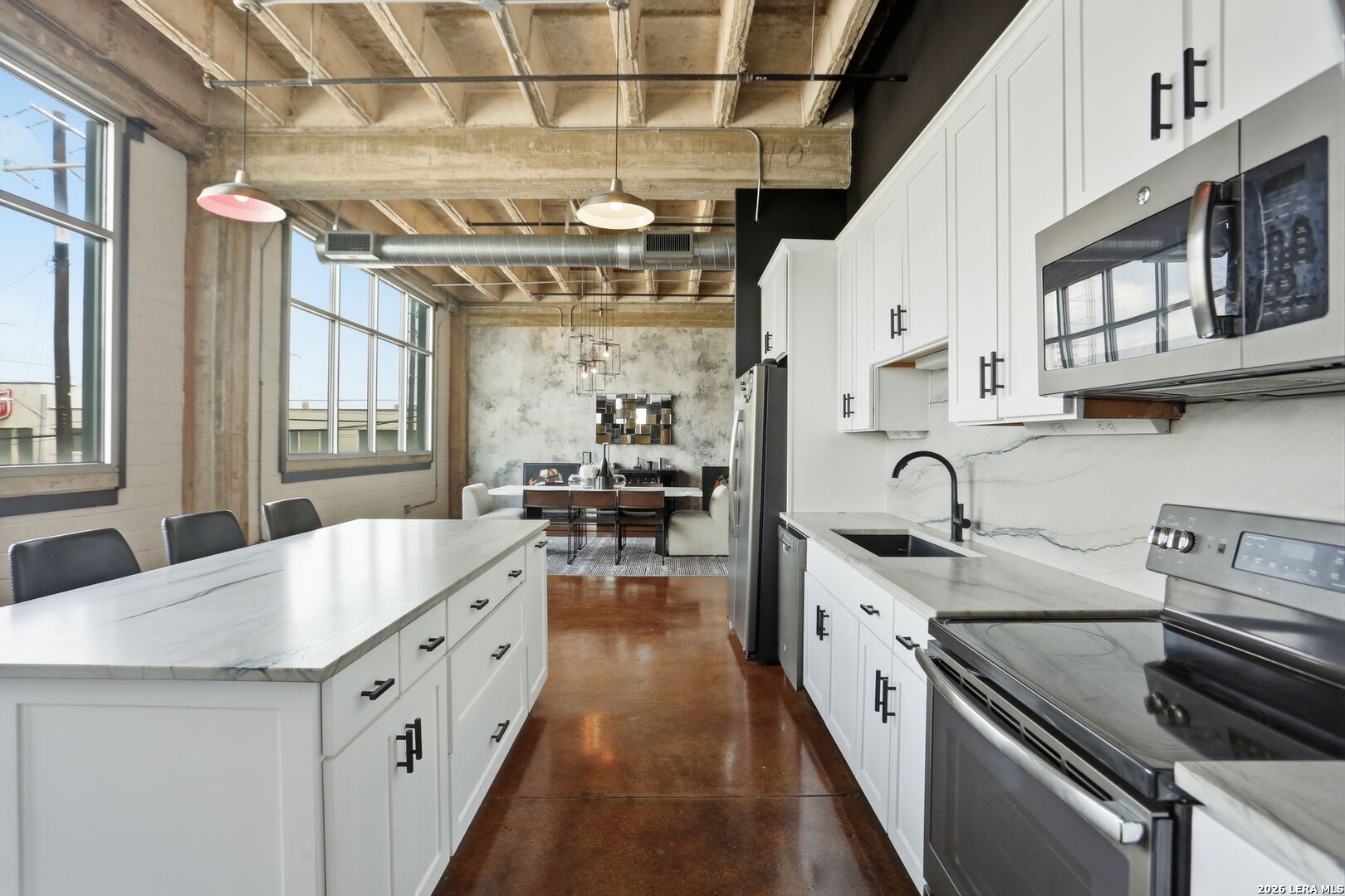 Beautiful condo in South End Lofts featuring an open floor plan, expansive living area, stained concrete floors, and abundant natural light from oversized windows with impressive city views. The kitchen offers custom cabinetry, stainless steel appliances, and an island for added functionality. The private primary bedroom includes a serene en-suite bath. Enjoy excellent amenities and a spacious rooftop patio. Located just three blocks from the Blue Star Arts Complex and Southtown's top restaurants, with easy access to I-10, I-35, and more.