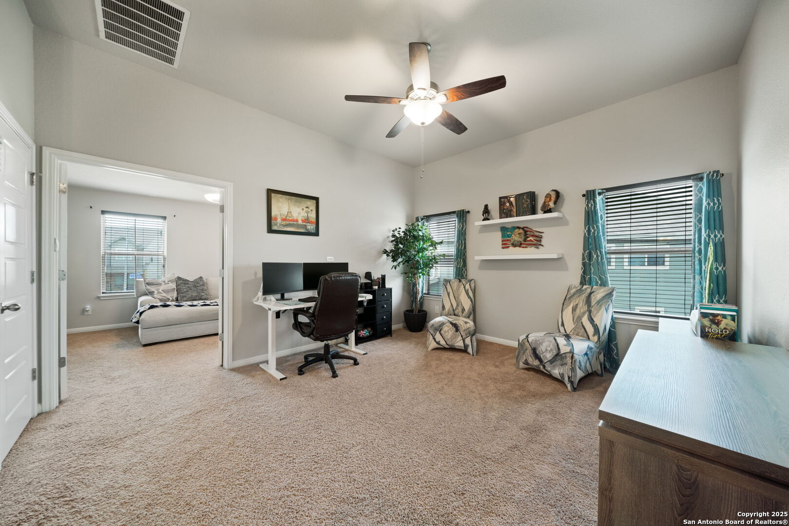 4.75% VA ASSUMABLE LOAN AVAILABLE!!! Welcome to this meticulously maintained 2-story home nestled in the desirable Asher Place neighborhood. Boasting 2,429 square feet of thoughtfully designed living space, this 4-bedroom, 2.5-bathroom residence offers the perfect blend of comfort, style, and functionality. Step inside to discover a bright and airy open-concept layout featuring large windows that flood the home with natural light. The spacious living room is anchored by a cozy fireplace, creating the perfect setting for relaxing or entertaining. Adjacent to the living area is a formal dining room, ideal for hosting dinner parties or family gatherings. The gourmet kitchen is a chef's dream, complete with an abundance of counter space, stainless steel appliances, custom tile backsplash, and a charming breakfast nook. A water softener and security system add to the home's convenience and peace of mind. The luxurious primary suite is located on the main level and offers a tranquil retreat with a beautiful bay window, separate garden tub, separate shower, dual sinks, a dedicated vanity area, and a generous walk-in closet. Upstairs, you'll find three oversized secondary bedrooms, a versatile loft, and a dedicated media room-providing ample space for work, play, or relaxation. Step outside to enjoy the beautifully maintained exterior, featuring a covered patio perfect for outdoor dining, a handy storage shed, full gutter system, and an efficient sprinkler system to keep the yard lush and green. A 2-car garage completes this exceptional home. This beauty is conveniently located near JBSA-Randolph, shopping, restaurants, and major highways. Don't miss your chance to own this incredible property in one of the most desirable communities around. Schedule your private tour today!
