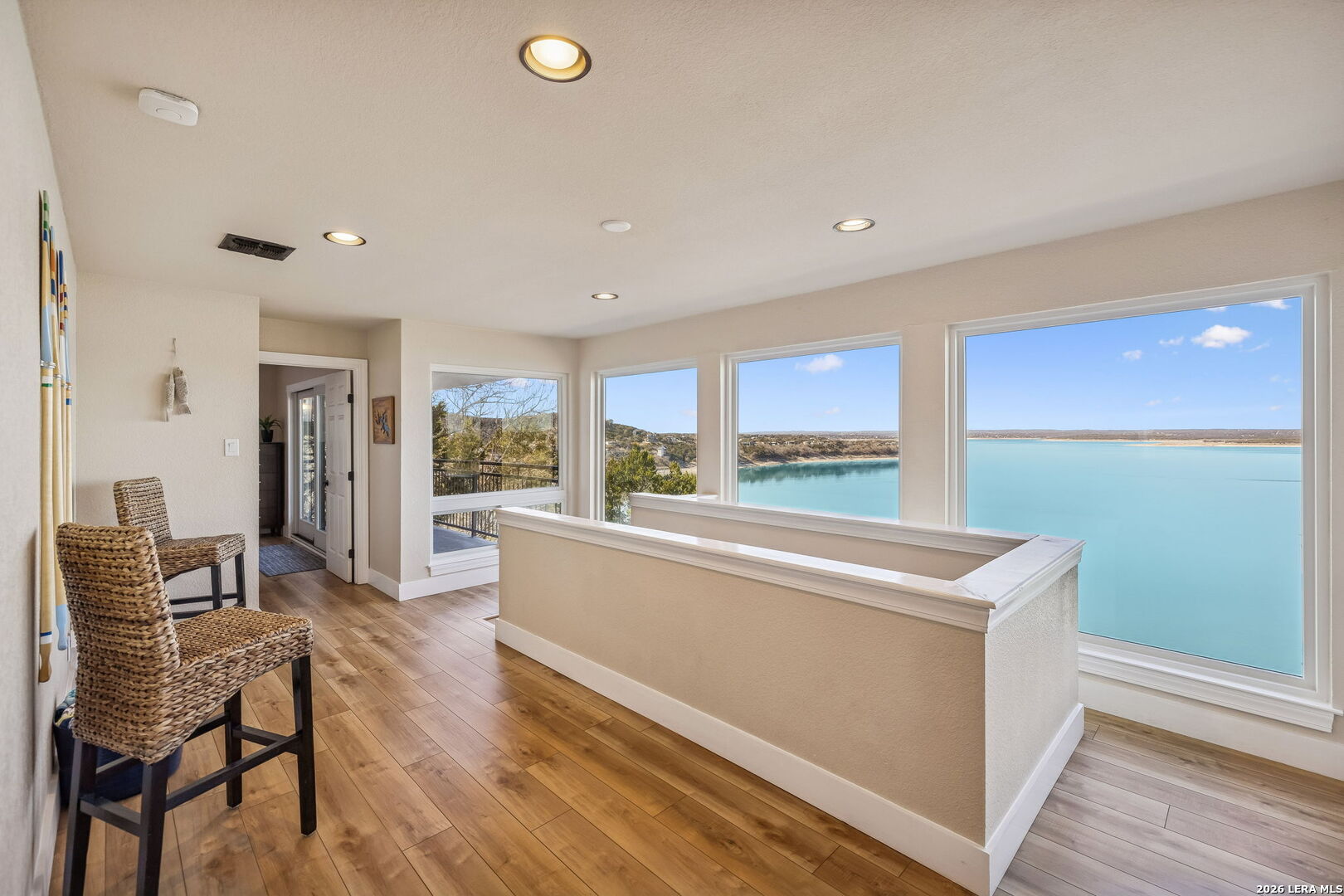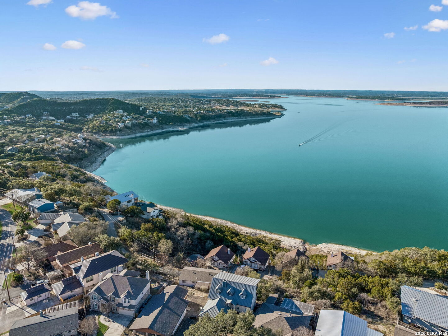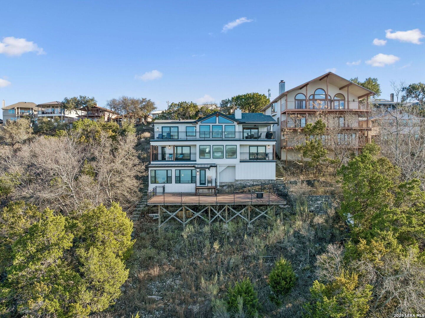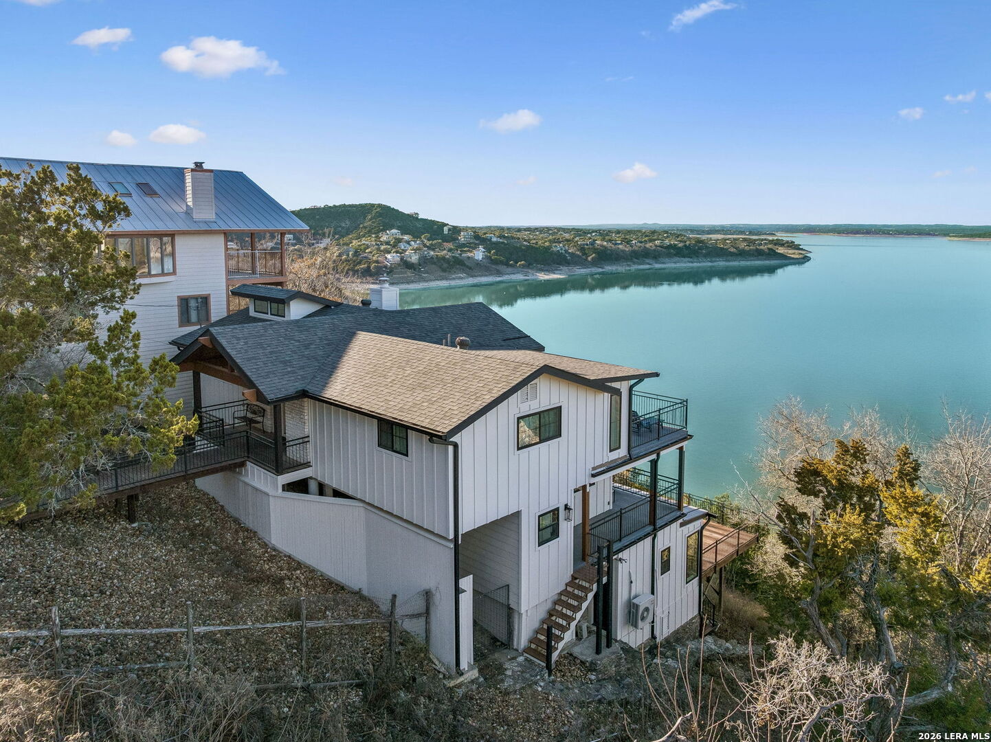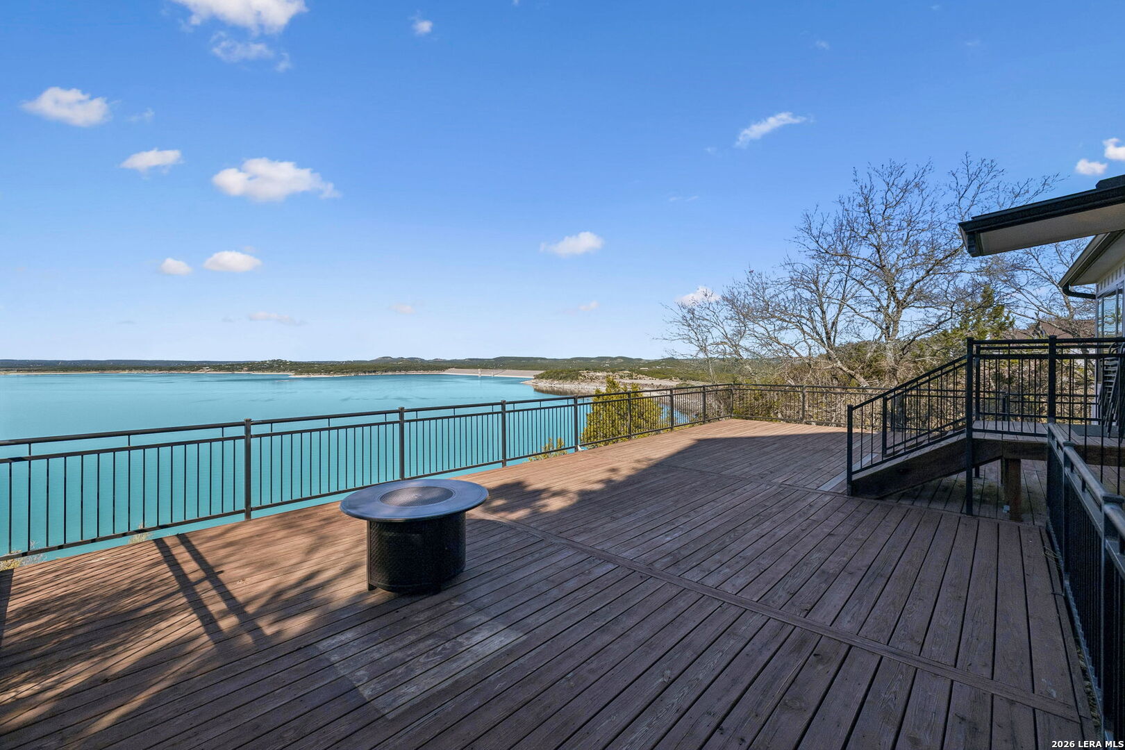 Panoramic Canyon Lake views from one of the most commanding vantage points on the water. This north-facing waterfront home captures sweeping, unobstructed lake vistas-from Canyon Lake Dam across the open main body to Devils Backbone and Twin Sisters Peak. Elevated yet connected to the shoreline, it delivers rare perspective and long-range scenery. Stone steps lead to the water below, while multiple decks create layered outdoor living designed for sunrise coffee and sunset gatherings. Mature trees and frequent wildlife enhance the Hill Country setting. The exterior was updated in 2023 with Hardie siding, new doors, windows, and gutters, plus a 2021 roof and two zoned Trane HVAC systems with smart thermostats for efficiency and comfort. Inside, expansive Anderson windows frame the lake from nearly every room. Vaulted beamed ceilings, tongue-and-groove detail, and a stone wood-burning fireplace anchor the living space with direct deck access. The kitchen features a 9-foot quartz island, custom cabinetry, wine fridge, built-in cooktop, and seamless access to a covered dining deck overlooking Canyon Lake. The main-level owner's suite offers private deck access, dual closets, and a jetted soaking tub with lake views. Secondary bedrooms each enjoy private lakeview balconies, and the bunk-level retreat includes its own living area with access to the expansive deck. STR-friendly and minutes from Canyon Lake Dam, this is elevated waterfront living with unmatched panoramic views.