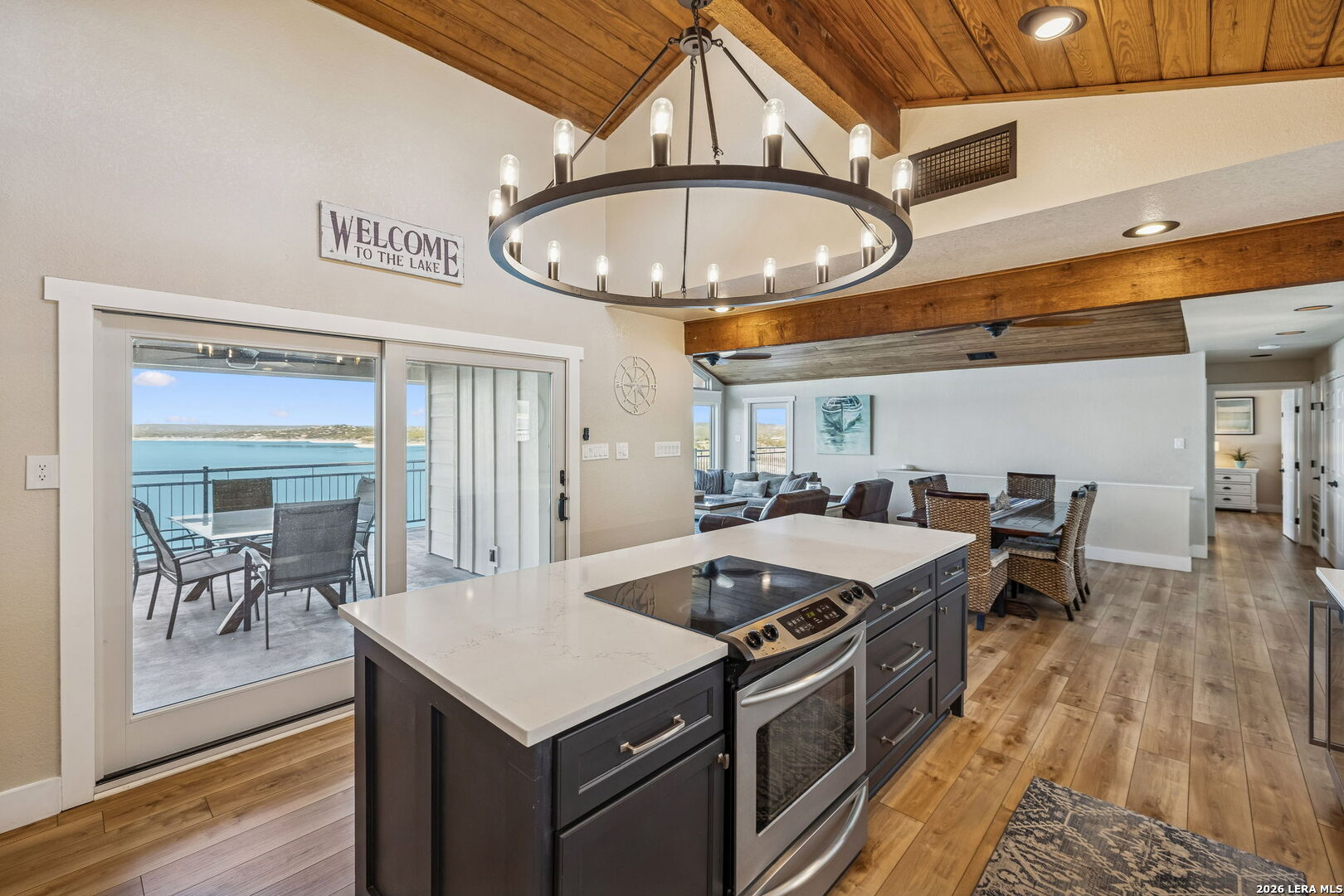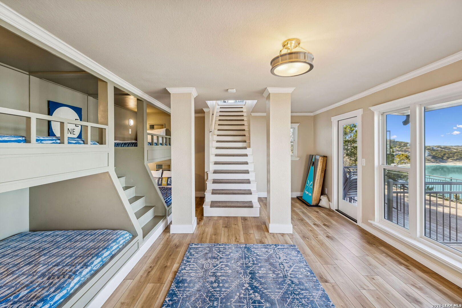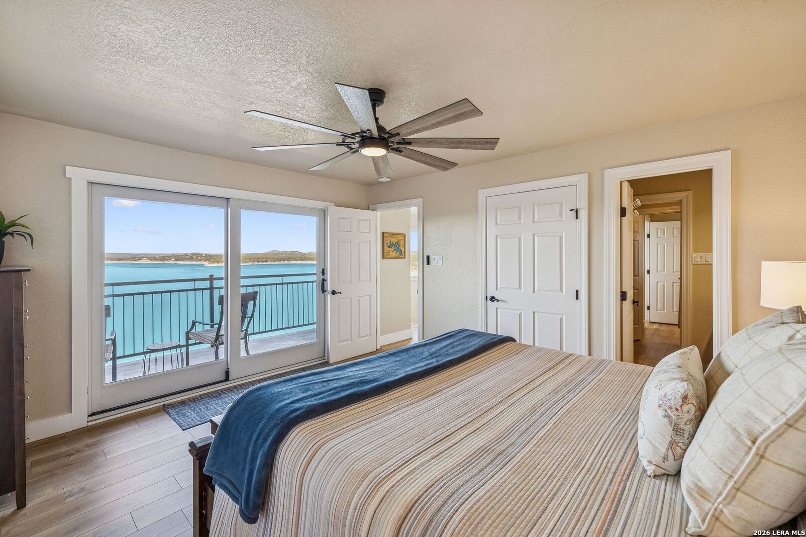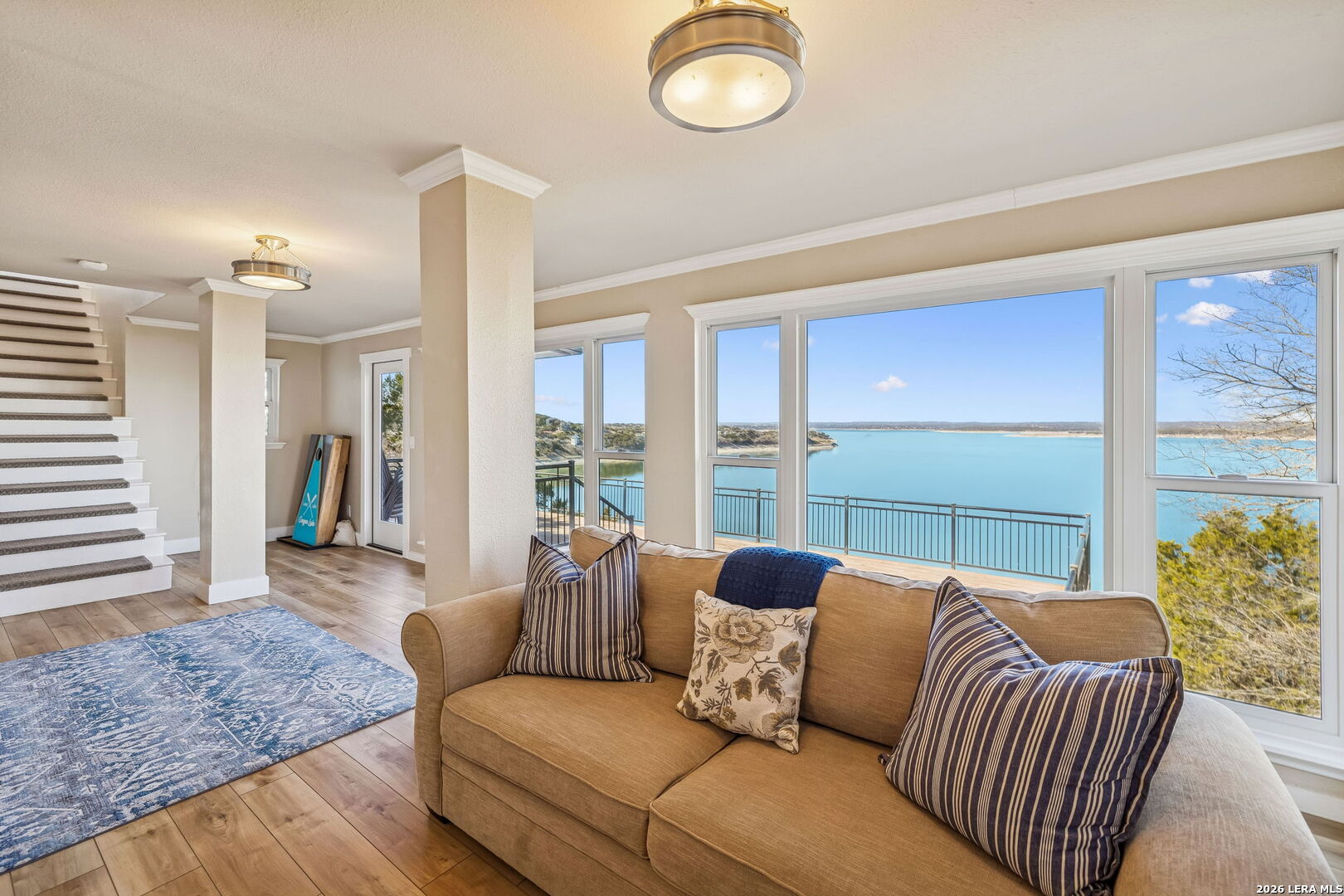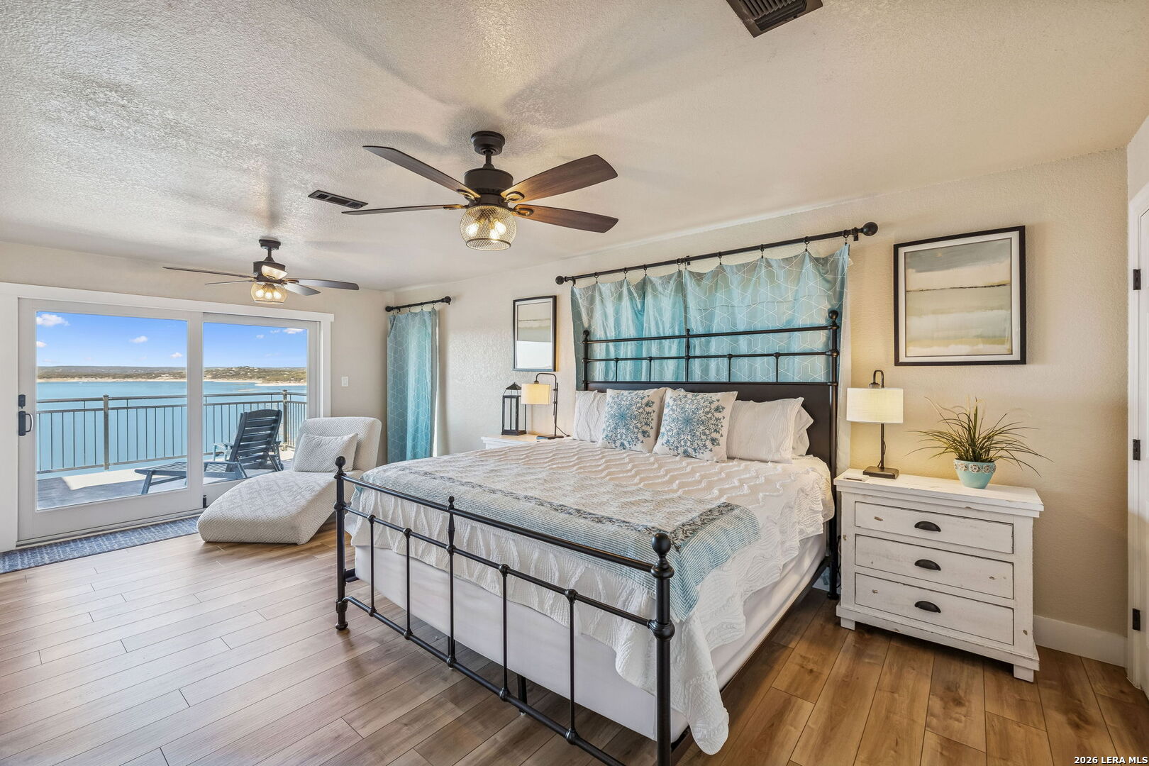 Panoramic Canyon Lake views from one of the most commanding vantage points on the water. This north-facing waterfront home captures sweeping, unobstructed lake vistas-from Canyon Lake Dam across the open main body to Devils Backbone and Twin Sisters Peak. Elevated yet connected to the shoreline, it delivers rare perspective and long-range scenery. Stone steps lead to the water below, while multiple decks create layered outdoor living designed for sunrise coffee and sunset gatherings. Mature trees and frequent wildlife enhance the Hill Country setting. The exterior was updated in 2023 with Hardie siding, new doors, windows, and gutters, plus a 2021 roof and two zoned Trane HVAC systems with smart thermostats for efficiency and comfort. Inside, expansive Anderson windows frame the lake from nearly every room. Vaulted beamed ceilings, tongue-and-groove detail, and a stone wood-burning fireplace anchor the living space with direct deck access. The kitchen features a 9-foot quartz island, custom cabinetry, wine fridge, built-in cooktop, and seamless access to a covered dining deck overlooking Canyon Lake. The main-level owner's suite offers private deck access, dual closets, and a jetted soaking tub with lake views. Secondary bedrooms each enjoy private lakeview balconies, and the bunk-level retreat includes its own living area with access to the expansive deck. STR-friendly and minutes from Canyon Lake Dam, this is elevated waterfront living with unmatched panoramic views.