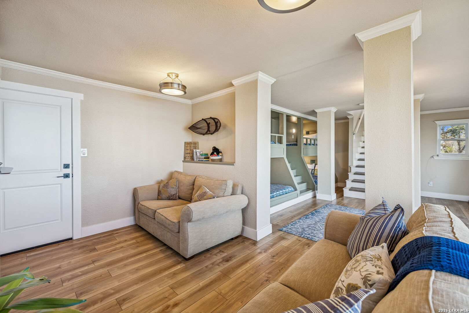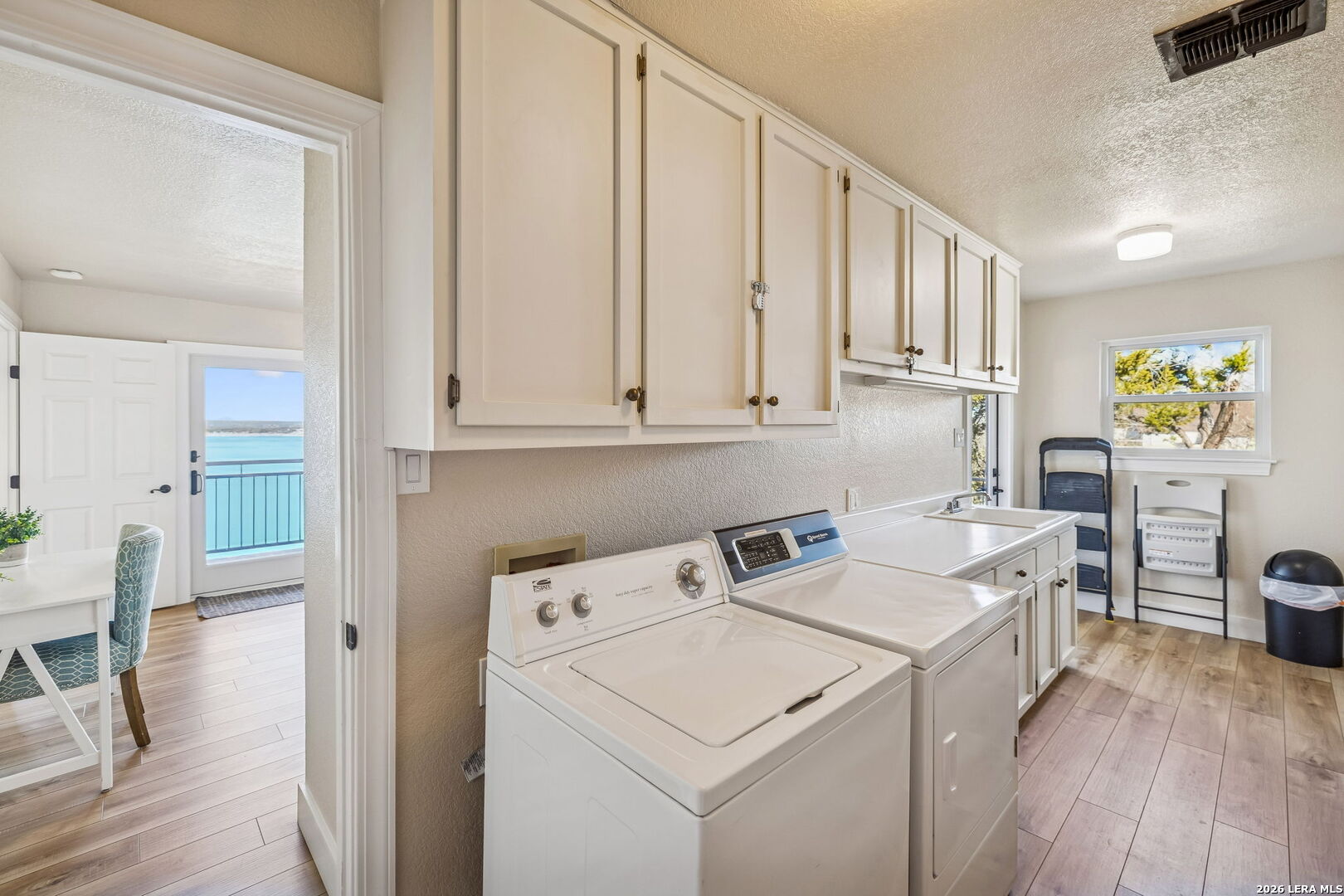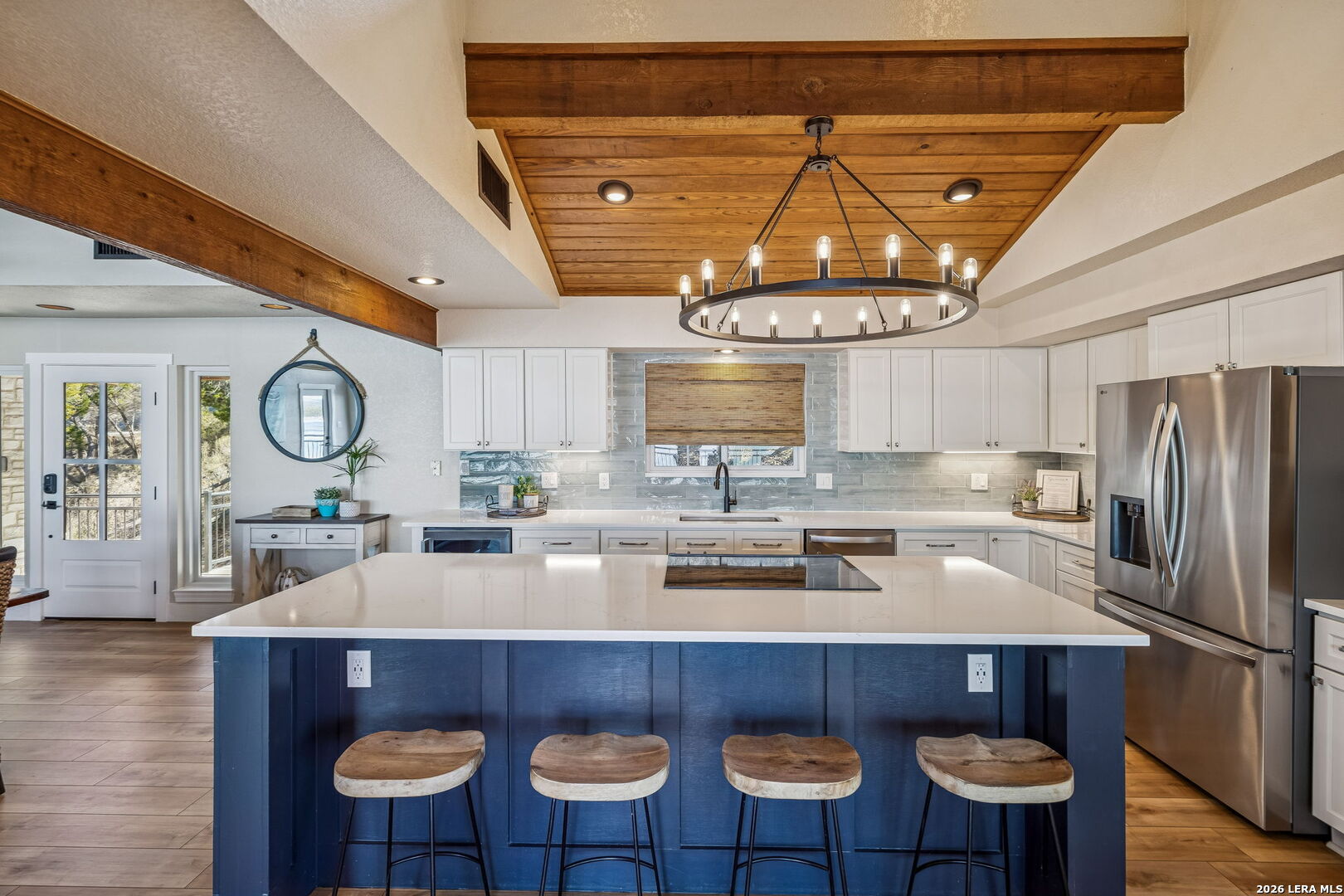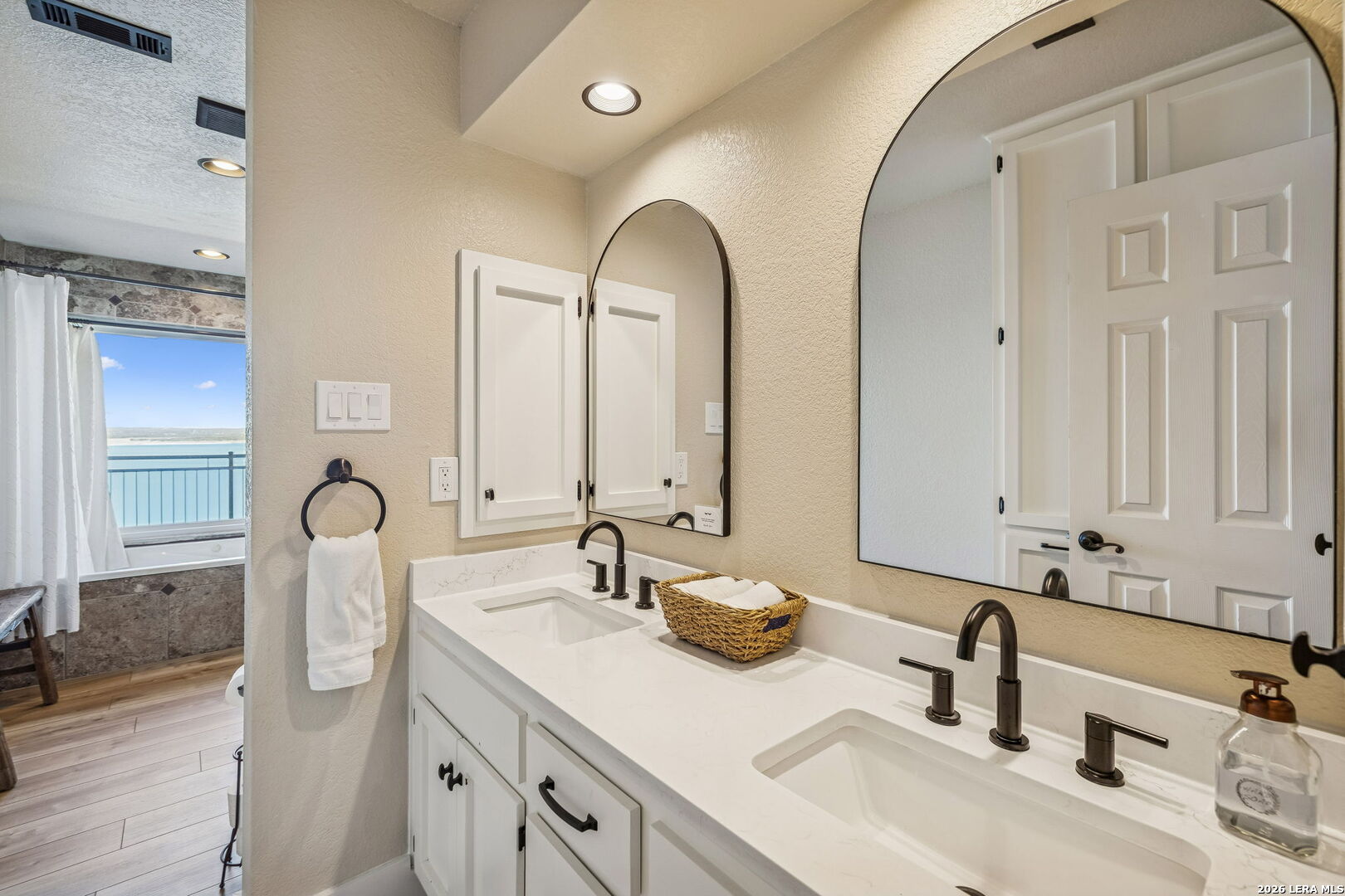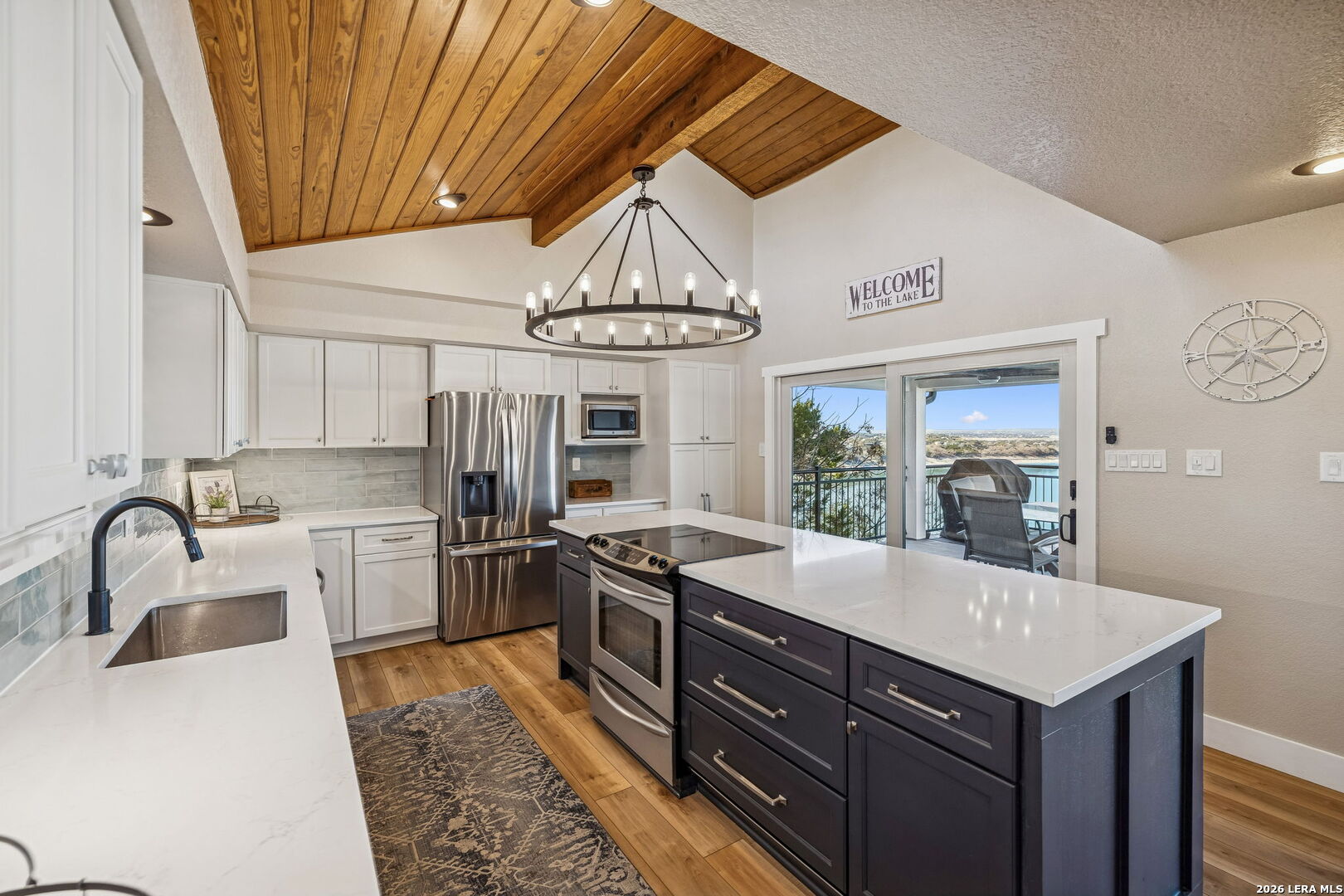 Panoramic Canyon Lake views from one of the most commanding vantage points on the water. This north-facing waterfront home captures sweeping, unobstructed lake vistas-from Canyon Lake Dam across the open main body to Devils Backbone and Twin Sisters Peak. Elevated yet connected to the shoreline, it delivers rare perspective and long-range scenery. Stone steps lead to the water below, while multiple decks create layered outdoor living designed for sunrise coffee and sunset gatherings. Mature trees and frequent wildlife enhance the Hill Country setting. The exterior was updated in 2023 with Hardie siding, new doors, windows, and gutters, plus a 2021 roof and two zoned Trane HVAC systems with smart thermostats for efficiency and comfort. Inside, expansive Anderson windows frame the lake from nearly every room. Vaulted beamed ceilings, tongue-and-groove detail, and a stone wood-burning fireplace anchor the living space with direct deck access. The kitchen features a 9-foot quartz island, custom cabinetry, wine fridge, built-in cooktop, and seamless access to a covered dining deck overlooking Canyon Lake. The main-level owner's suite offers private deck access, dual closets, and a jetted soaking tub with lake views. Secondary bedrooms each enjoy private lakeview balconies, and the bunk-level retreat includes its own living area with access to the expansive deck. STR-friendly and minutes from Canyon Lake Dam, this is elevated waterfront living with unmatched panoramic views.