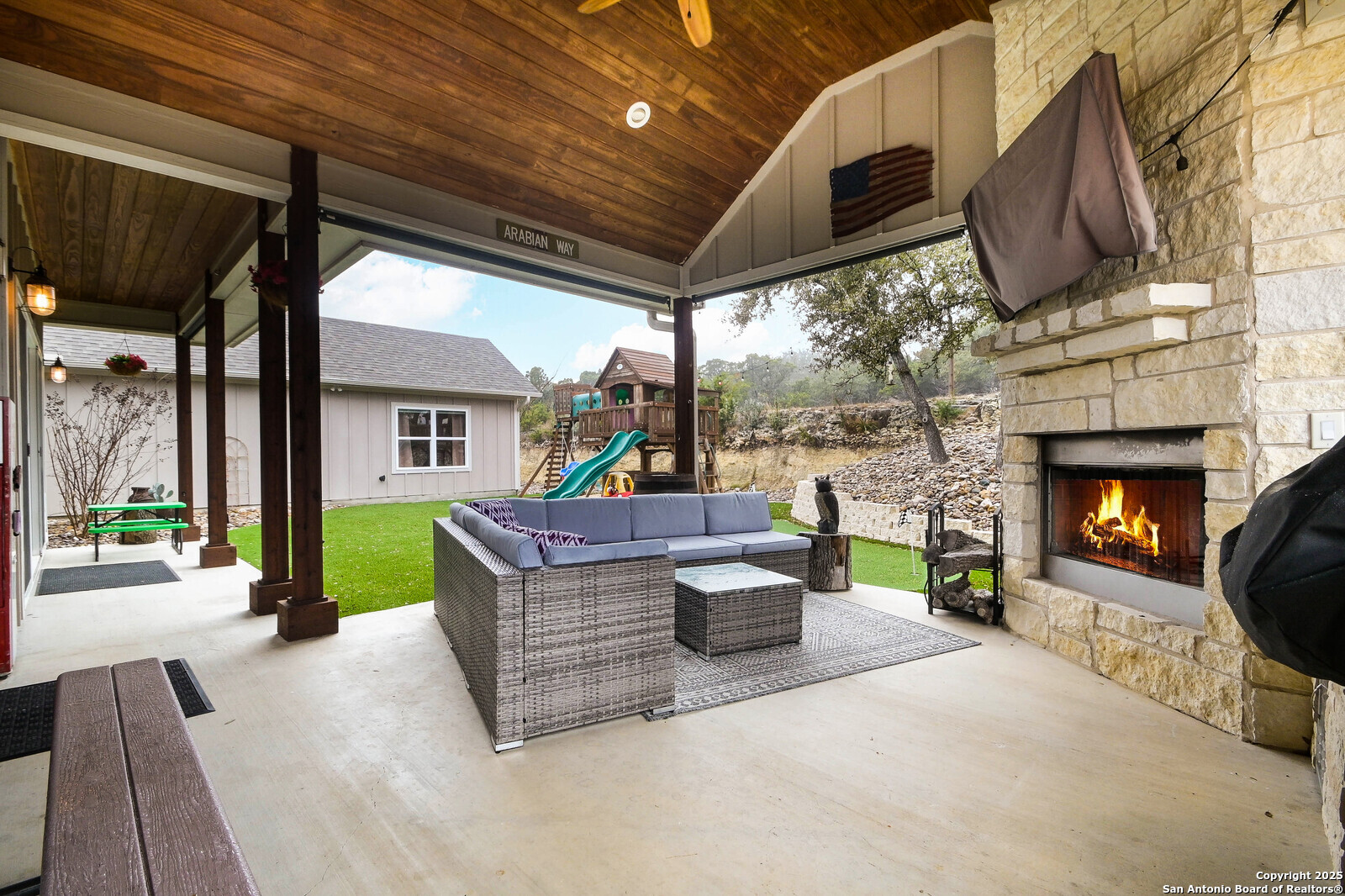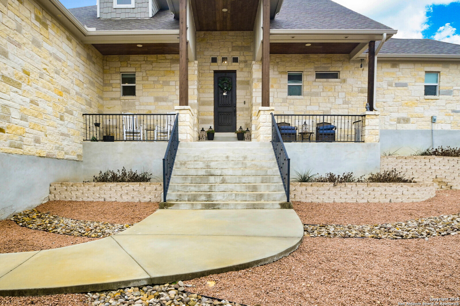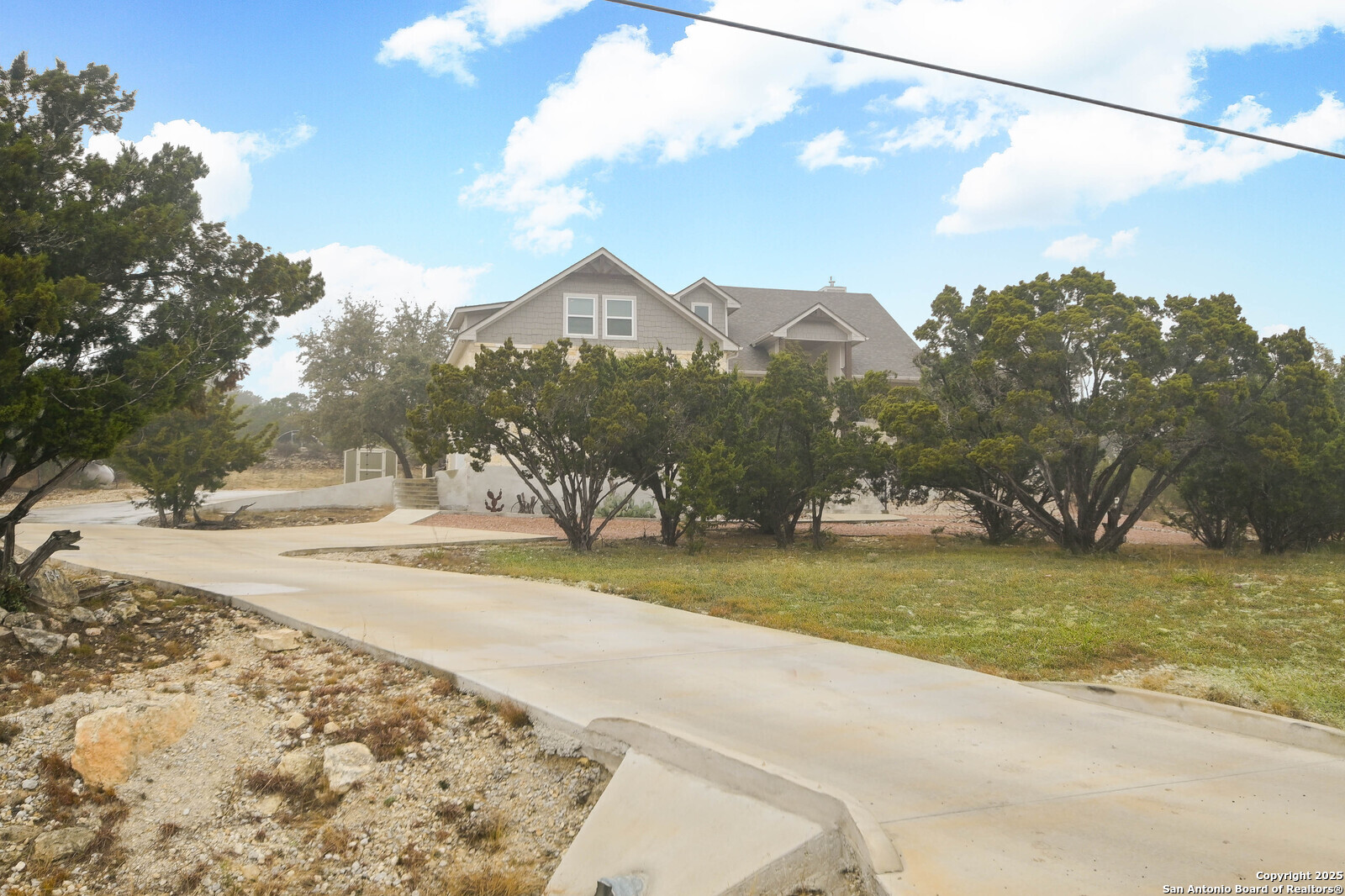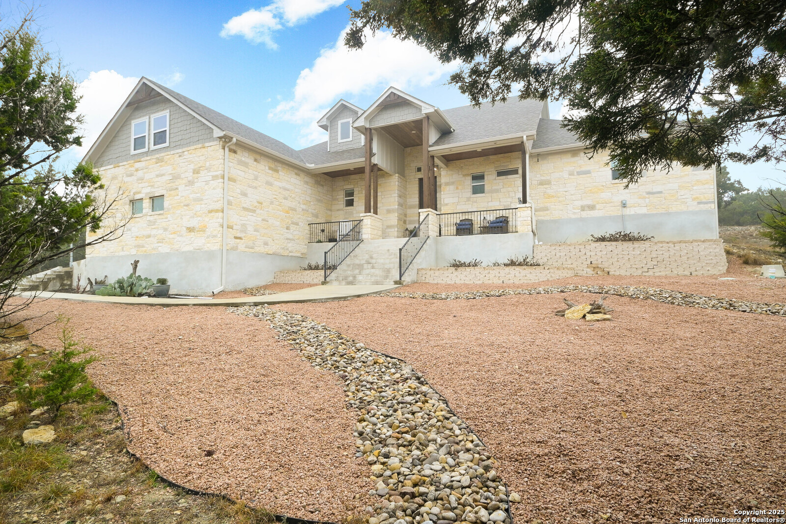 Nestled on 2.07 acres in the gated Stallion Estates, this custom 1.5-story Hill Country home offers a perfect blend of elegance, efficiency, and comfort. Featuring 4 bedrooms, 3.5 baths, and 2,684 sq. ft., the open floor plan includes a spacious living room, a gourmet kitchen with quartz countertops, and a dedicated dining area. The primary suite boasts a spa-like walk-in shower and dual vanities, while the media/playroom upstairs adds extra versatility. A VFD-driven HVAC system provides exceptional energy efficiency, making it easier to power the home with a smaller generator if desired. Outside, enjoy a professionally installed golf putting green, low-maintenance artificial grass, and a covered patio with an outdoor fireplace. Located in a stable, horse-friendly neighborhood, this home offers a unique opportunity for those seeking a Hill Country lifestyle. Additional highlights include an oversized two-car garage, private septic system, and paved roads. Zoned to Comal ISD schools and just minutes from Hwy 281, shopping, dining, and Canyon Lake-this is Texas living at its finest!