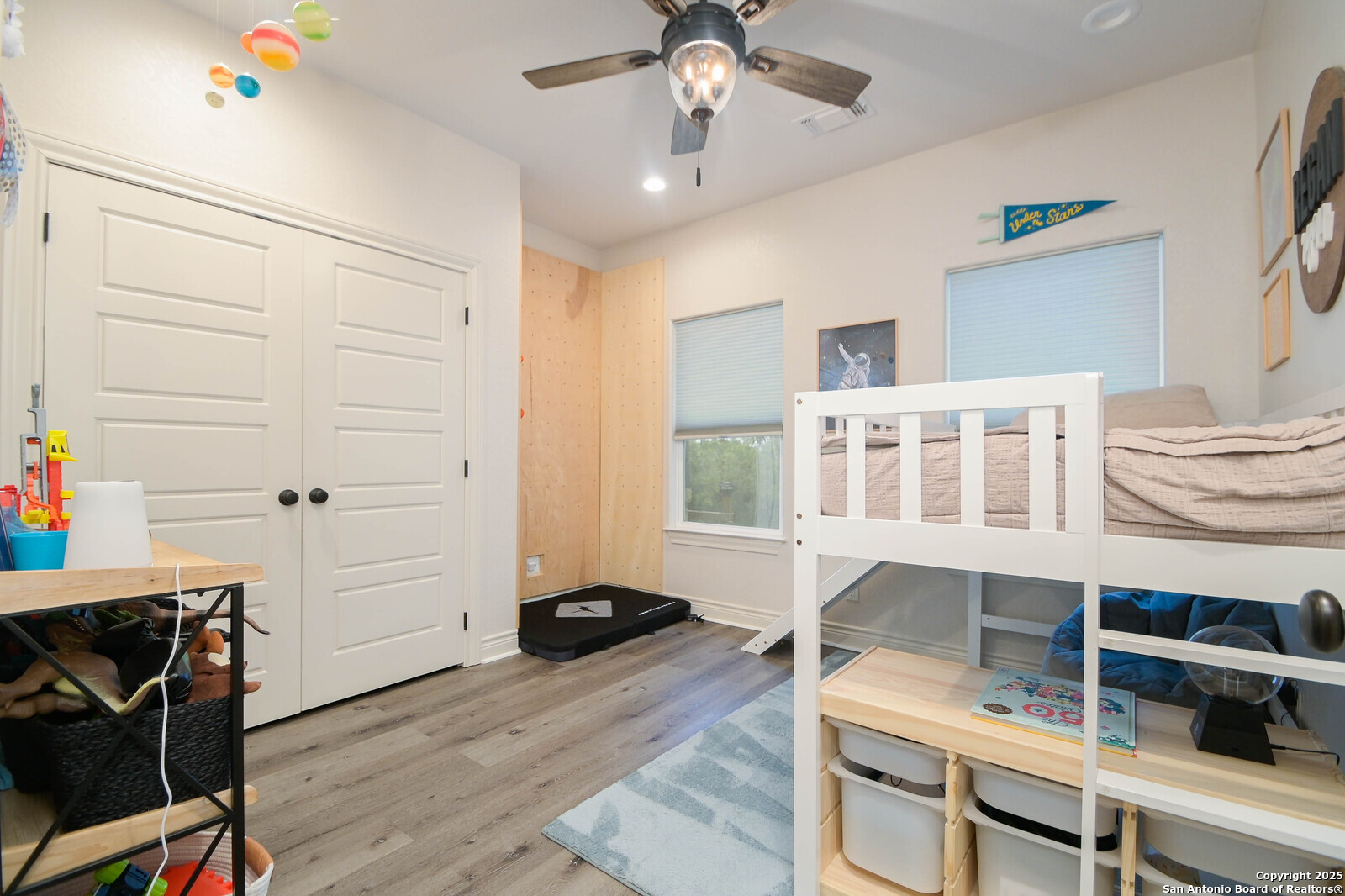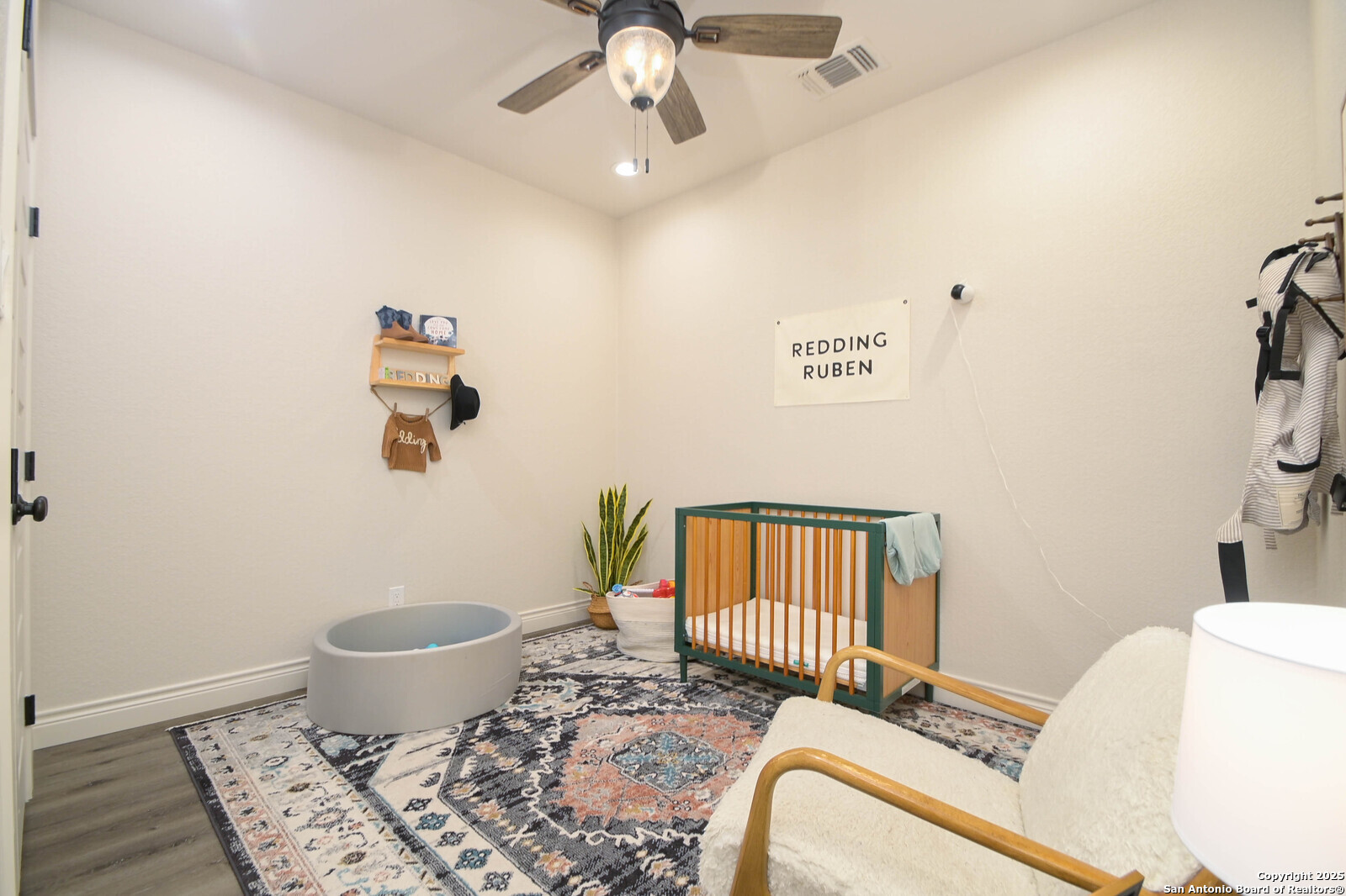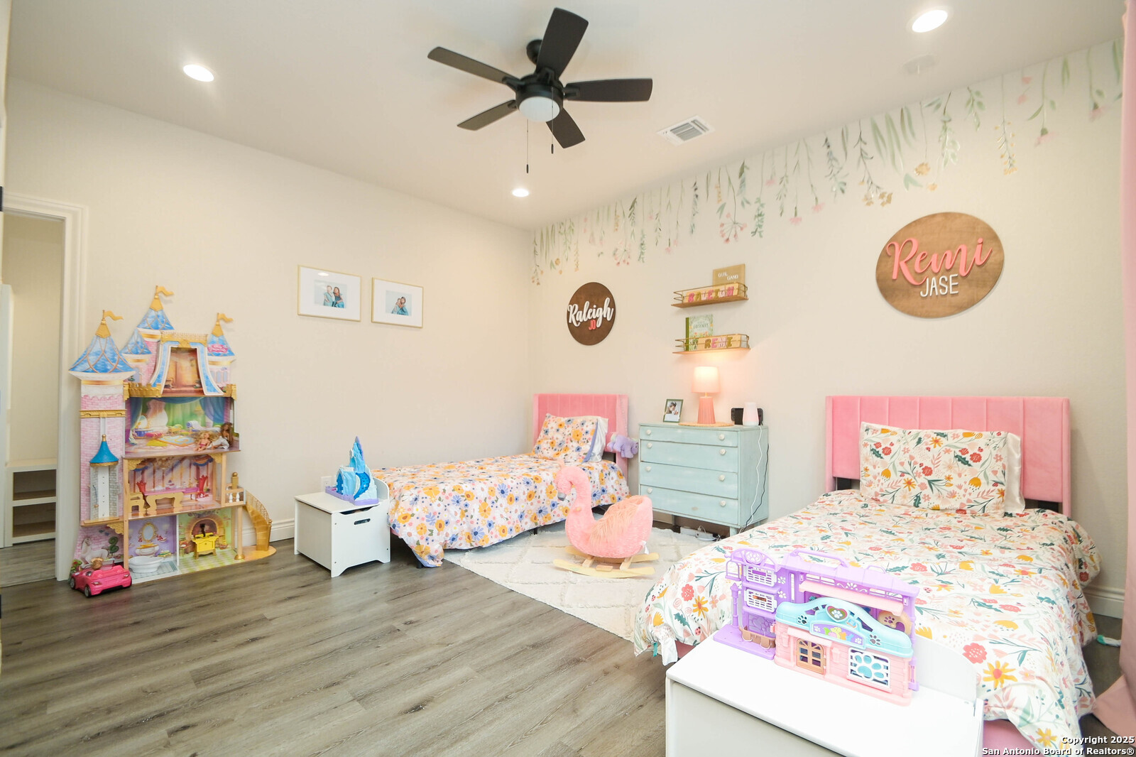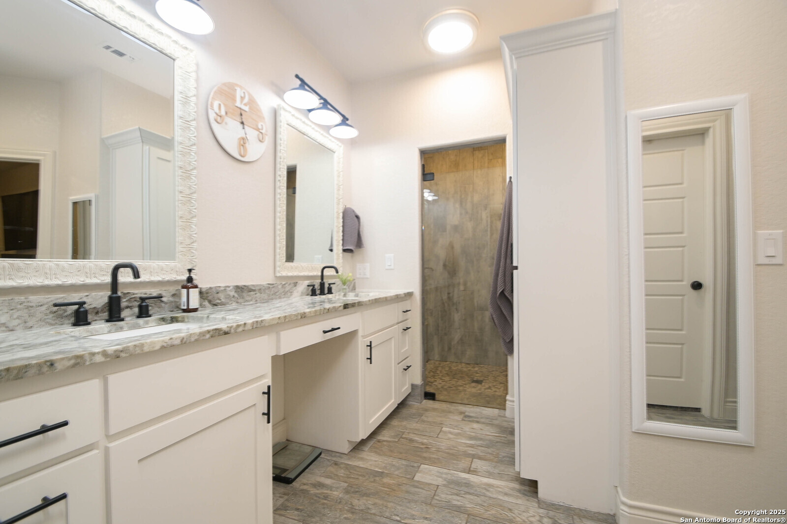 Nestled on 2.07 acres in the gated Stallion Estates, this custom 1.5-story Hill Country home offers a perfect blend of elegance, efficiency, and comfort. Featuring 4 bedrooms, 3.5 baths, and 2,684 sq. ft., the open floor plan includes a spacious living room, a gourmet kitchen with quartz countertops, and a dedicated dining area. The primary suite boasts a spa-like walk-in shower and dual vanities, while the media/playroom upstairs adds extra versatility. A VFD-driven HVAC system provides exceptional energy efficiency, making it easier to power the home with a smaller generator if desired. Outside, enjoy a professionally installed golf putting green, low-maintenance artificial grass, and a covered patio with an outdoor fireplace. Located in a stable, horse-friendly neighborhood, this home offers a unique opportunity for those seeking a Hill Country lifestyle. Additional highlights include an oversized two-car garage, private septic system, and paved roads. Zoned to Comal ISD schools and just minutes from Hwy 281, shopping, dining, and Canyon Lake-this is Texas living at its finest!