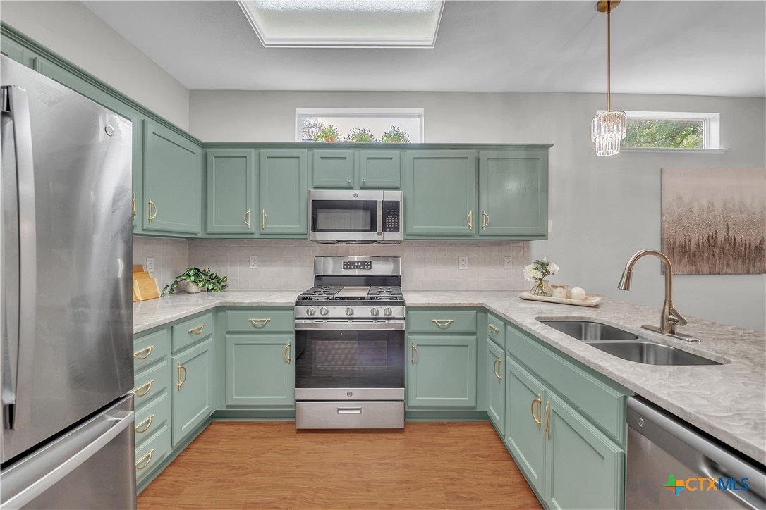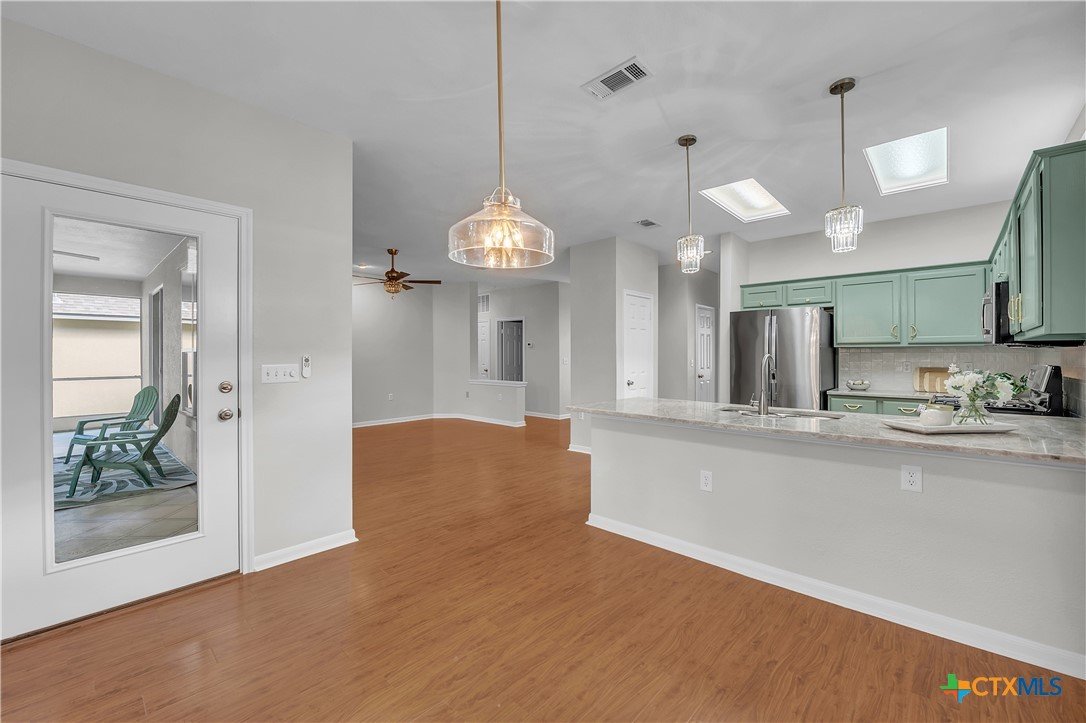 Newly updated 2-bedroom, 2-bath home with 1,310 sq. ft. in Sun City Texas, Georgetown’s premier 55+ active community. This home offers an open floor plan with updated fixtures and durable vinyl flooring throughout. The kitchen features stainless steel appliances, painted cabinetry, and generous counter space, while the living area opens to a covered screened-in porch perfect for relaxing or entertaining. The main bedroom includes a walk-in closet and private bath, and the second bedroom is well-sized with convenient access to a full bath. Sun City residents enjoy championship golf courses, resort-style pools, and state-of-the-art fitness centers for an unmatched active lifestyle.