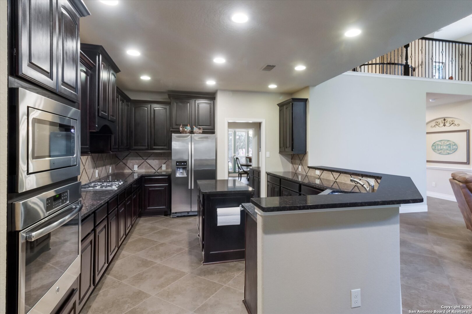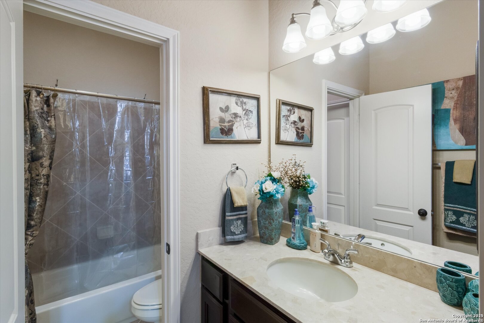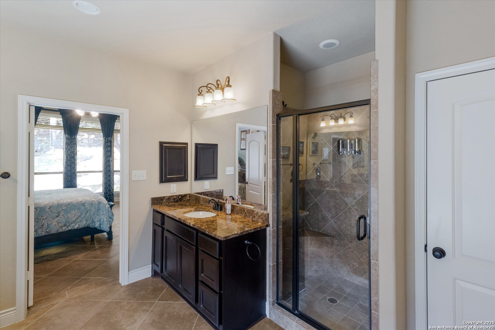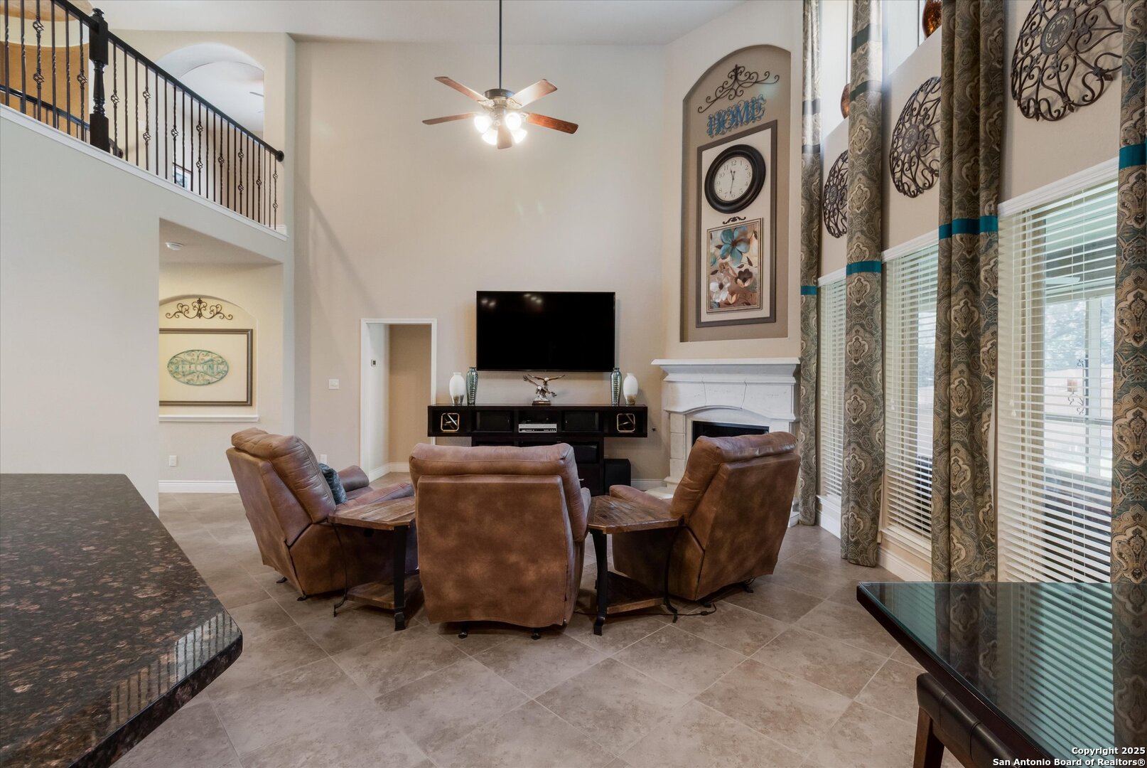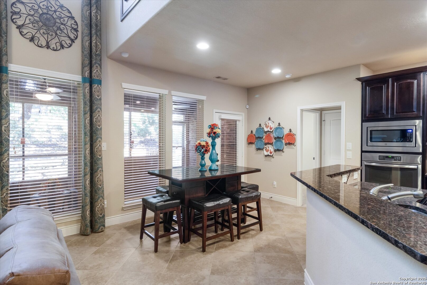 ***PRICE DROP*** Welcome to 13434 Palatine Hill, a meticulously maintained 5-bedroom, 4.5-bathroom home nestled in the sought-after Bella Vista community of San Antonio. This grand residence offers timeless curb appeal with a striking brick and stone facade, manicured landscaping, a welcoming covered entry, and front and back green belts. Step inside to a soaring two-story foyer and sweeping staircase that immediately showcase the home's elegance. The open-concept floor plan features expansive tile flooring throughout the main living areas, ideal for both everyday living and entertaining. A dedicated study with abundant natural light is perfect for working from home, while the formal dining room offers a stylish space for hosting dinner parties. The heart of the home is the gourmet kitchen, boasting rich espresso cabinetry, granite countertops, a central island, stainless steel appliances, and a built-in oven. The adjoining family room features a cozy corner fireplace and a wall of two-story windows that flood the space with light and provide a serene view of the backyard. Retreat to the spacious primary suite, complete with a bay window sitting area and an en-suite bath featuring dual vanities, a walk-in shower, a soaking tub, and generous closet space. In addition a secondary bedroom (mother in-law suite) is located downstairs. Upstairs, you'll find 3 additional bedrooms, your own theater room, and a versatile loft space, perfect for a game room or second living area. Enjoy Texas evenings in the lush, private backyard with mature trees, rock landscaping, and a screened-in porch ideal for relaxing or dining al fresco. Located in the highly desirable Northside ISD and close to Loop 1604, major employers, dining, shopping, and top-rated schools, this home is the perfect blend of comfort, style, and convenience.