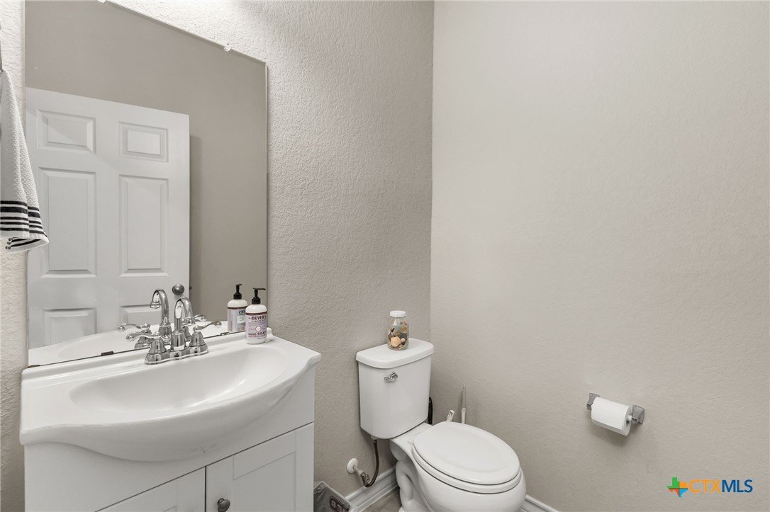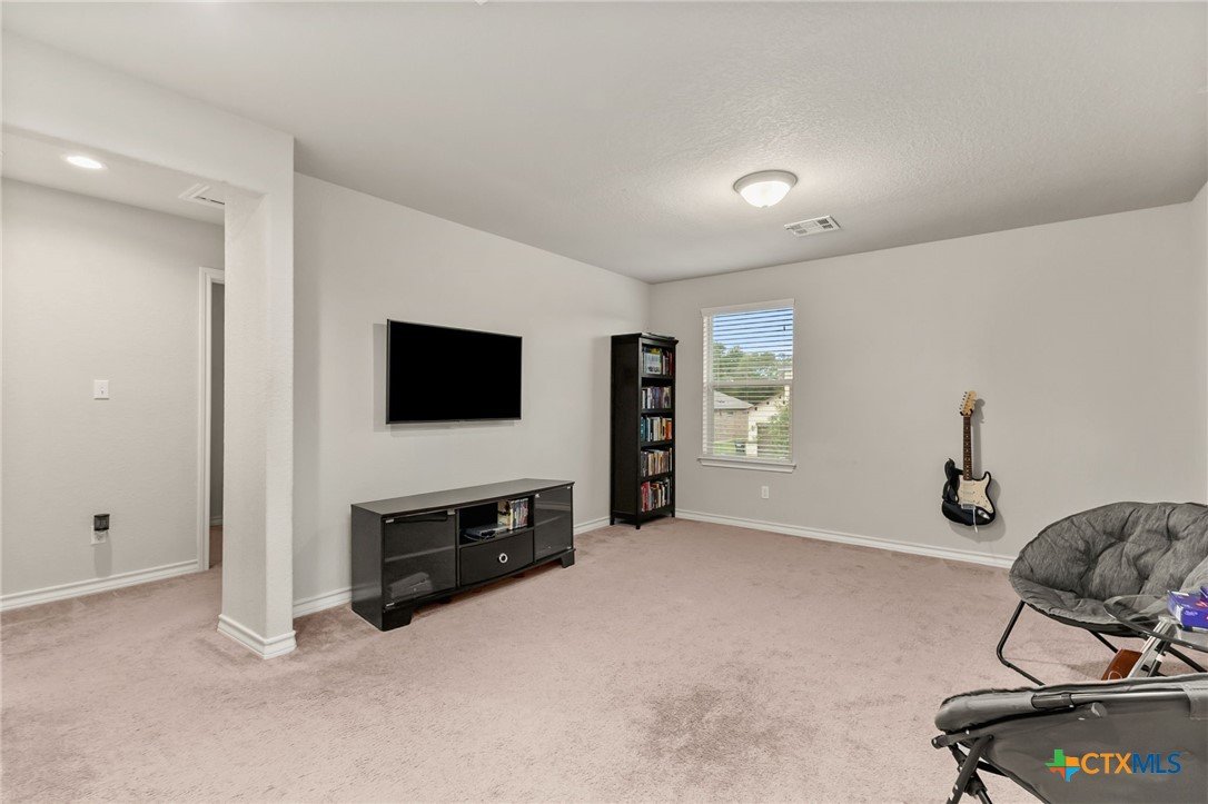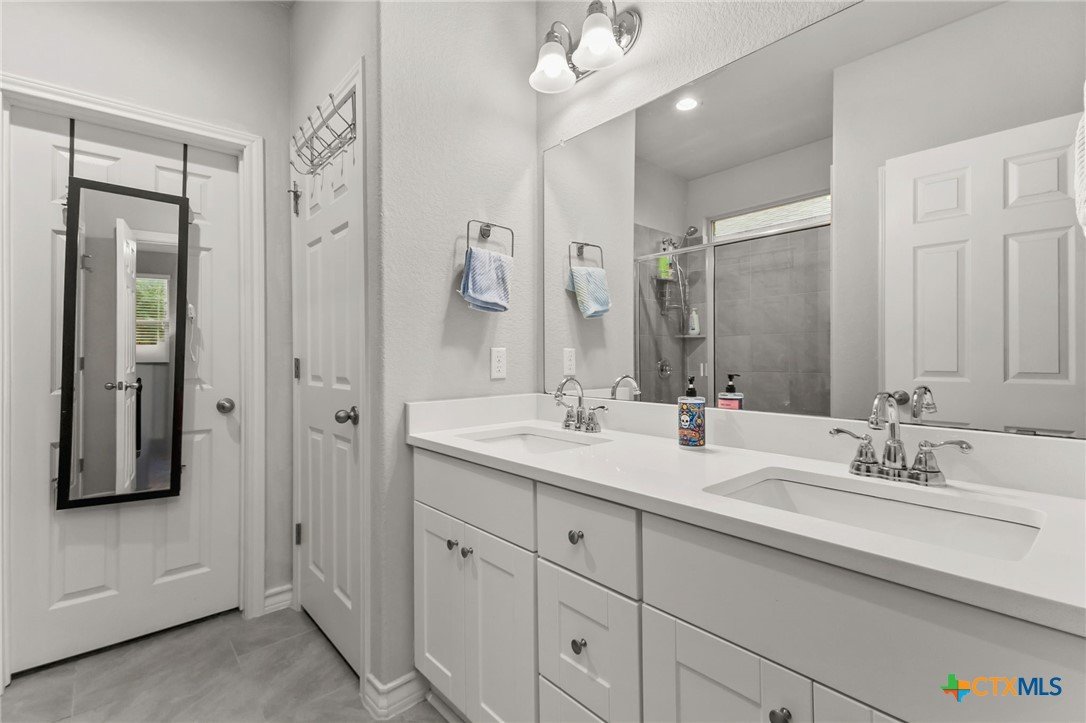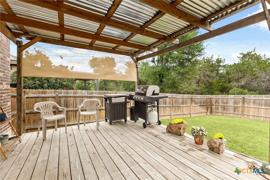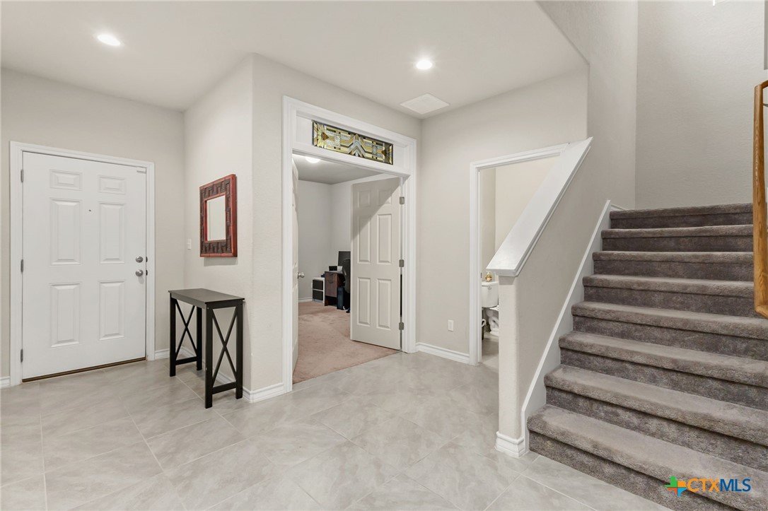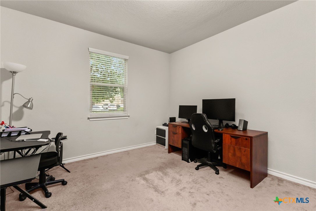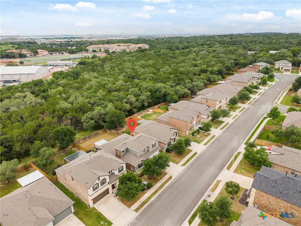 $5,000 offered for Buyer Closing Costs! Beautiful and well-maintained 3 bedroom, 2.5 bathroom home built in 2017, featuring a spacious 2,286 sq ft layout with the primary suite and a dedicated office on the main floor. The open-concept kitchen and living area includes rich brown cabinetry, white quartz countertops, and white cabinetry in the bathrooms for a clean, modern aesthetic. Light gray tile and carpet throughout provide a serene, neutral palette. Constructed with all masonry—brick on three sides and stucco on the front—this home offers curb appeal and durability. The private backyard is fully fenced and includes a covered back deck and mature live oak trees in the front yard. The property backs up to wooded San Marcos ISD land and is adjacent to the Doris Miller Middle School greenspace for added privacy and natural beauty. Enjoy two living areas—one upstairs and one down—offering flexible space for entertaining or relaxing. Conveniently located with quick access to Hunter Road which connects New Braunfels, Gruene, and San Marcos, TX and just 5 minutes from I-35. Location is just minutes from Texas State University, the San Marcos River, San Marcos Outlet Malls, and many outdoor adventures and attractions.