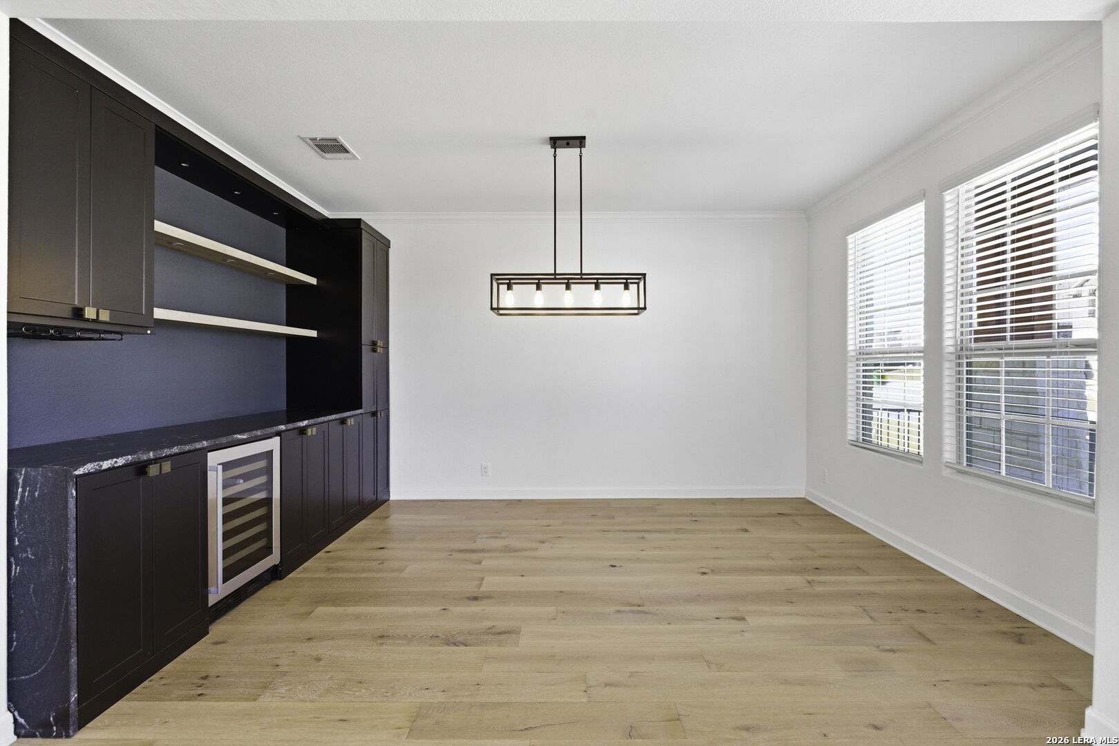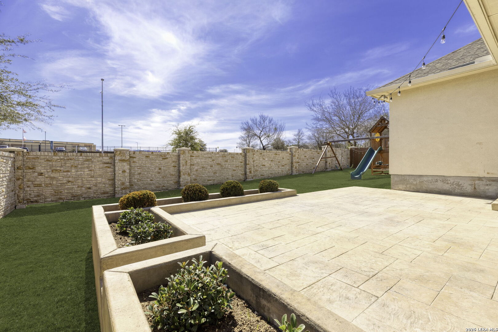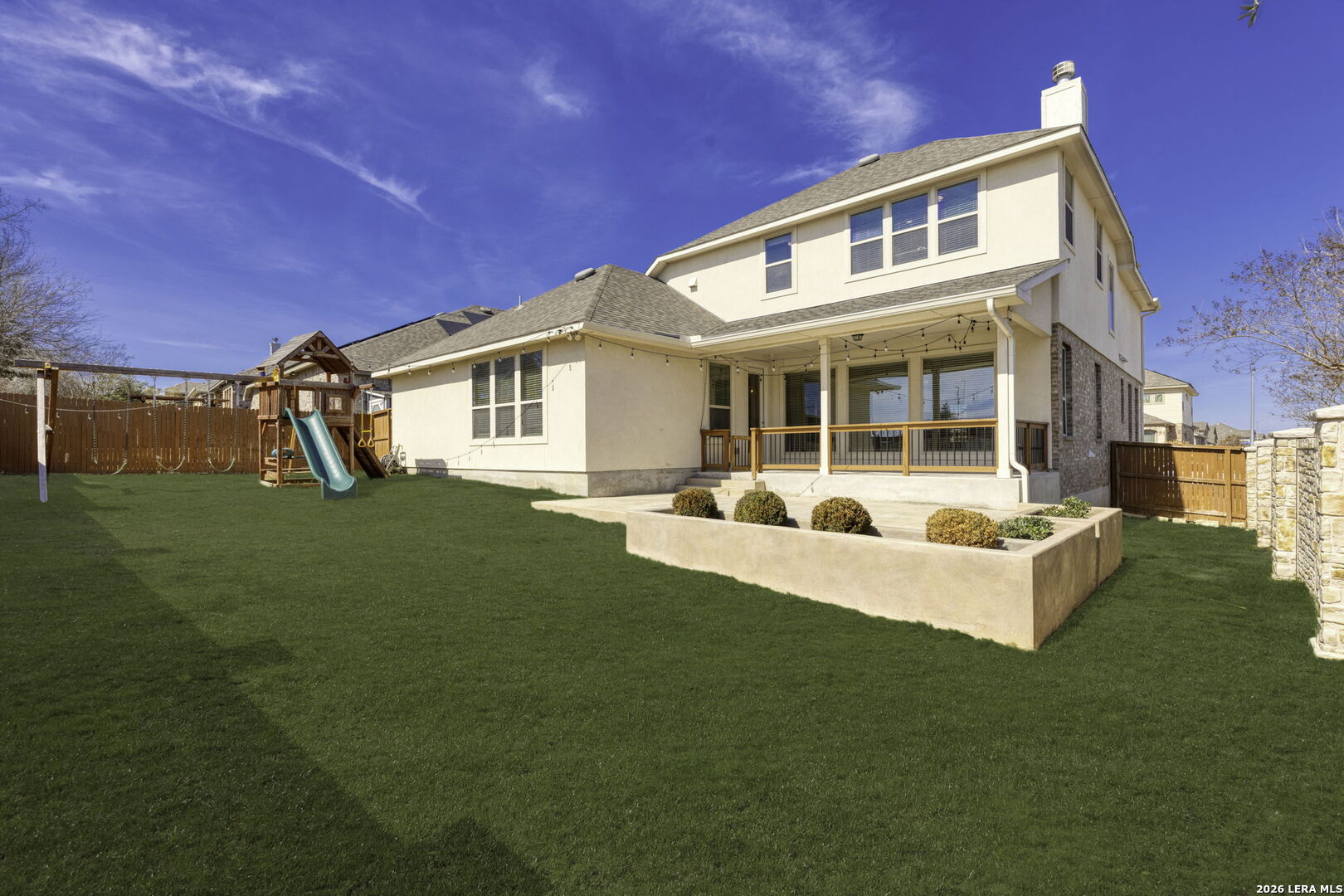 Modern luxury meets functional design in this stunning 4-bedroom, 3.5 bath residence featuring a versatile layout across two levels. The first floor offers high ceilings and custom wood flooring throughout. The formal dining room features a custom dry bar with a built-in wine refrigerator, stone countertops and custom lighting. Located across from the dining room is additional open living space. The heart of the home is the open kitchen, boasting white cabinetry, stone countertops, a gas range with a stainless vent hood, and a massive walk-in pantry. This area flows into the family room, centered by a floor-to-ceiling gas stone fireplace. A private study near the center of the home provides a quiet workspace. The primary retreat is located on the main floor for maximum privacy. It features a spa-inspired ensuite bath with dual vanities, a garden tub, and a separate glass shower. This suite is completed with dedicated his and hers walk-in closets. The second level of the home offers a massive game room that serves as a third family area and features 3 additional bedrooms and 2 full baths. Step outside to an extended covered patio with an additional attached paved terrace with planters. The backyard also includes a built-in playscape making it wonderful for summer BBQ's and winding down in the evening. Essential features include a mudroom with a built-in bench, a large utility room, water softener, sprinkler system, security system and a two-car garage. This home is located in NISD with award winning schools and near tons of shopping, dining, and major highways. Do not miss the opportunity to make this your new home!