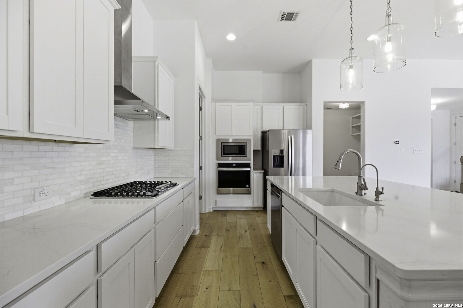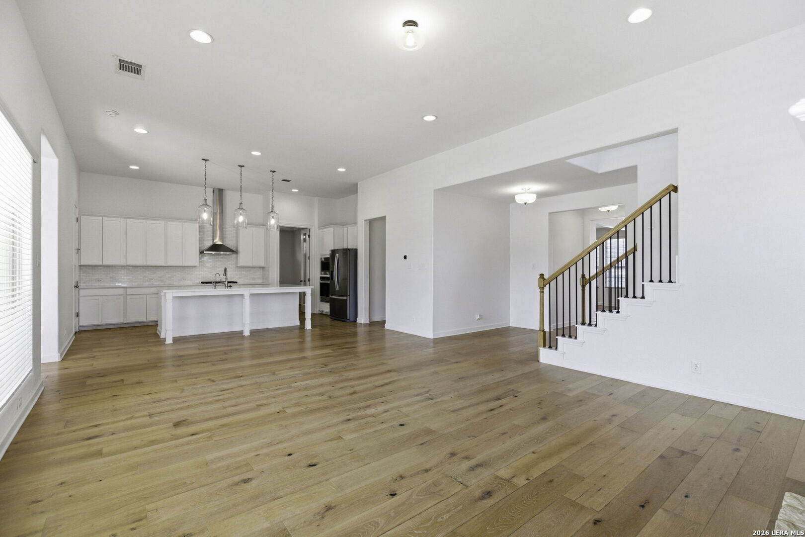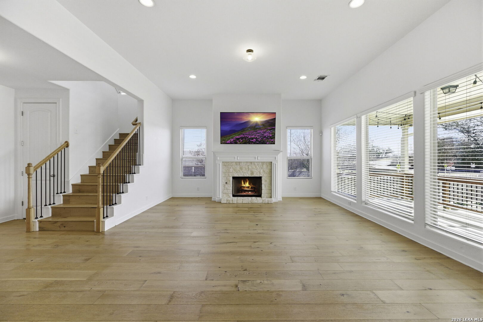 Modern luxury meets functional design in this stunning 4-bedroom, 3.5 bath residence featuring a versatile layout across two levels. The first floor offers high ceilings and custom wood flooring throughout. The formal dining room features a custom dry bar with a built-in wine refrigerator, stone countertops and custom lighting. Located across from the dining room is additional open living space. The heart of the home is the open kitchen, boasting white cabinetry, stone countertops, a gas range with a stainless vent hood, and a massive walk-in pantry. This area flows into the family room, centered by a floor-to-ceiling gas stone fireplace. A private study near the center of the home provides a quiet workspace. The primary retreat is located on the main floor for maximum privacy. It features a spa-inspired ensuite bath with dual vanities, a garden tub, and a separate glass shower. This suite is completed with dedicated his and hers walk-in closets. The second level of the home offers a massive game room that serves as a third family area and features 3 additional bedrooms and 2 full baths. Step outside to an extended covered patio with an additional attached paved terrace with planters. The backyard also includes a built-in playscape making it wonderful for summer BBQ's and winding down in the evening. Essential features include a mudroom with a built-in bench, a large utility room, water softener, sprinkler system, security system and a two-car garage. This home is located in NISD with award winning schools and near tons of shopping, dining, and major highways. Do not miss the opportunity to make this your new home!