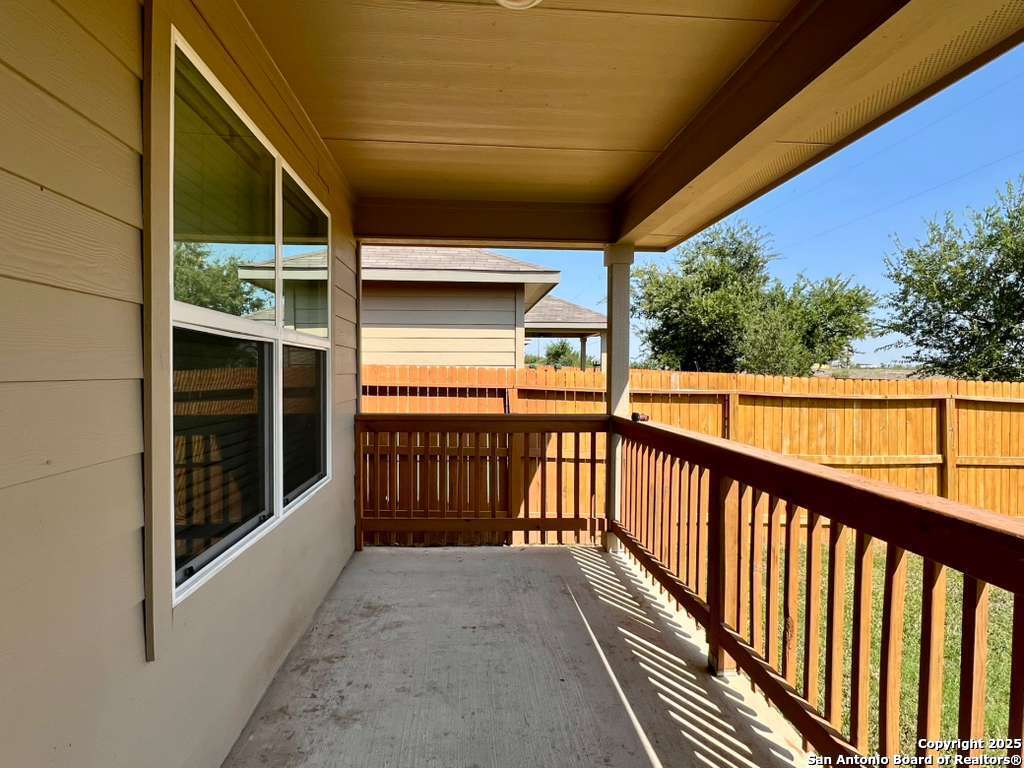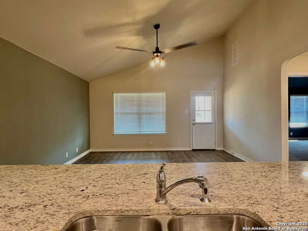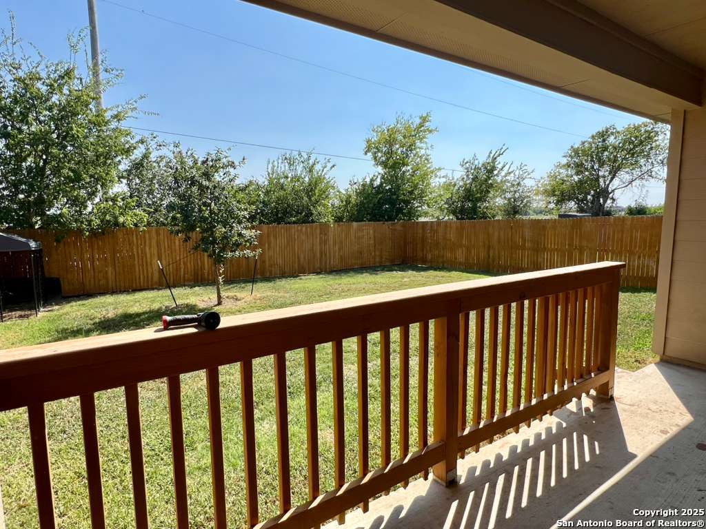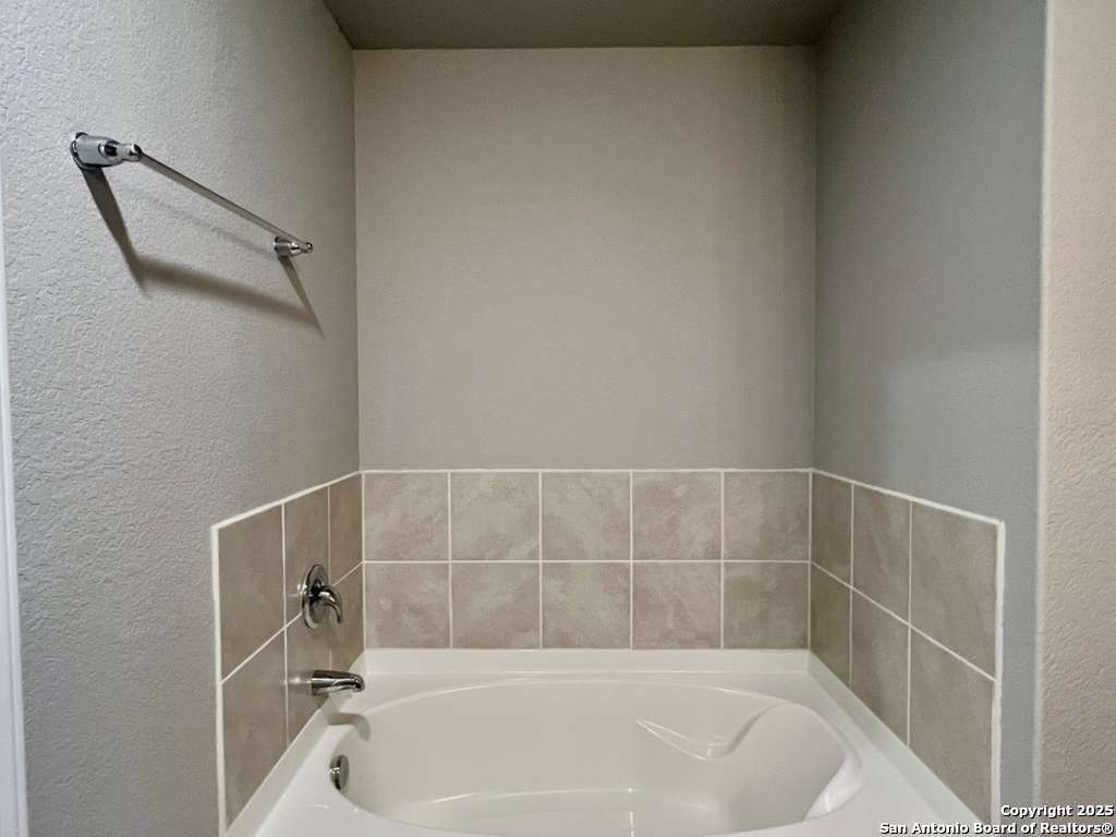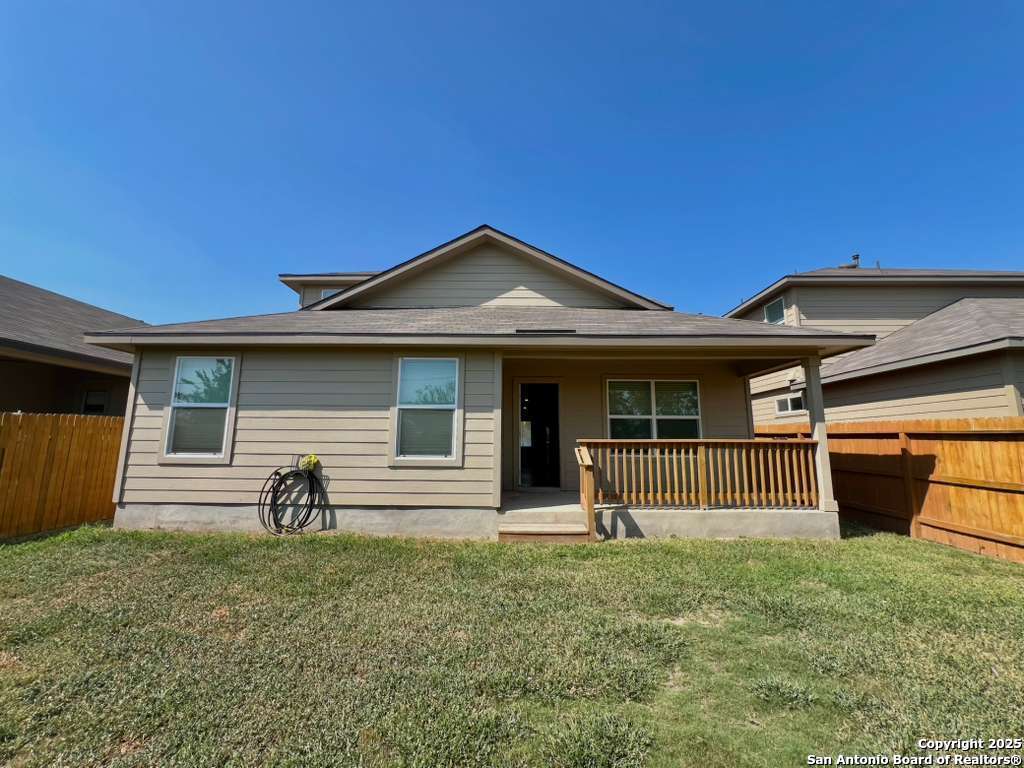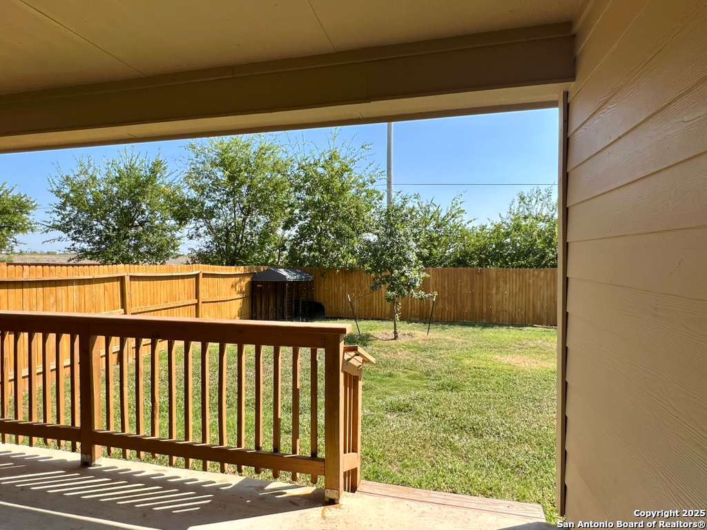 Welcome to Whisper Falls! This warm and inviting 4-bedroom, 2.5-bathroom two-story home could be your next rental! This home is move-in ready, featuring a formal dining room upon entry for coffee breaks, entertaining or the perfect study/office space. The kitchen is the heart of the home, with granite countertops, rich dark wood cabinetry, stainless steel appliances, gas cooking, and an over-sized breakfast bar perfect for casual meals or extra prep space. The kitchen flows seamlessly into the living space, making it feel extra grand with super high ceilings and lots of natural light flowing in from the exterior windows. Vinyl wood-like plank flooring throughout the first-floor living and dining areas ensures low-maintenance living. The primary bedroom, located on the main floor, features a large vanity, separate garden tub, tile shower, and an oversized walk-in closet, a true retreat. Upstairs, you'll find generously sized secondary bedrooms, plus a large loft/flex space for additional living and entertainment. The garage is equipped with hanging rack storage and epoxy floors for durability and organization. Step outside to enjoy summer nights under the covered patio, enjoy the peace and tranquility of having NO backyard neighbors! These Texas Sunsets and country views are calling your name! Neighborhood amenities include a splash pad, lap and recreational swimming, a park, a sport court, and a clubhouse. Conveniently located near Hwy 90, offering a quick commute into downtown San Antonio. What's not to love? Hurry, this one won't last long!