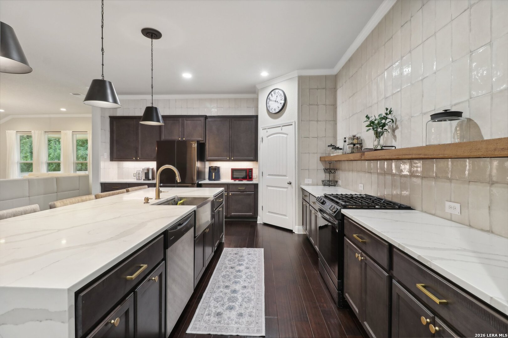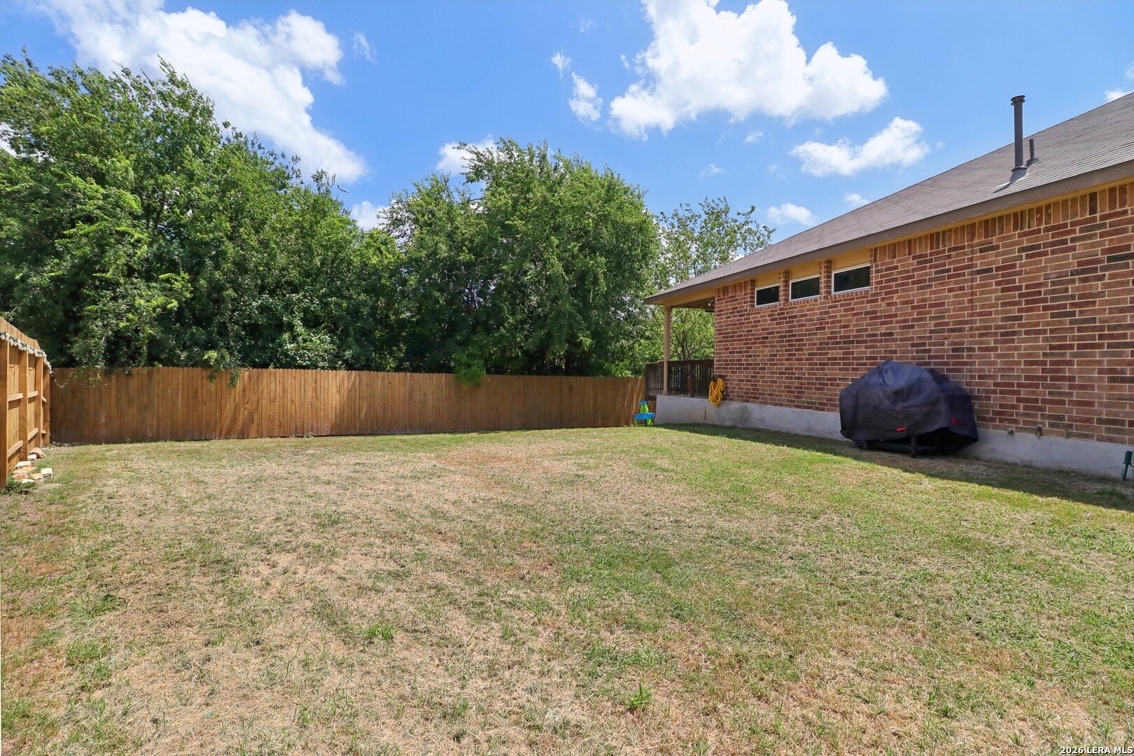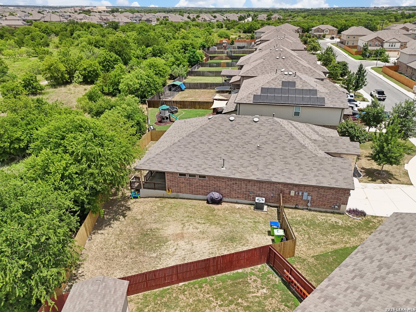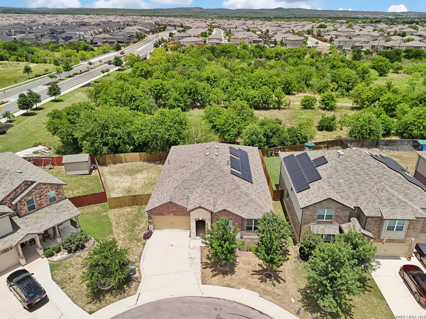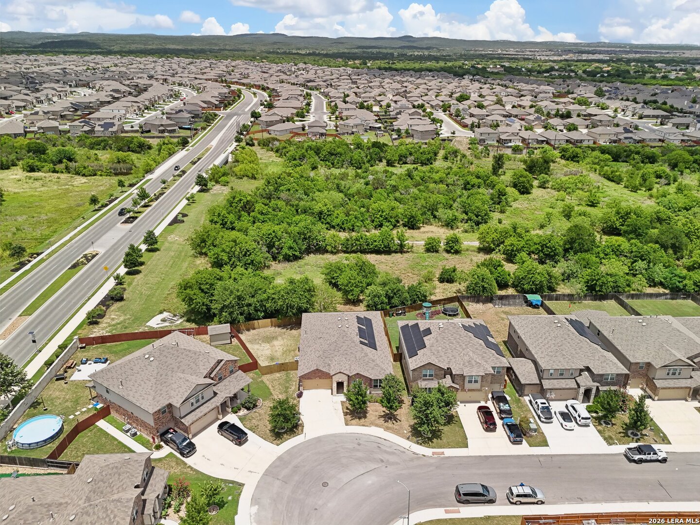 Set within the sought after Valley Ranch community and part of the Northside ISD school district, this one story home in San Antonio features a striking all brick and stone exterior paired with a thoughtfully designed open concept floorplan. Inside, high ceilings and recessed lighting enhance the spacious feel, complemented by durable luxury vinyl plank flooring throughout. The modern kitchen serves as a true focal point, showcasing granite countertops, a dramatic floor to ceiling backsplash, and a large waterfall island with seating for up to six, ideal for gatherings and everyday use. The layout flows seamlessly into the main living areas, creating a functional and inviting space. Offering 5 bedrooms, the property provides flexibility for a variety of needs. The primary suite includes a walk in closet with custom shelving, adding both convenience and organization. Step outside to a large backyard with a covered patio, perfectly positioned to back up to a greenbelt, providing added privacy and a natural backdrop. Additional features include solar panels, contributing to energy efficiency and long term savings.