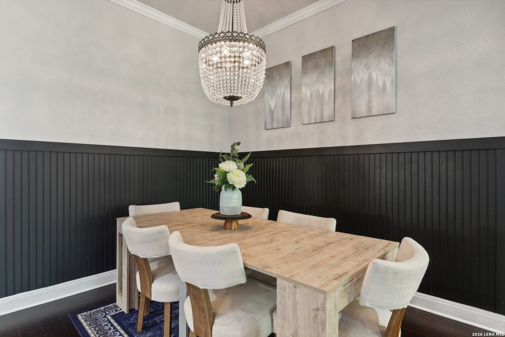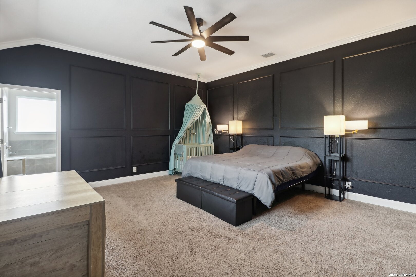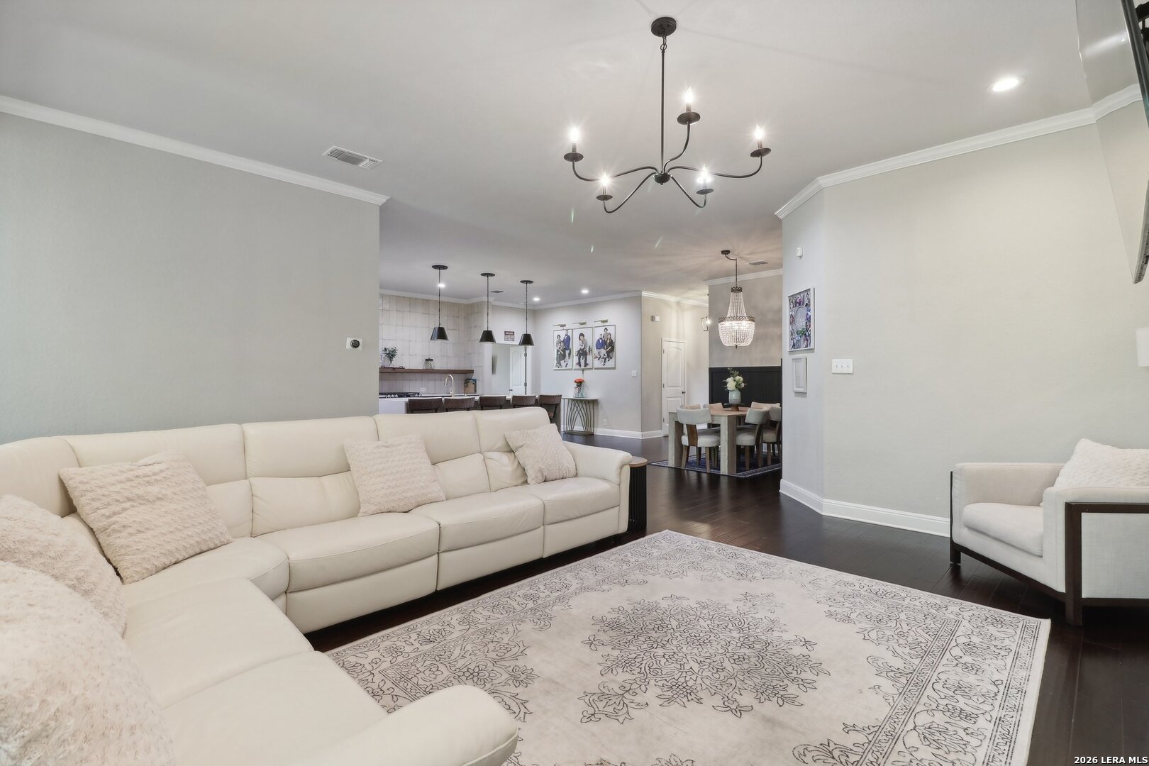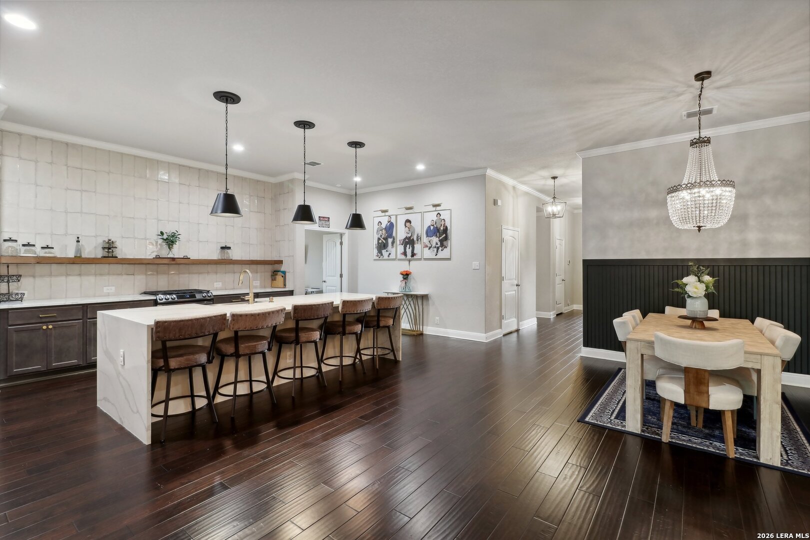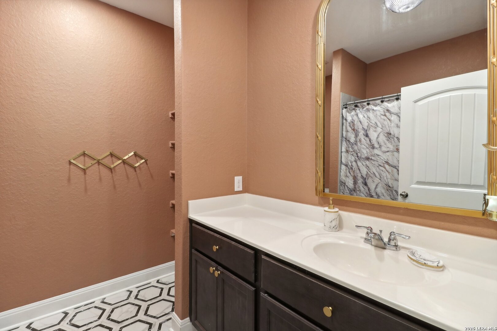Set within the sought after Valley Ranch community and part of the Northside ISD school district, this one story home in San Antonio features a striking all brick and stone exterior paired with a thoughtfully designed open concept floorplan. Inside, high ceilings and recessed lighting enhance the spacious feel, complemented by durable luxury vinyl plank flooring throughout. The modern kitchen serves as a true focal point, showcasing granite countertops, a dramatic floor to ceiling backsplash, and a large waterfall island with seating for up to six, ideal for gatherings and everyday use. The layout flows seamlessly into the main living areas, creating a functional and inviting space. Offering 5 bedrooms, the property provides flexibility for a variety of needs. The primary suite includes a walk in closet with custom shelving, adding both convenience and organization. Step outside to a large backyard with a covered patio, perfectly positioned to back up to a greenbelt, providing added privacy and a natural backdrop. Additional features include solar panels, contributing to energy efficiency and long term savings.