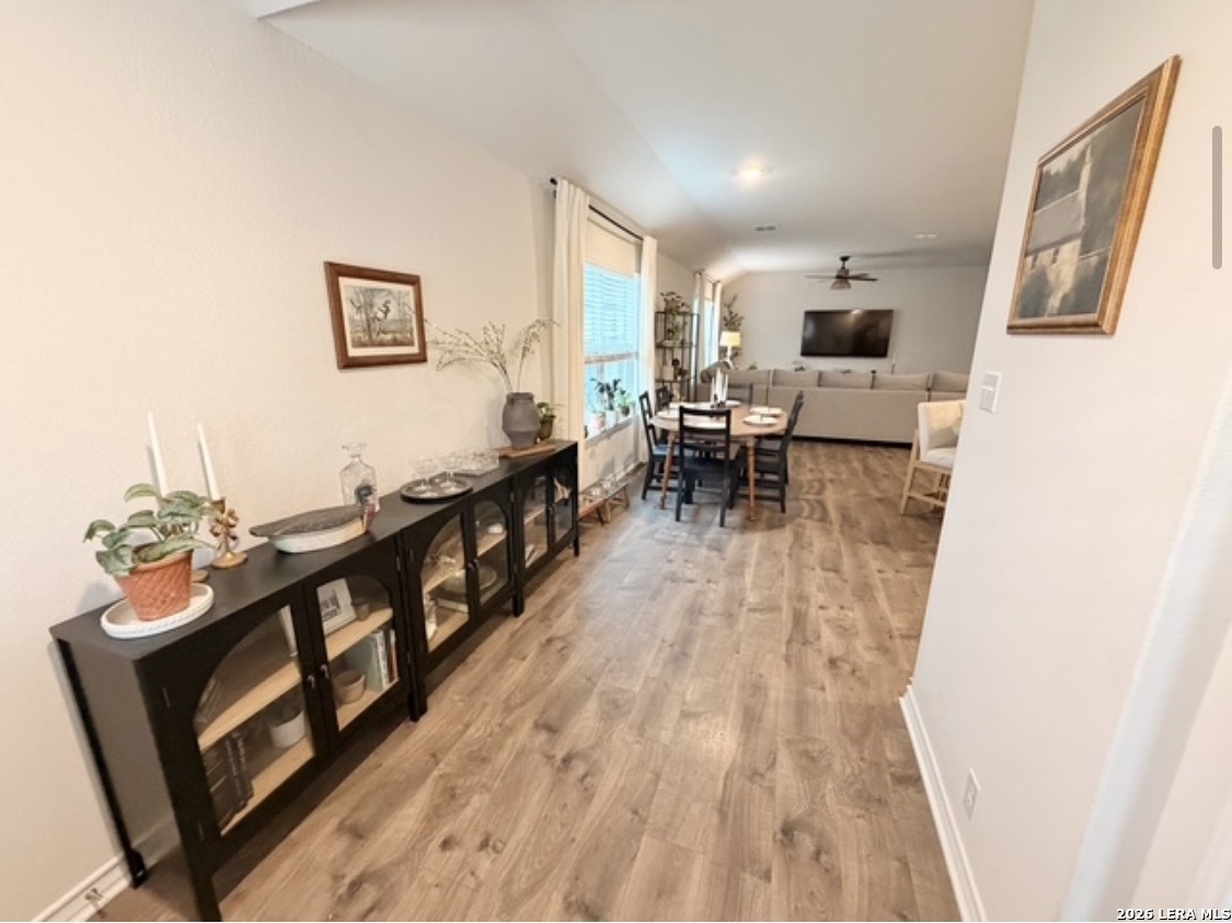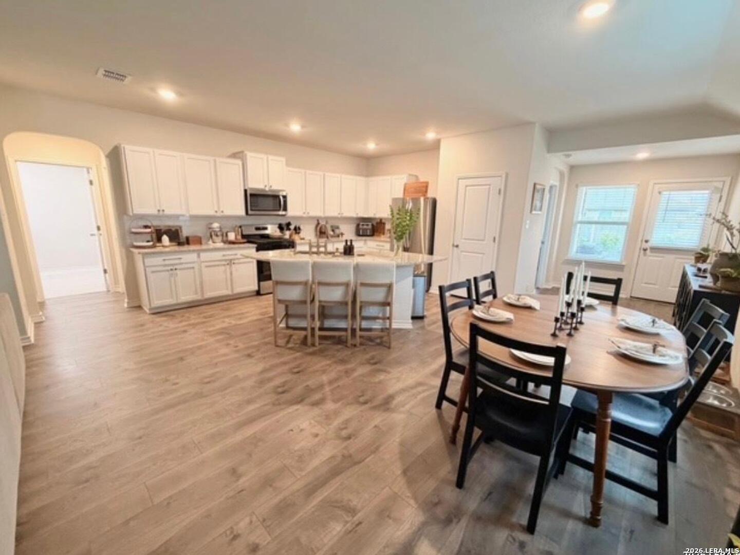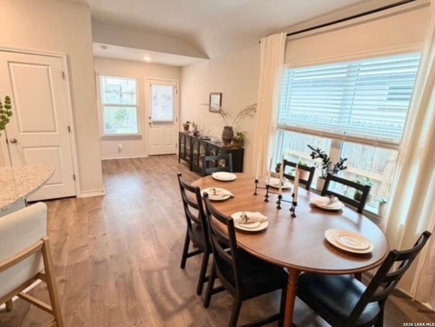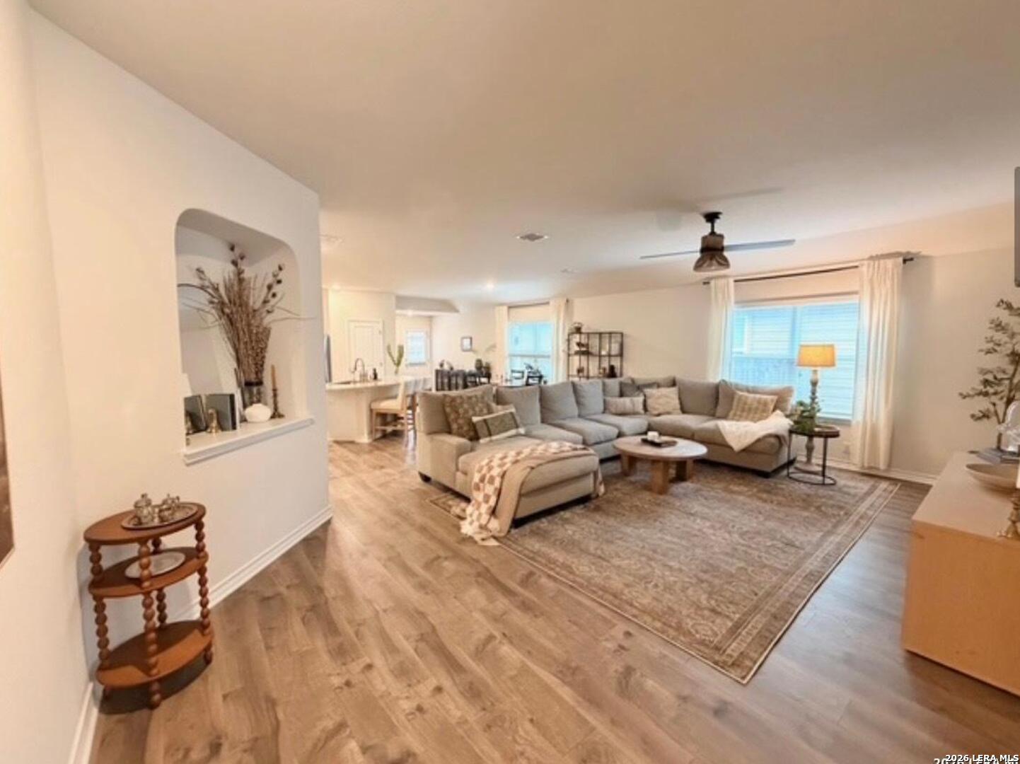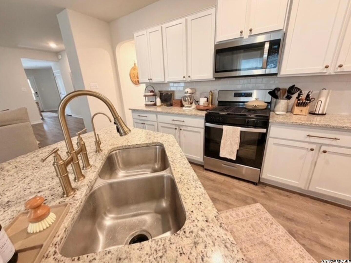 Popular Knight single story floor plan upgraded with 8.5 X 8 covered patio plus extended 12 X 20 patio for entertaining outdoor activities with beautiful landscaping. Home features 4-bedrooms, 2-bathroom open floor plan layout designed to provide spacious atmosphere or comfortable living for the entertaining family. Inviting entry opens to a large Decorative Art niche, spacious open concept family room upgraded ceiling fan & lights with eat-in kitchen breakfast bar and dining area is perfect for entertaining friends & family quality time to build precious memories. Big beautiful kitchen with abundance of oversized cabinets with upgraded with hardware & upgraded sink faucet & under sink drinking water filtration system, granite countertops, stainless steel appliances, classic subway tile backsplash, huge island for family gatherings, pantry. Two spacious secondary bedrooms with upgraded ceiling fans & lights, with hall bath between, a 4th bedroom with big walk in closet, adjacent big laundry room. Oversized Master Bedroom with upgraded ceiling fan & lights with adjacent spacious full bath, double vanity, separate tiled shower with upgraded shower heads and tiled surround garden tub for relaxing, includes closet with wood shelving. Installed window blinds throughout. Home has 2 car garage attached, includes water softener & garage door opener, beautiful upgraded landscaping with sprinkler system front & back makes this property very appealing with curb appeal. Perfect location for school access, new HEB for grocery shopping. Neighborhood amenities galore for family parties & entertaining, Desirable HOA event participation is unbelievable with activities for all ages. THE "EXTRA" SECURITY (VIVINT) SYSTEM WILL NOT CONVEY & WILL BE REMOVED BY SELLER. THE 2 TV'S & MOUNTS WILL NOT CONVEY AND WILL BE REMOVED BY SELLER.