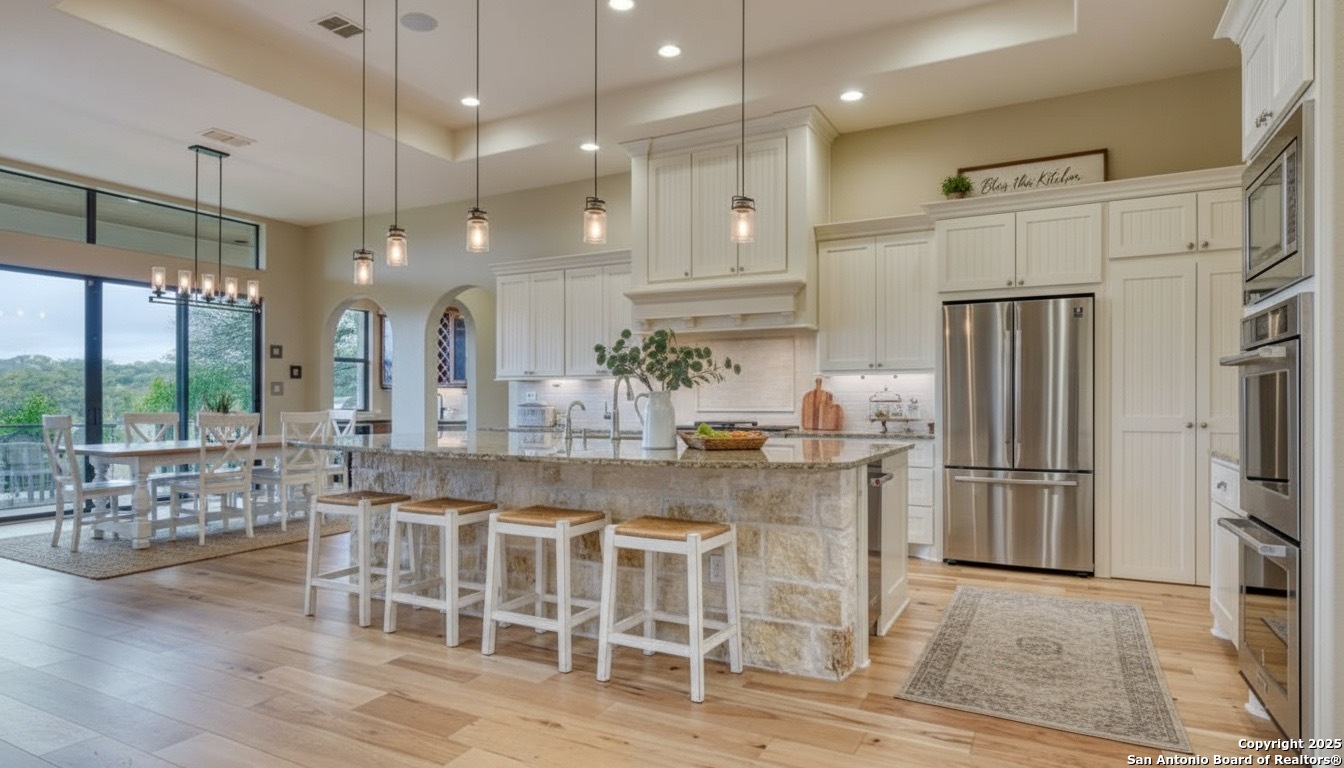 This custom T.A. French home in Vintage Oaks sits on a private one-acre lot with no rear neighbor and features an outdoor kitchen with fireplace and a custom garden shed. There is even a Secret room in this home. Inside you will find a gourmet kitchen that includes a double sink, built-in ice maker, double convection ovens, six-burner gas cooktop, and an oversized pantry perfect for Costco or Sam's runs. Additional spaces include a wine grotto, office, home theater, craft/sunroom, exercise room, and kids' retreat. The primary suite and a guest room with kitchenette are on the main level. There are four dedicated bedrooms plus flexible rooms that can serve as additional bedrooms, and a total of 5.5 bathrooms. A four-car garage completes the layout. Community amenities include miles of trails, a resort-style pool, lazy river, fitness center, clubhouse, sports fields, tennis courts, playgrounds, and more. There is no pool at the this home but shows what it could look like if you put one outside the patio.