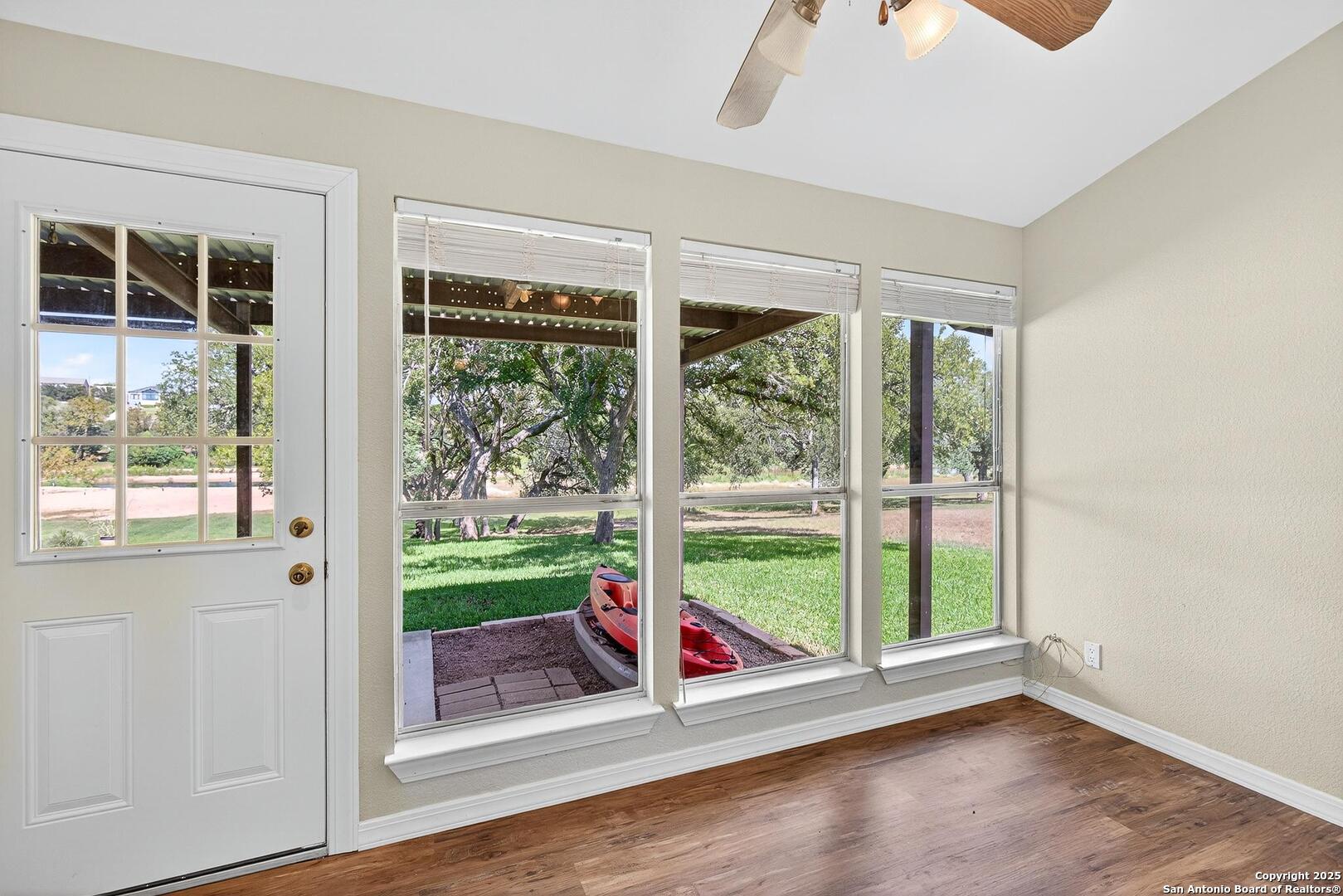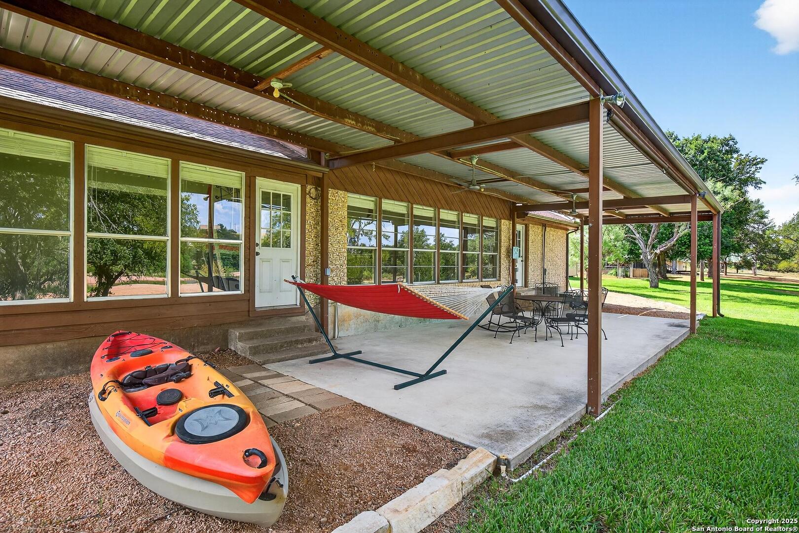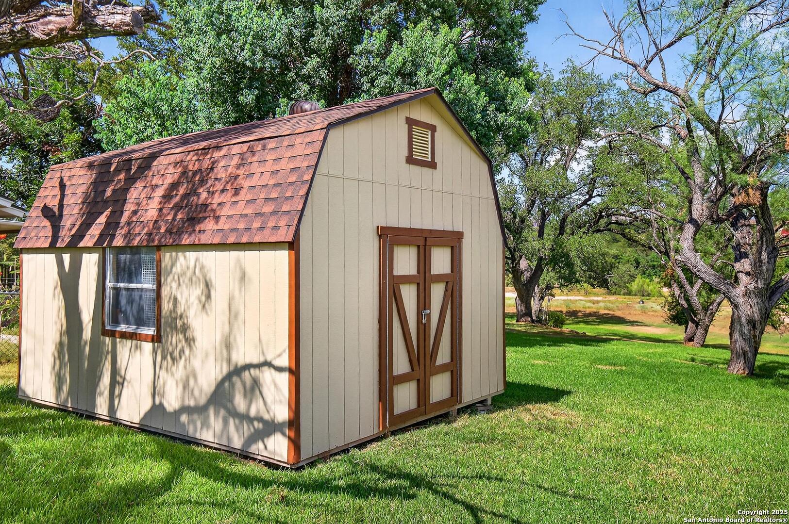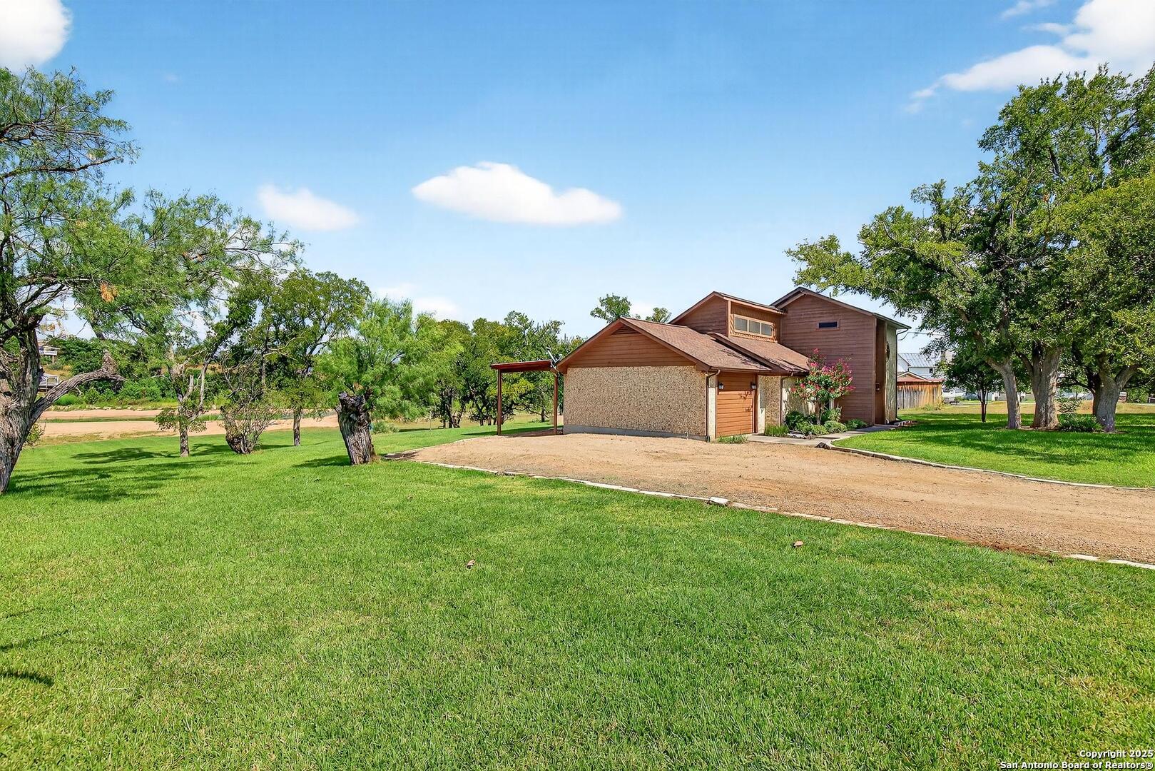 Lake LBJ Living, Elevated. With 1.69 acres and 149 feet of shoreline, this property is a rare gem-space like this on the lake doesn't come around often. Step onto your private beach for sandcastle mornings, paddleboard and kayak straight to the main lake, or tie up at your exclusive POA boat ramp just steps away. The spacious covered patio, fire pit, manicured St. Augustine grass, and mature trees set the scene for endless outdoor gatherings, while five nearby POA waterfront parks and a pavilion make hosting larger events effortless. Extra parking, an RV hookup, and a storage shed with loft keep everything organized and ready for adventure. Inside, soaring vaulted ceilings and walls of lake-view windows flood the home with light, while flexible living spaces let you tailor it to your lifestyle. The kitchen boasts lake views, bar seating, and a built-in pantry, seamlessly opening to dining and flex areas. A sunlit owner's suite with direct patio access, lake views, and a large closet creates a private retreat, while secondary bedrooms upstairs provide space and comfort for family or guests. With solar screens, a recently installed HVAC system, updated roof, and exterior stain, this home blends luxury, practicality, and low-maintenance living. Situated in Sandy Harbor, a community with its own volunteer fire department and vibrant events, this is Lake LBJ living taken to a whole new level-space, privacy, and lifestyle that's as rare as it is remarkable.