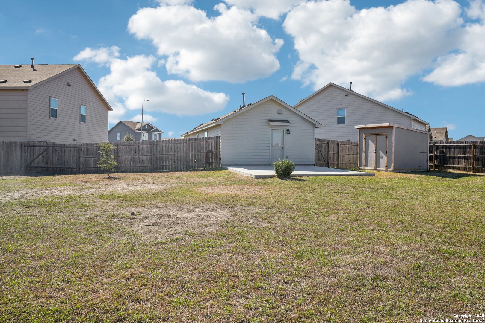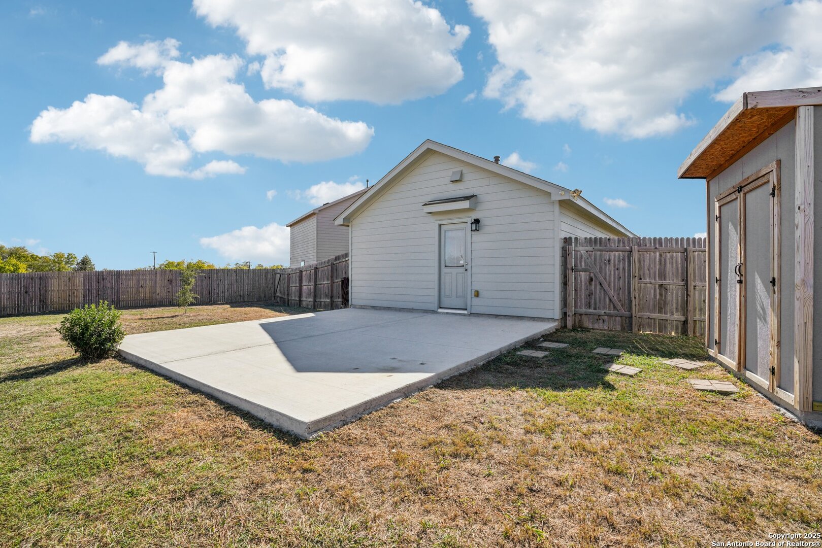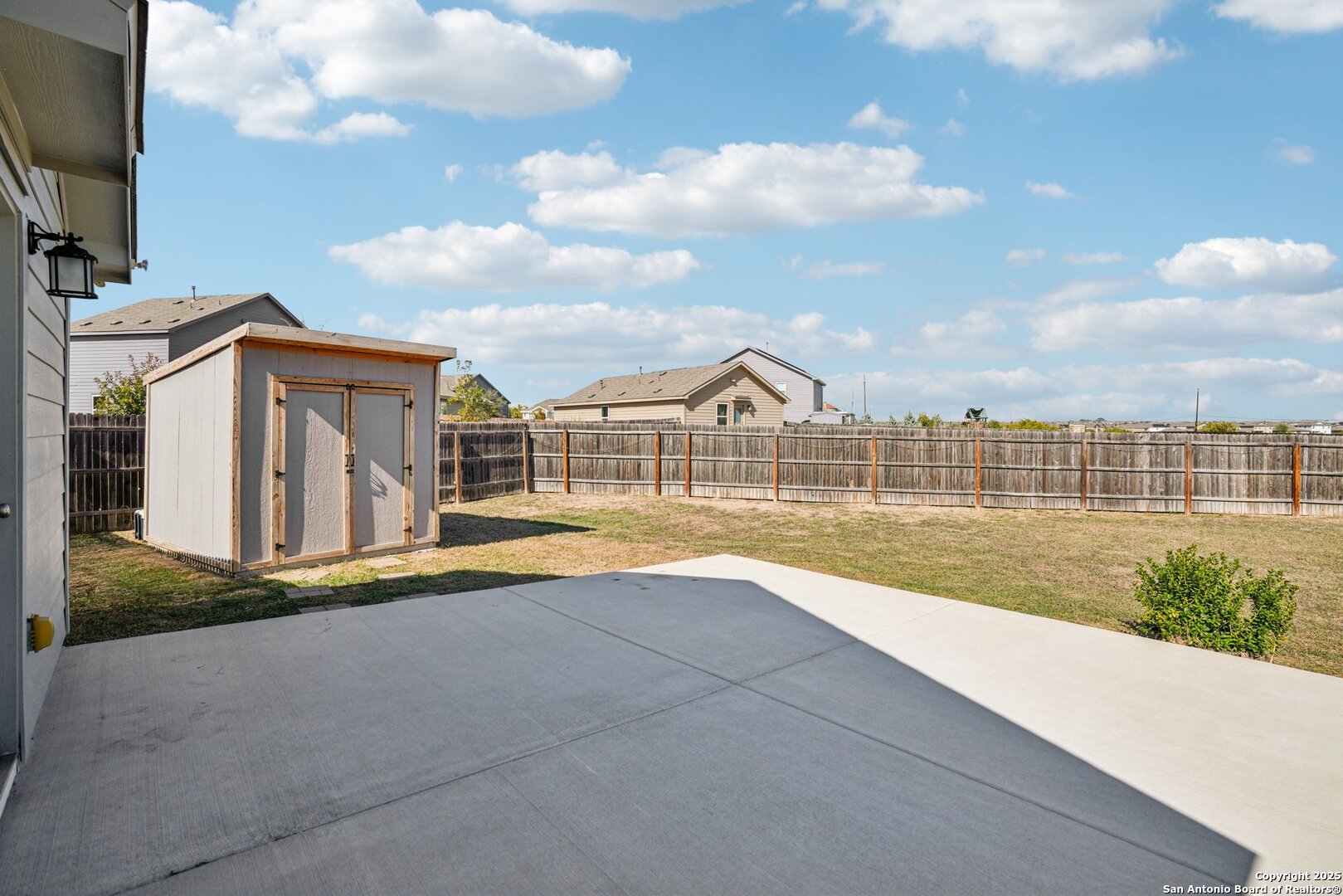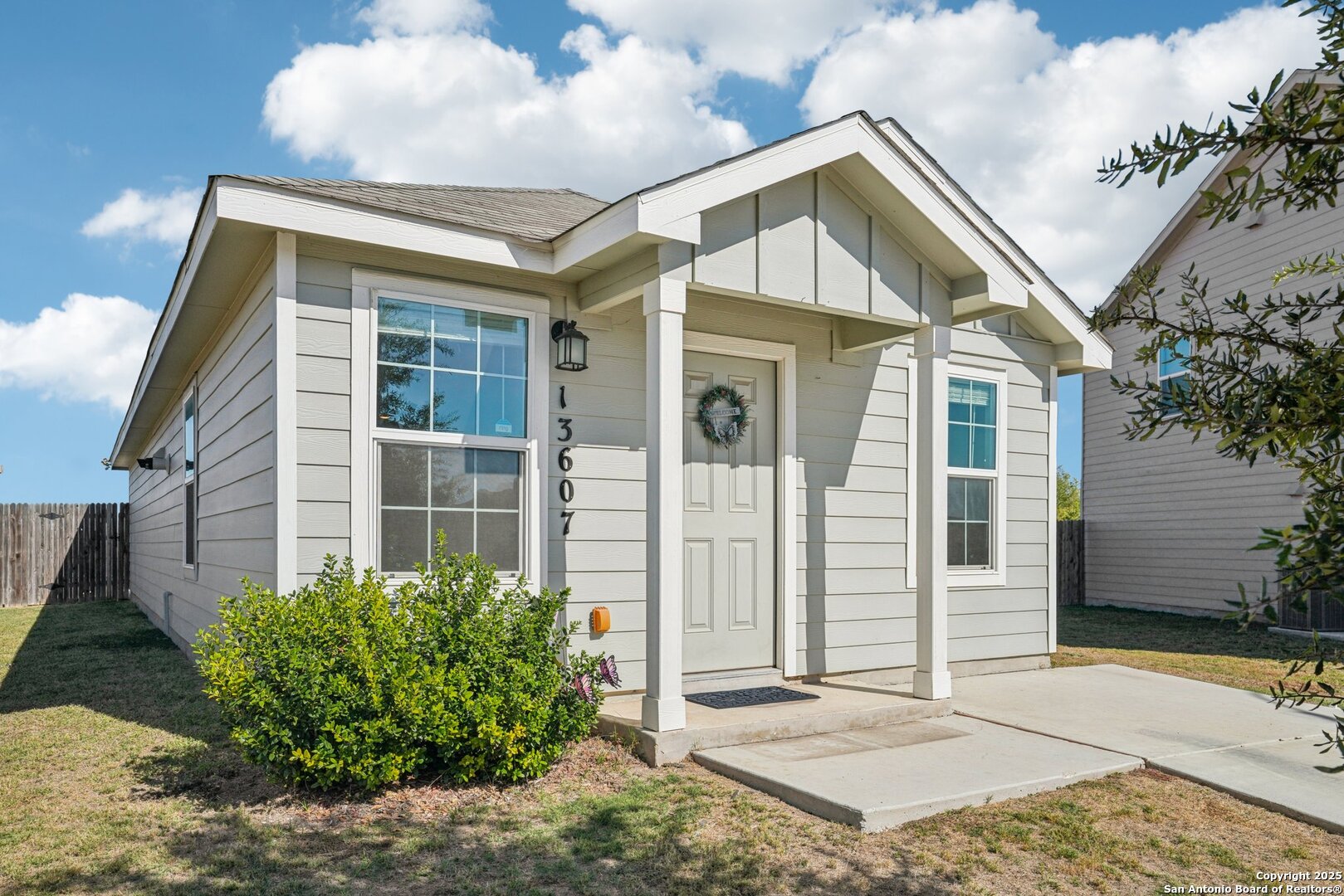 Welcome to 13607 Flock Place situated on nearly a quarter-acre, cul-de-sac lot! Step inside this beautifully maintained three-bedroom, two-bathroom home, and instantly fall in love! Built in 2020, this home feels like new and has been lovingly cared for, offering a fresh and inviting atmosphere from the moment you walk in. The open-concept layout creates a seamless flow between the main living and dining areas, making it the perfect space for entertaining or relaxing. The kitchen is a standout, featuring sleek granite countertops, stainless steel appliances, ample cabinet and counter space, and gas cooking-a dream for any home chef! Down the hall, you'll find two well-appointed secondary bedrooms and a full guest bathroom. The spacious primary suite is a private retreat, complete with an en suite bathroom featuring a single-sink vanity and a shower/tub combo for ultimate convenience. Step outside to enjoy a near quarter-acre backyard complete with a 20x20 patio, shed, and yard lighting - perfect for outdoor dining, weekend BBQs, or relaxing under the Texas sky. Beyond the home itself, Silo residents enjoy access to top-notch amenities, including a state-of-the-art fitness center, a sparkling community pool, and a playground-perfect for staying active and enjoying the outdoors. The new onsite elementary school located just a half mile away. Plus, the community's prime location just off Highway 90 makes commuting a breeze, with Lackland Air Force Base and other major employers a short drive away. If you're looking for a move-in-ready home in a vibrant community, this one is a must-see!