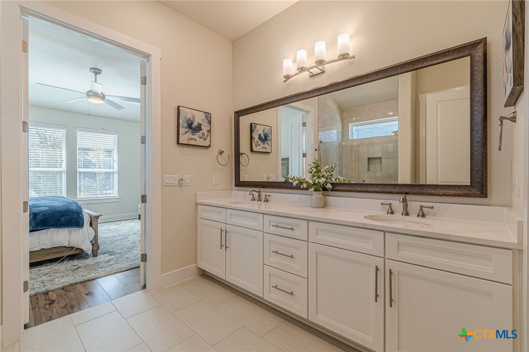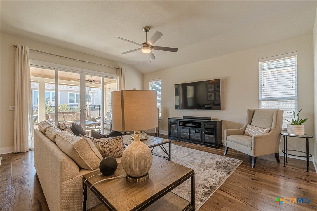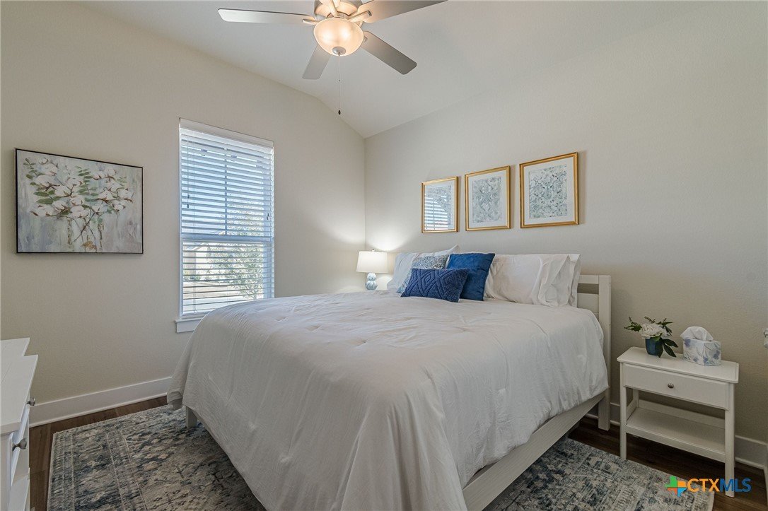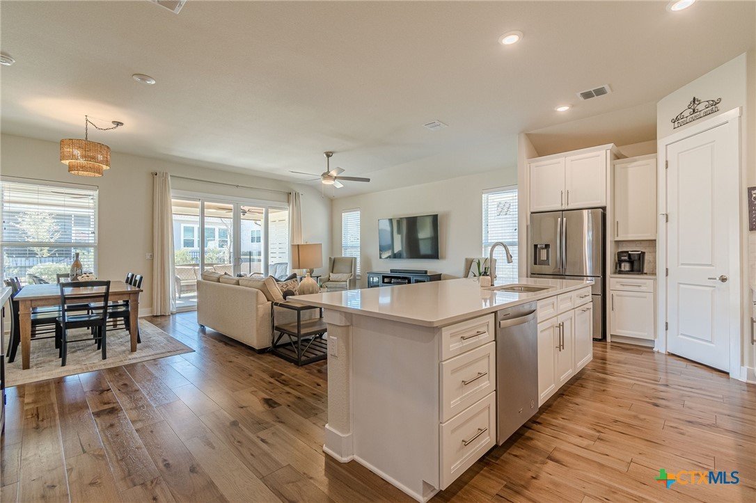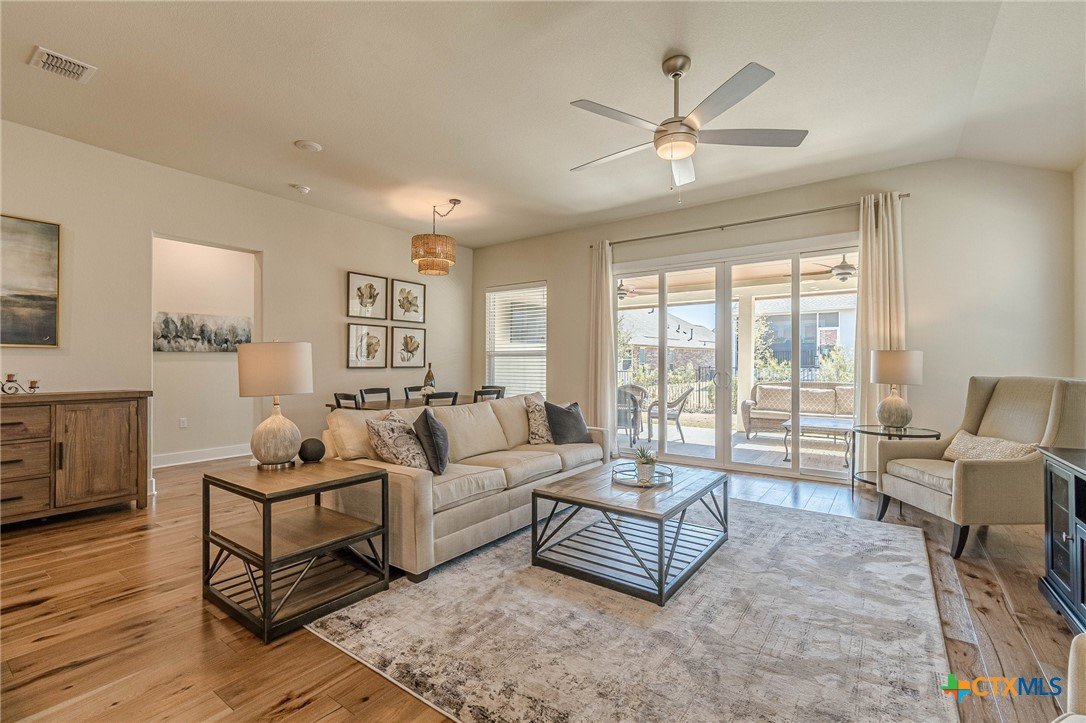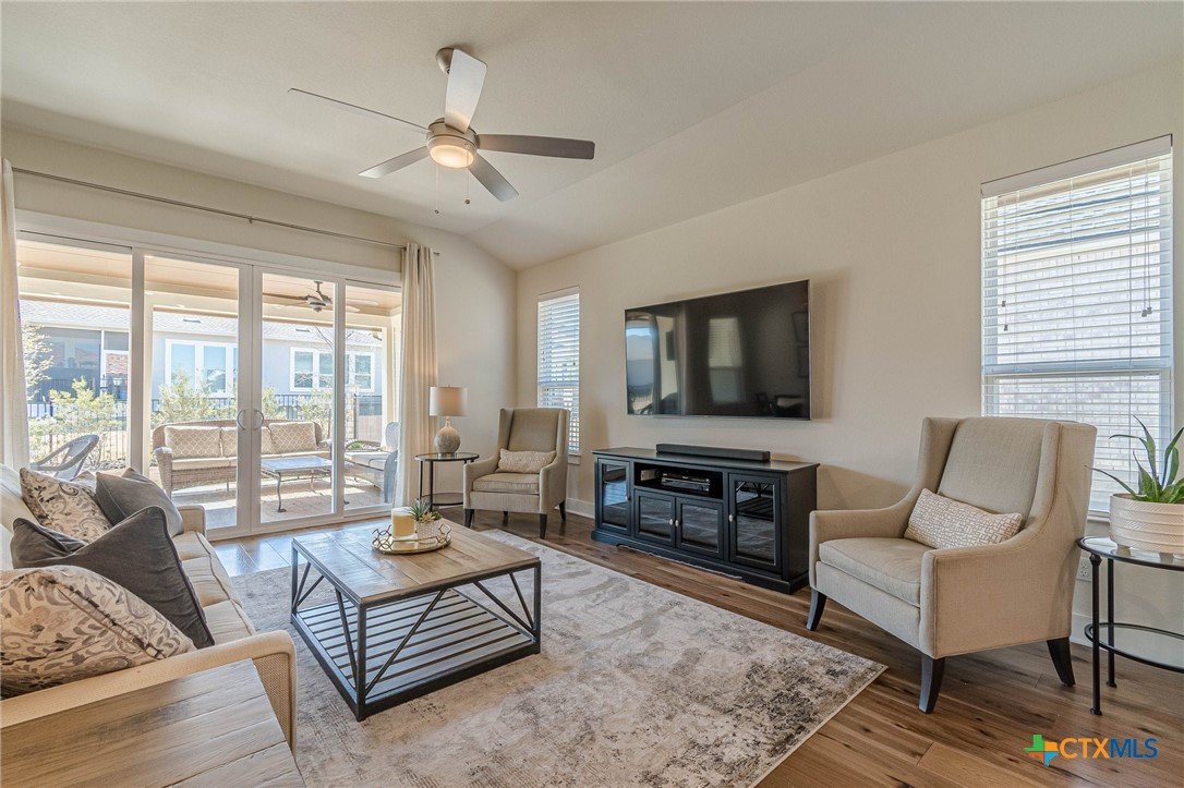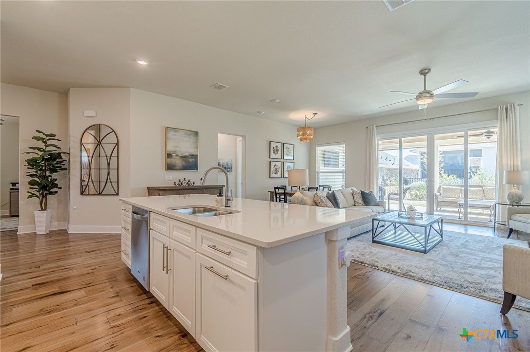 Excellent opportunity to own this spacious and open floorpan in the prestigious Kissing Tree community. Beautiful neutral designer colors throughout including the white cabinets, light granite counters and the beautiful light wood floors throughout - and tile flooring in the wet areas, and upgraded selections with tile to ceiling in bathroom tub/shower spaces. The large open kitchen/living/dining with the study off this main living area makes this home living expansive and impressive! Both the main and guest bedrooms offer generous space to fit a king bed! Live your best life with your extended outdoor living space that you can relax with a coffee, or entertain friends with plenty of room for all. This very active adult community offers scheduled events, clubs & groups, a golf course, fitness center, community restaurant, bocce ball, dart depot, art studio, library and SO much more! Call now to see this beautiful property.