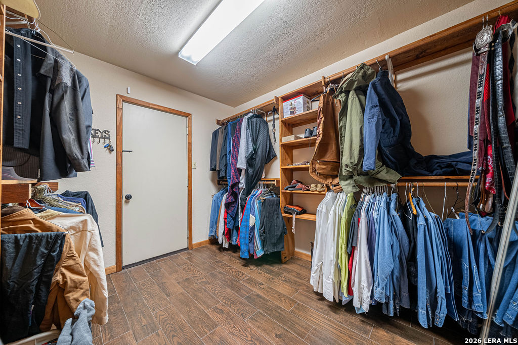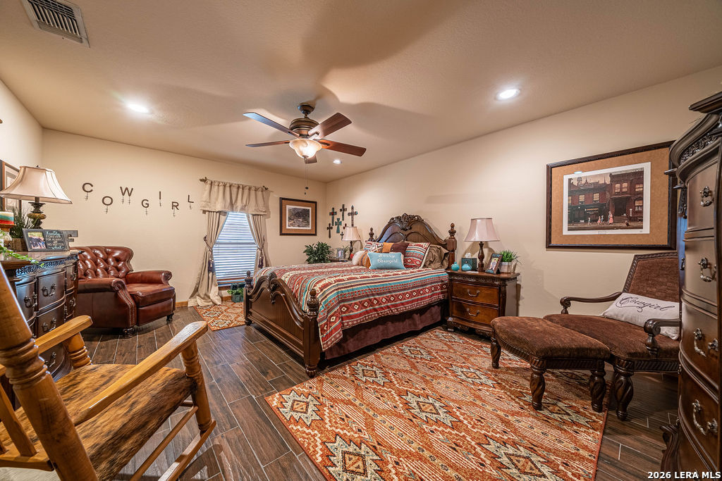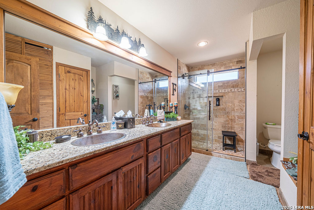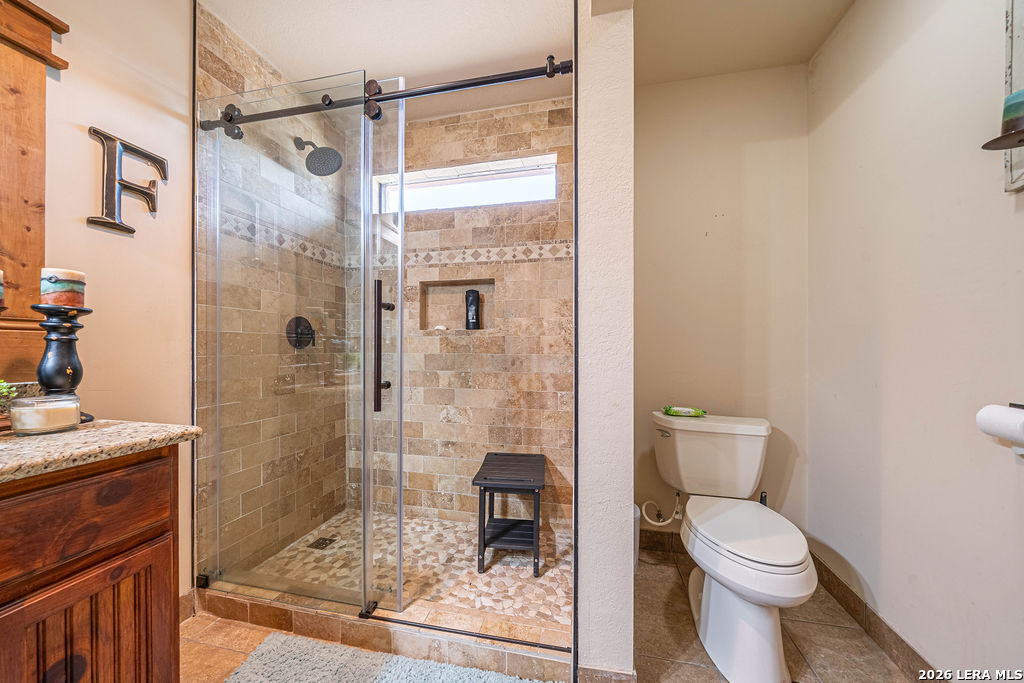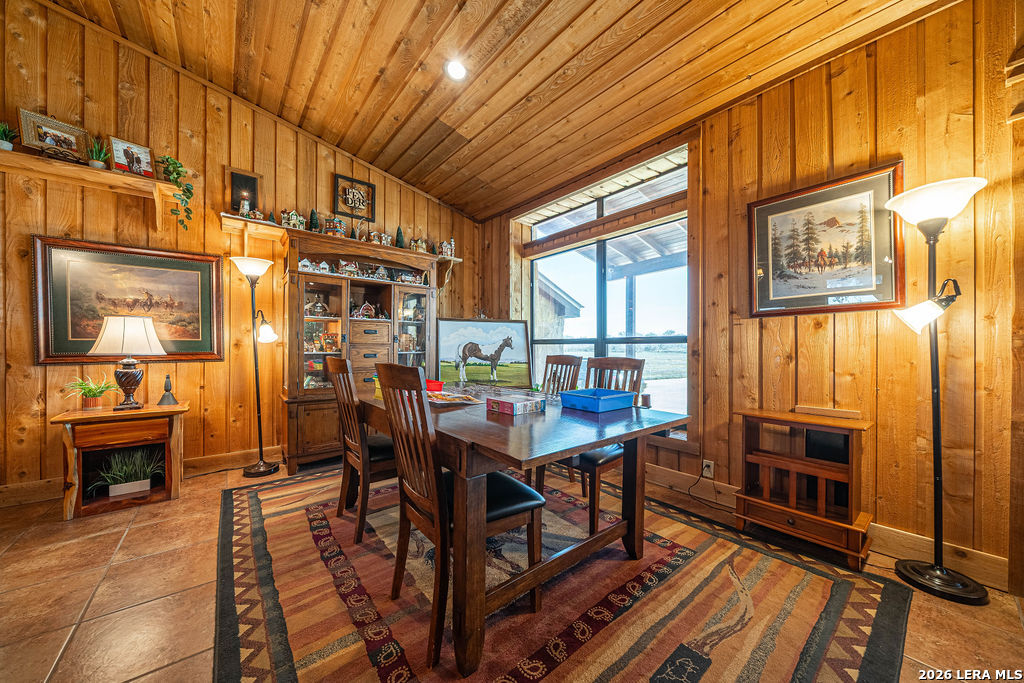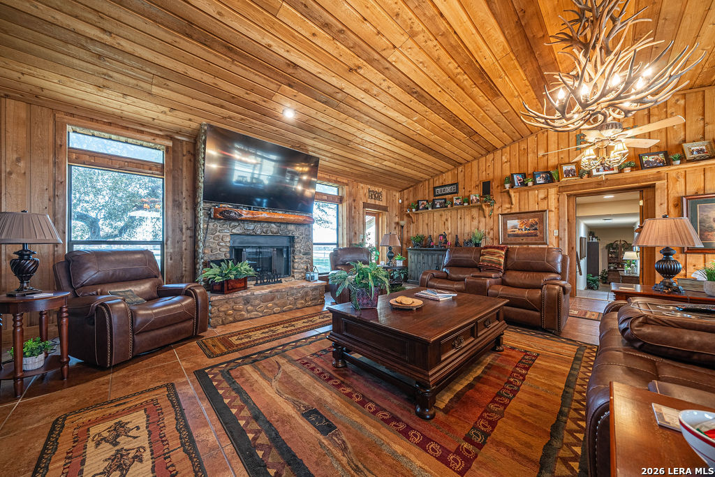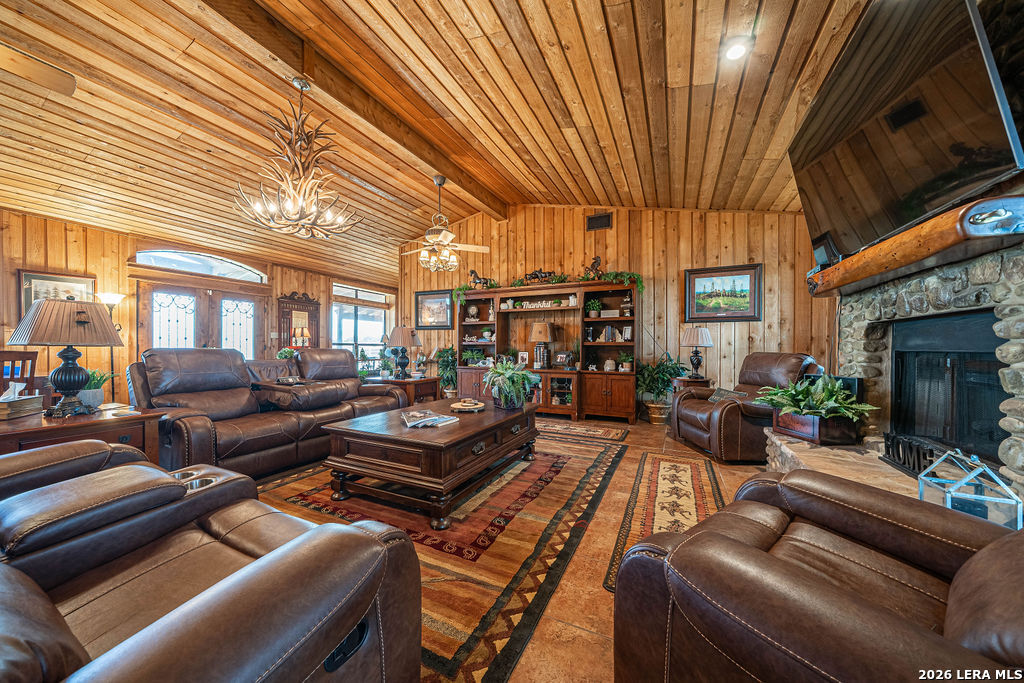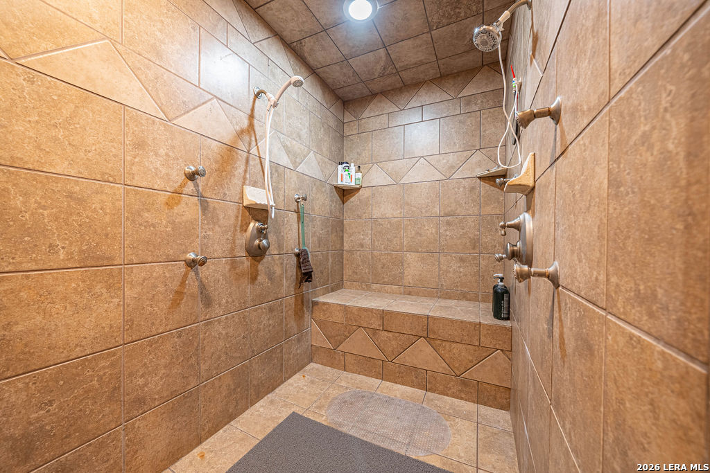 : This remarkable 26 acre ranch is located on Highway 87 in between La Vernia and Adkins Texas. Enter through the electric gate surrounded by decorative rock fencing with pipe fence frontage. The paved driveway is fenced on both sides to keep the animals safe from vehicles. The immediate compound is surrounded by 3 rail horse and ranch fence that prevents horses or cattle from getting too close. The concrete pad and large approach to the shop creates a large number of parking spaces for cars or trailers. The durable and low maintenance standing seam metal roof protects both the home and shop/entertainment barn. Entering the home you are greeted by the warmth of cedar covered walls and ceiling with a large rock fireplace and ceramic tile floors. Veer to the left of the entrance and you will fall in love with this massive dream kitchen. Offering granite counter tops and so much cabinets space. Large island with seating space as well as a large dining area surrounded by windows. The vintage lantern lighting accents the warm cedar walls and ceiling. There is a full bathroom off the kitchen for convenience since this will be a gathering area for parties and holidays. Walk in pantry and oversized laundry room are in close proximity to the kitchen hub for easy access. You will find a very nice large full bath in between bedroom #2 and #3, both bedrooms are very large with extra large walk in closets. The Master bedroom is colossal and offers an electric fire place to set the mood. You will be very comfortable in the massive master bath that offers "his and her" vanities, very large "his and her" walk in closets and a walk in shower with two shower head and a variety of options for water spray. Head out to the entertainment barn and you will be delighted to find a half bath and an old fashion saloon set up around a pool table and pub tables. You can open it up and have a dance floor and live band here. Head over to the attached workshop and you will find 3 double garage doors that open up for you to store all of your toys or it can be additional dance floor, work space, or convert it to more living space. . This home is being sold fully furnished so all you need to bring is your cowboy hat, boots and jeans. The possibilities are endless. Restaurant and dance hall with saloon. Event venue, Bring your horses and create a riding facility, bed and breakfast or add more structures for rental. Bring your vision and make it happen here.