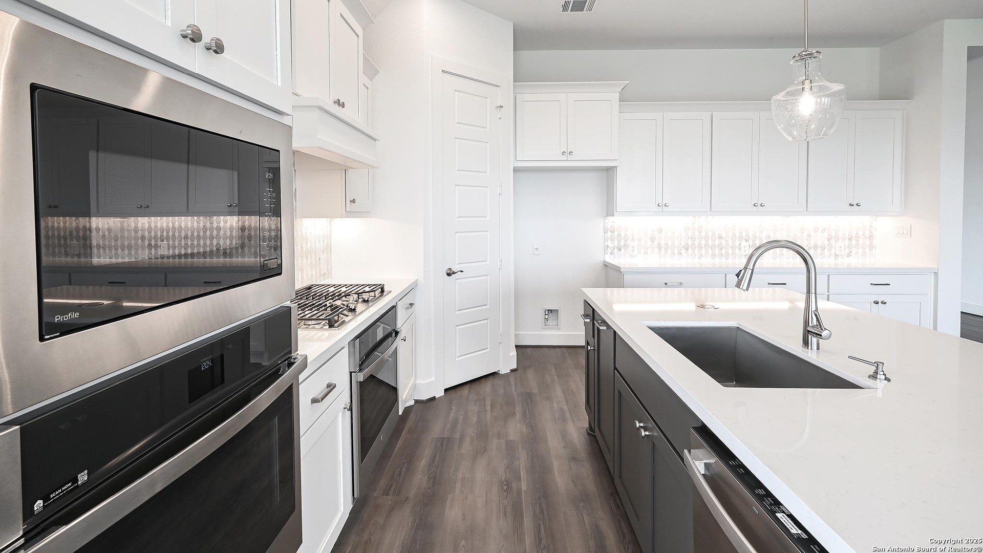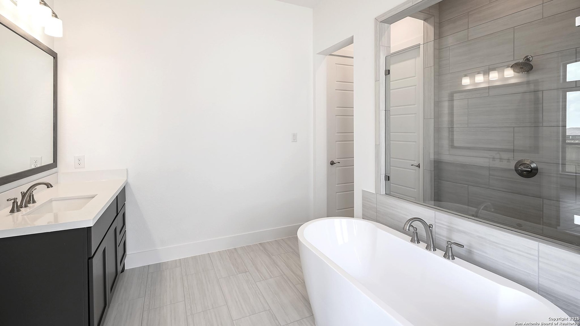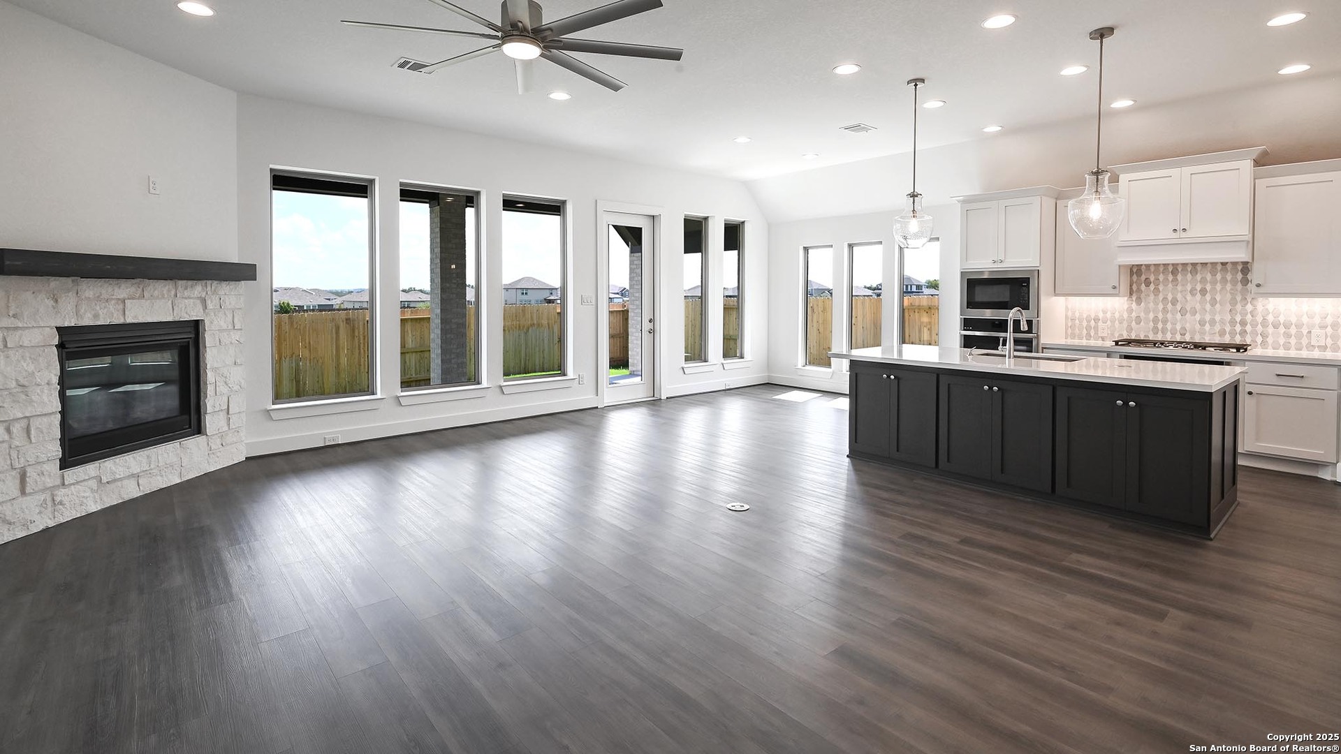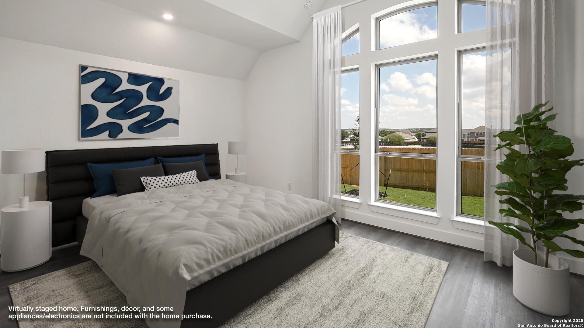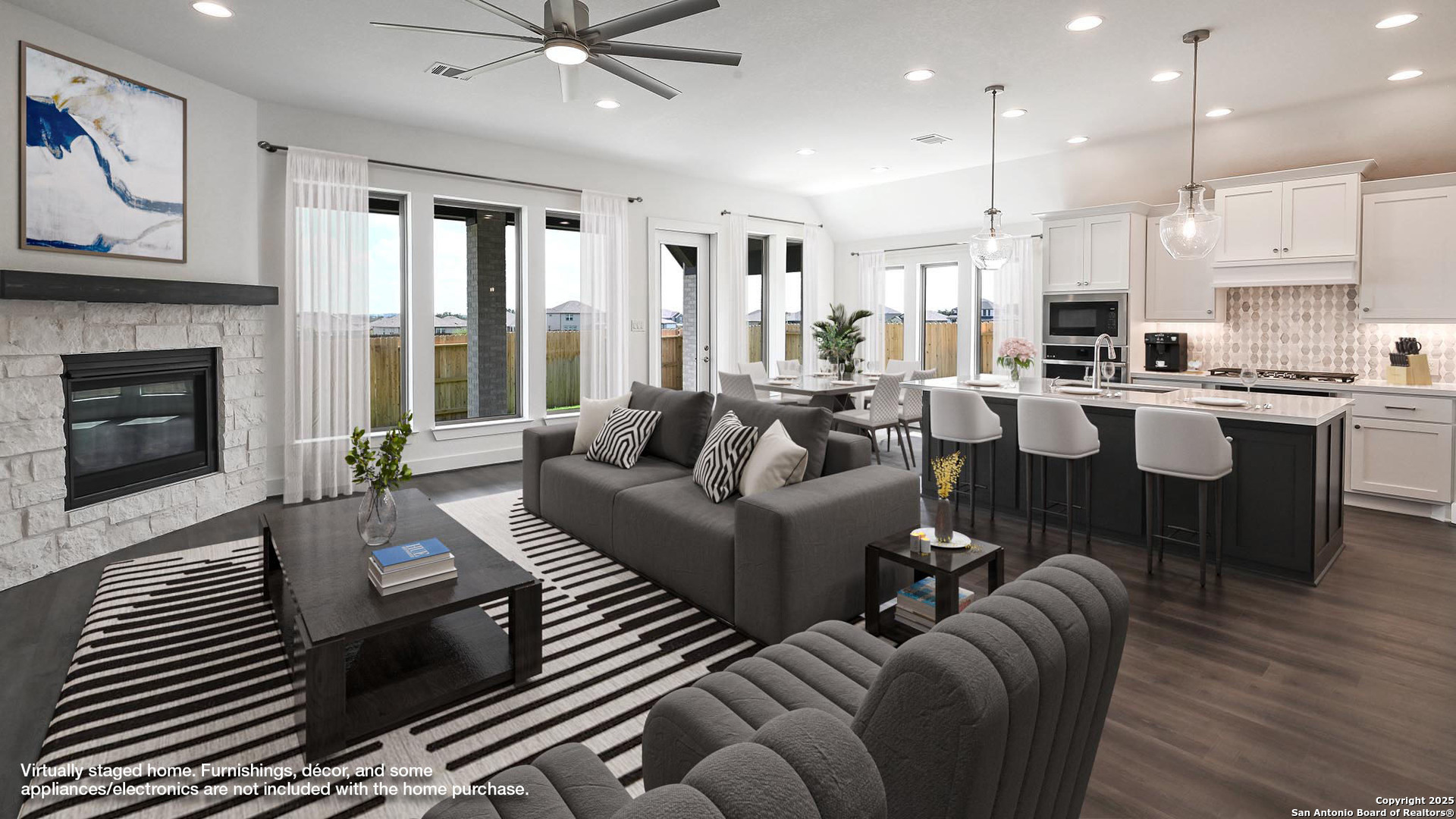 Entry welcomes with 12-foot ceiling. Game room with French doors and 12-foot ceiling off extended entry. Hardwood floors throughout living areas. Kitchen and dining area open to spacious family room with a wood mantel fireplace and wall of windows. Kitchen hosts inviting island with built-in seating space, two wall ovens, and 5-burner gas cooktop. Primary suite includes bedroom with 12-foot ceiling. Double doors lead to primary bath with dual vanities, freestanding tub, separate glass-enclosed shower and two walk-in closets. Abundant closet space and natural light throughout. Extended covered backyard patio. Mud room off three-car garage.