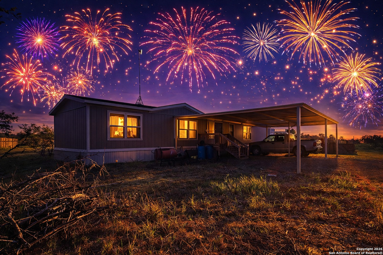 3-bed, 2-bath single-story built in 2022 with approximately 1,568 sq ft on a .64 acre lot framed by mature oaks. The home backs to open ranch land for a private, natural backdrop, and the included wildlife feeder regularly draws deer and javelina. Inside, spaces are comfortable and practical, with an easy flow to the covered back porch for relaxing and watching nature. Two large carports provide abundant covered parking and extend shelter over the rear patio. Enjoy room to spread out, shady trees, and a setting that feels away from it all while still offering everyday convenience.