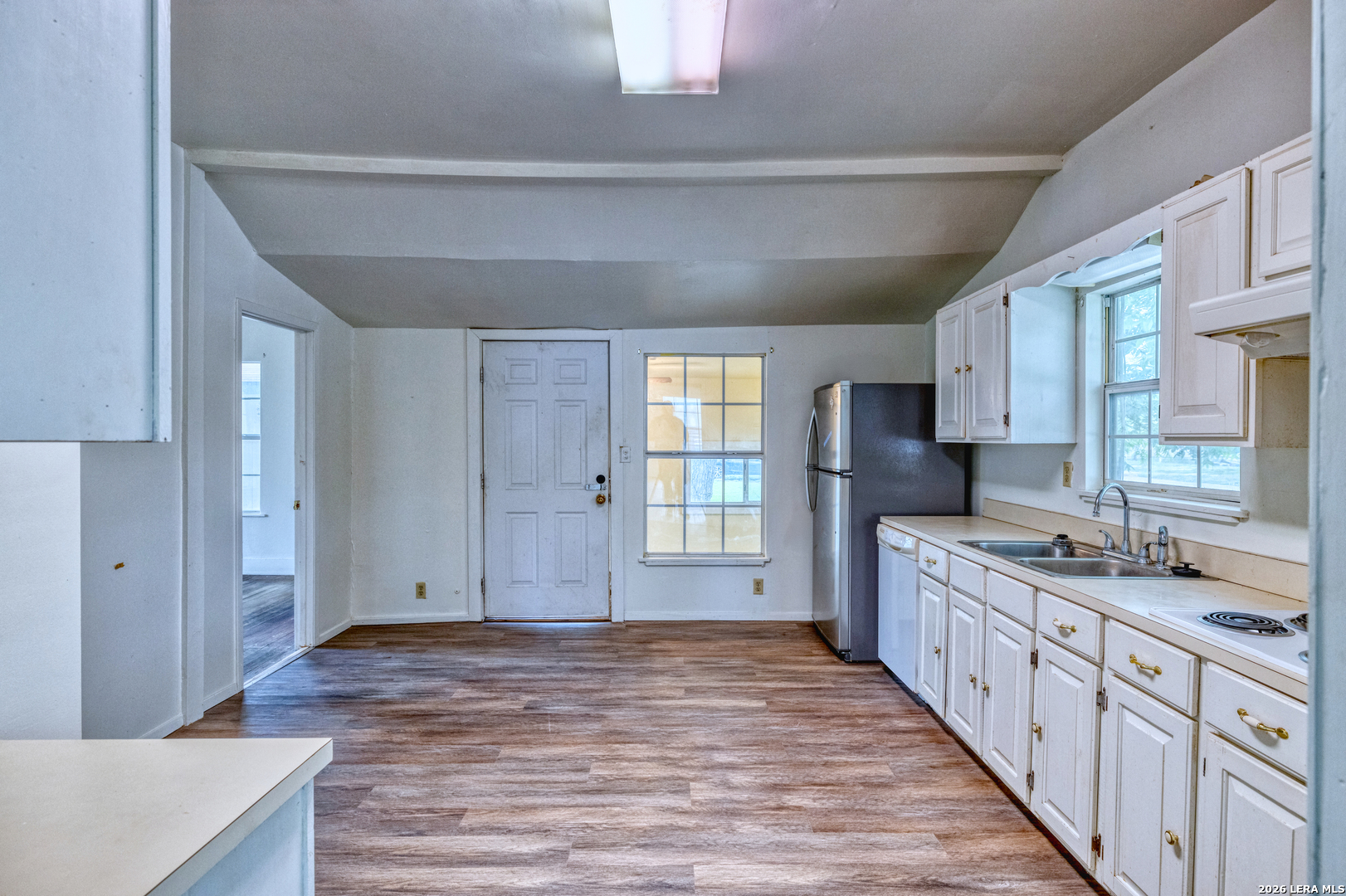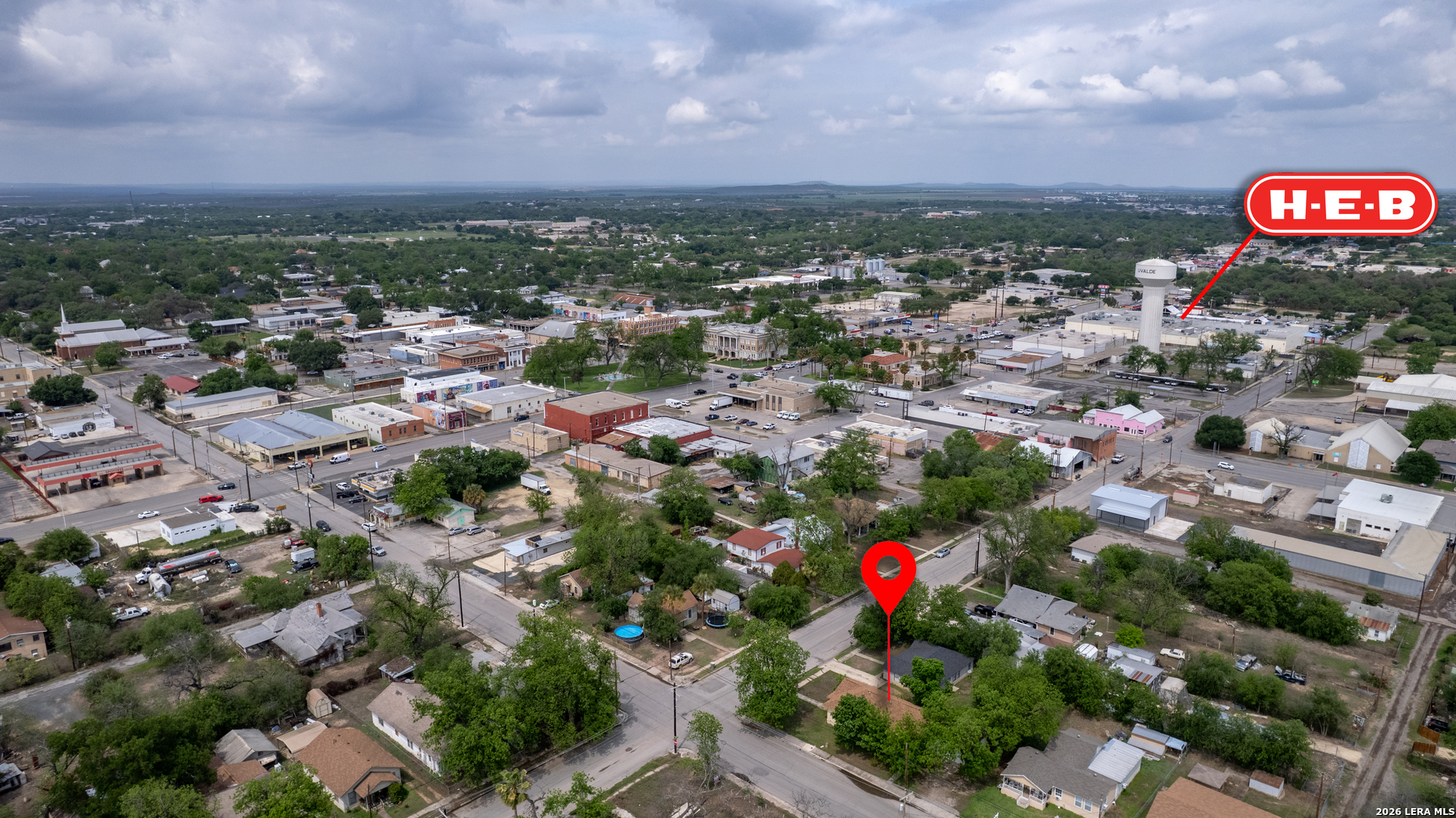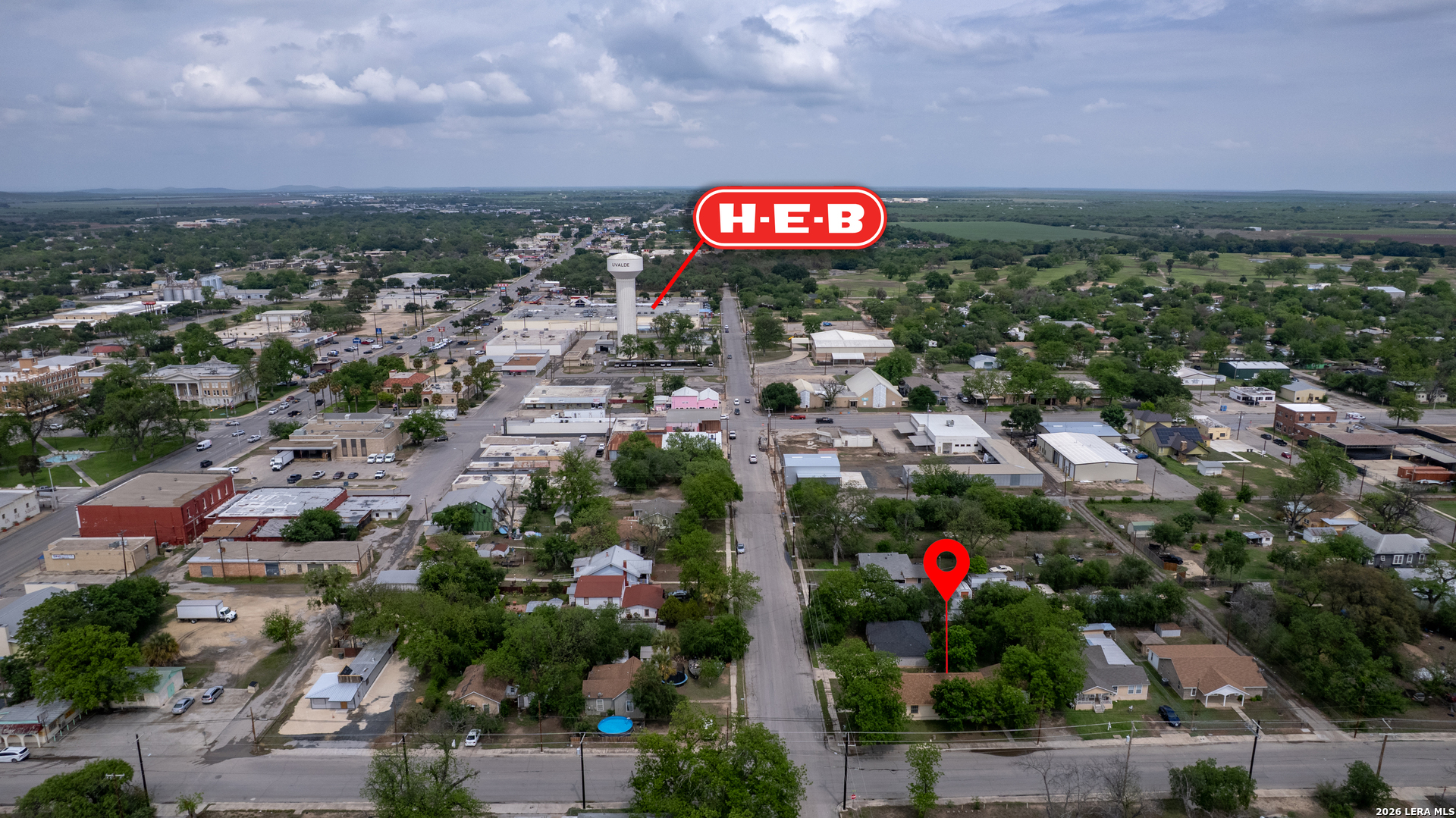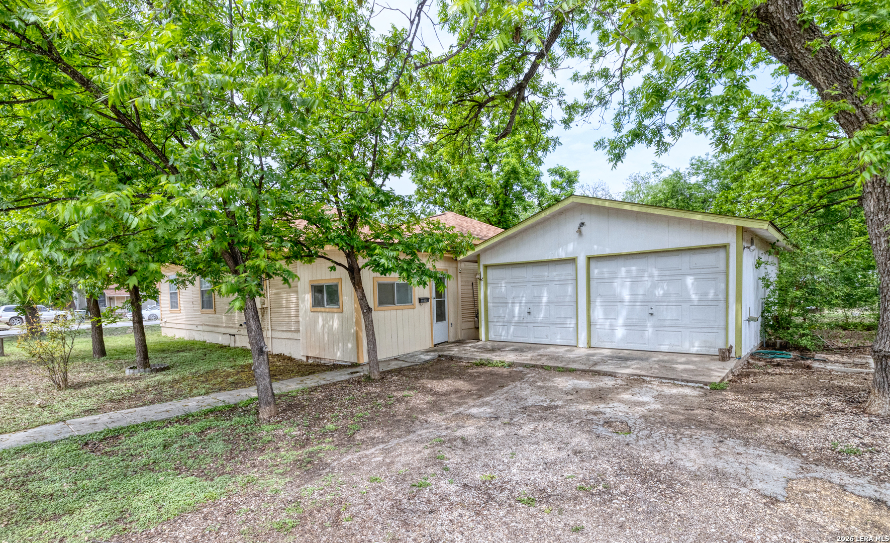 Charming 2-bedroom, 1-bath pier and beam home situated on a desirable corner lot in the heart of Uvalde. This property features numerous updates including energy-efficient windows, a recently installed roof, and central air and heat for year-round comfort. Inside, you'll find fresh interior and exterior paint, original hardwood floors through most of the home, and a functional layout with separate living and dining areas. The spacious kitchen offers abundant cabinetry, generous counter space, a pantry, and includes a refrigerator, cooktop, and built-in oven. A dedicated area provides the perfect setup for a coffee bar or additional storage. Both bedrooms are generously sized with ample natural light and each features dual closets. The bathroom includes a walk-in shower, and an attached laundry room is conveniently located just off the kitchen. Outside, the property is shaded by several mature trees and includes a two-car detached garage. Ideally located just two blocks from Uvalde's historic downtown area, public library, and city amenities, and only three blocks from HEB. The property is also less than 10 minutes from the newly built hospital and medical facilities. With its central location and functional layout, this home is well suited for a first-time buyer, someone looking to downsize, or as an investment property with strong rental potential.