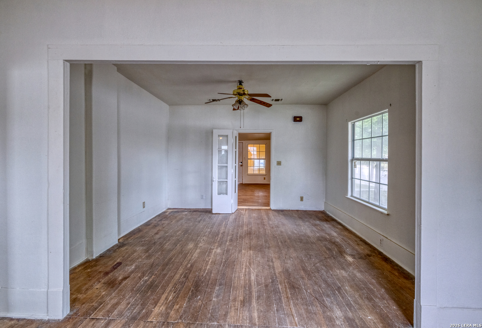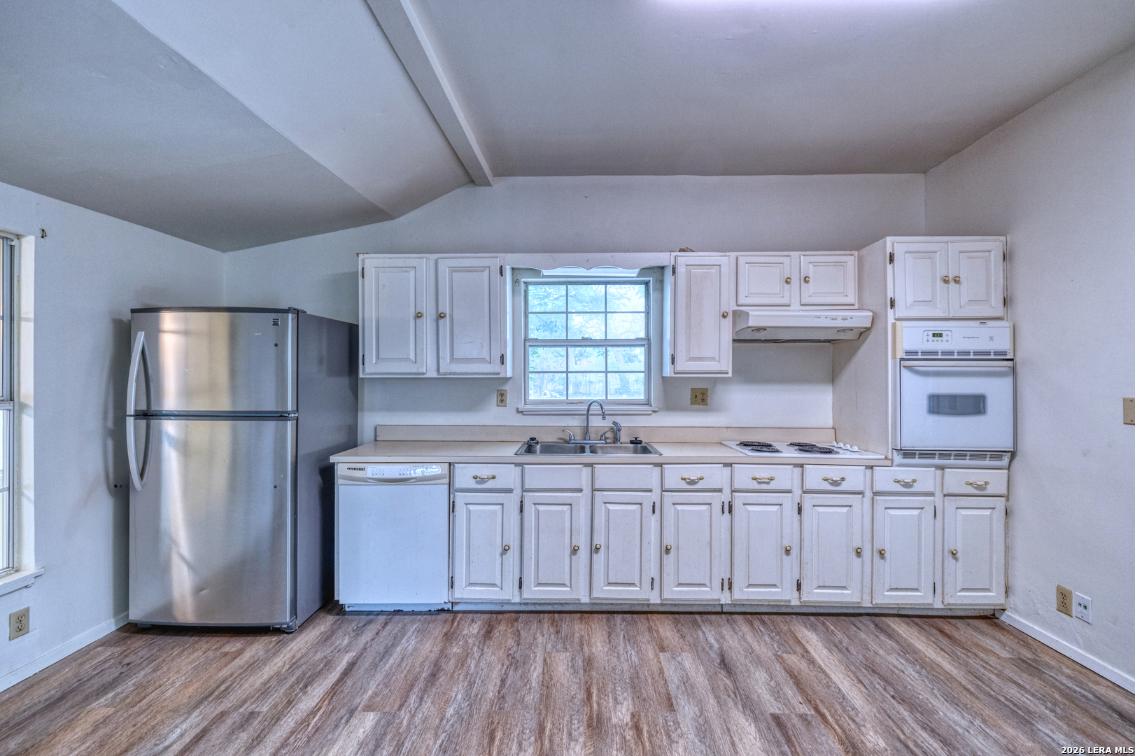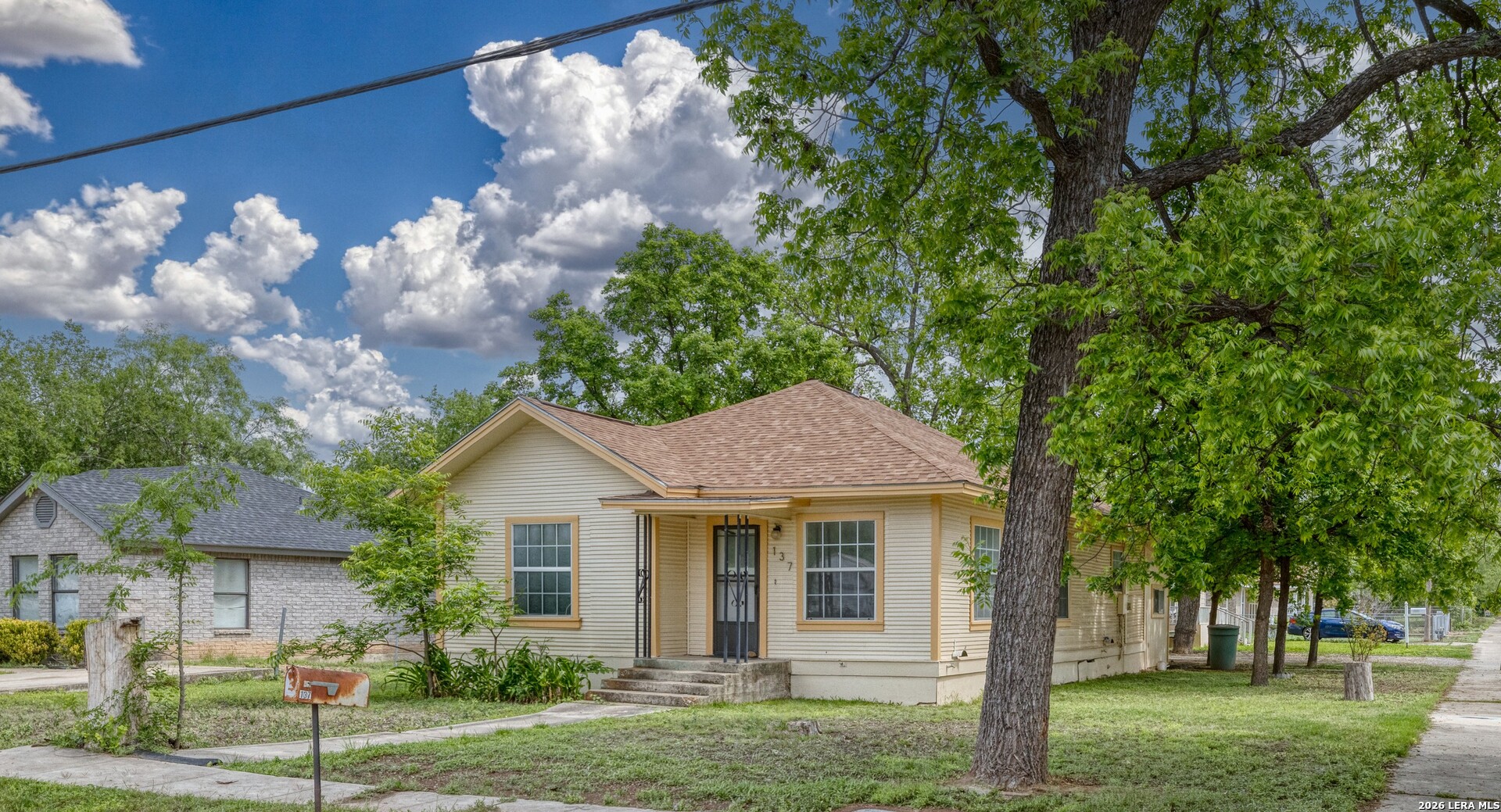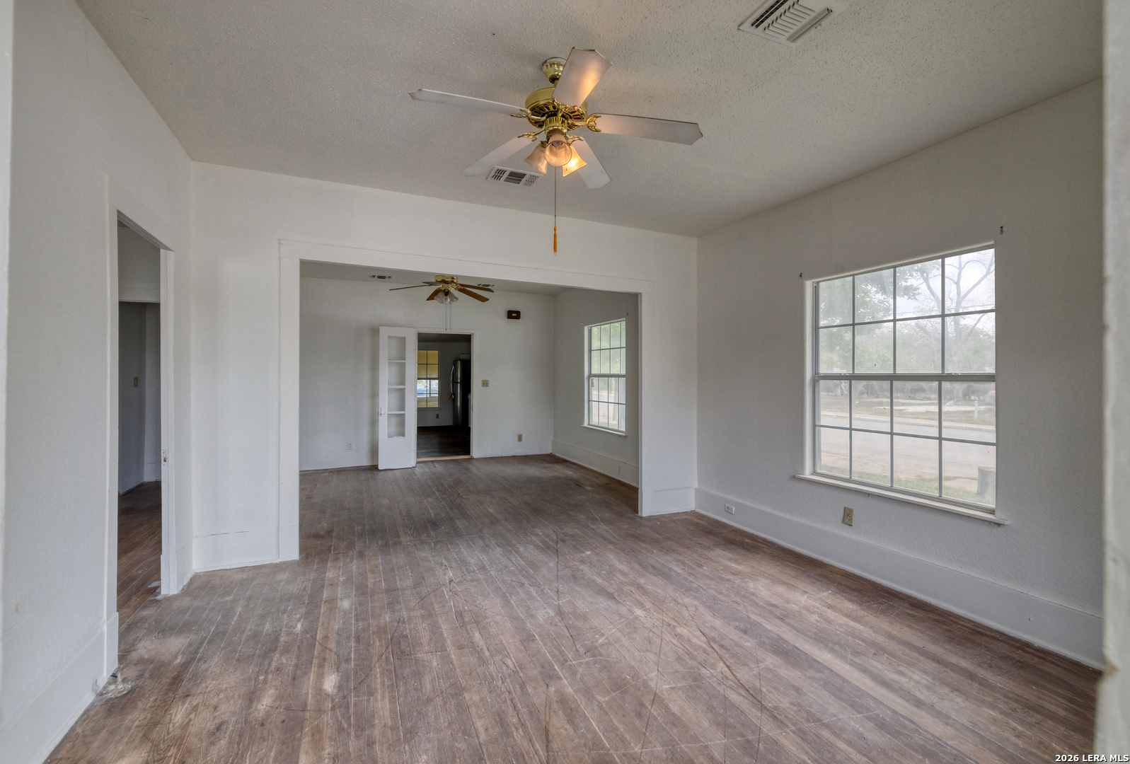 Charming 2-bedroom, 1-bath pier and beam home situated on a desirable corner lot in the heart of Uvalde. This property features numerous updates including energy-efficient windows, a recently installed roof, and central air and heat for year-round comfort. Inside, you'll find fresh interior and exterior paint, original hardwood floors through most of the home, and a functional layout with separate living and dining areas. The spacious kitchen offers abundant cabinetry, generous counter space, a pantry, and includes a refrigerator, cooktop, and built-in oven. A dedicated area provides the perfect setup for a coffee bar or additional storage. Both bedrooms are generously sized with ample natural light and each features dual closets. The bathroom includes a walk-in shower, and an attached laundry room is conveniently located just off the kitchen. Outside, the property is shaded by several mature trees and includes a two-car detached garage. Ideally located just two blocks from Uvalde's historic downtown area, public library, and city amenities, and only three blocks from HEB. The property is also less than 10 minutes from the newly built hospital and medical facilities. With its central location and functional layout, this home is well suited for a first-time buyer, someone looking to downsize, or as an investment property with strong rental potential.