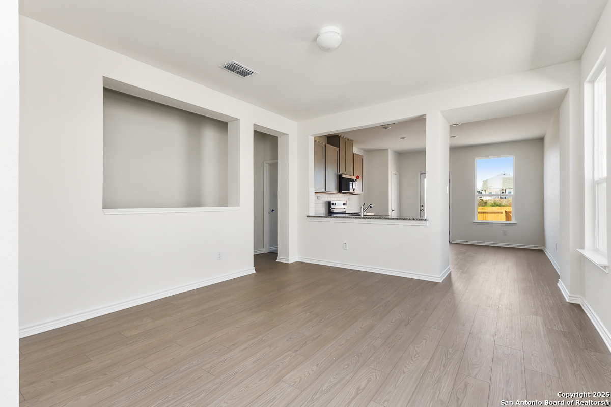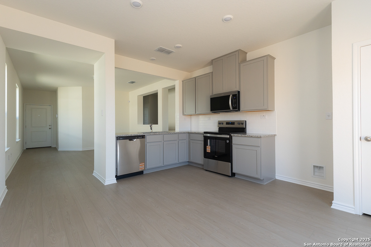 This beautifully appointed home features 9-ft. first-floor ceilings for a spacious, open feel. The kitchen is equipped with Whirlpool stainless steel appliances, Woodmont Dakota Shaker panel 42-in. upper cabinets, a Daltile tile backsplash, and granite countertops in Arctic Pearl. The primary bath offers a raised vanity, upgraded cabinets, and a 42-in. shower with Daltile tile surround. Decorative elements include a Carrara-style entry door, Kwikset Polo knob interior hardware, and vinyl plank flooring in the bathrooms, kitchen, and great room. A wireless security system, fully sodded yard, and automatic sprinkler system complete this inviting home.