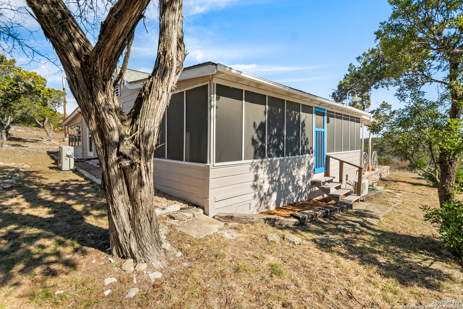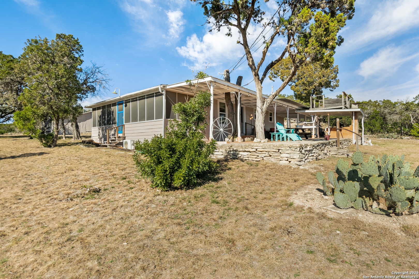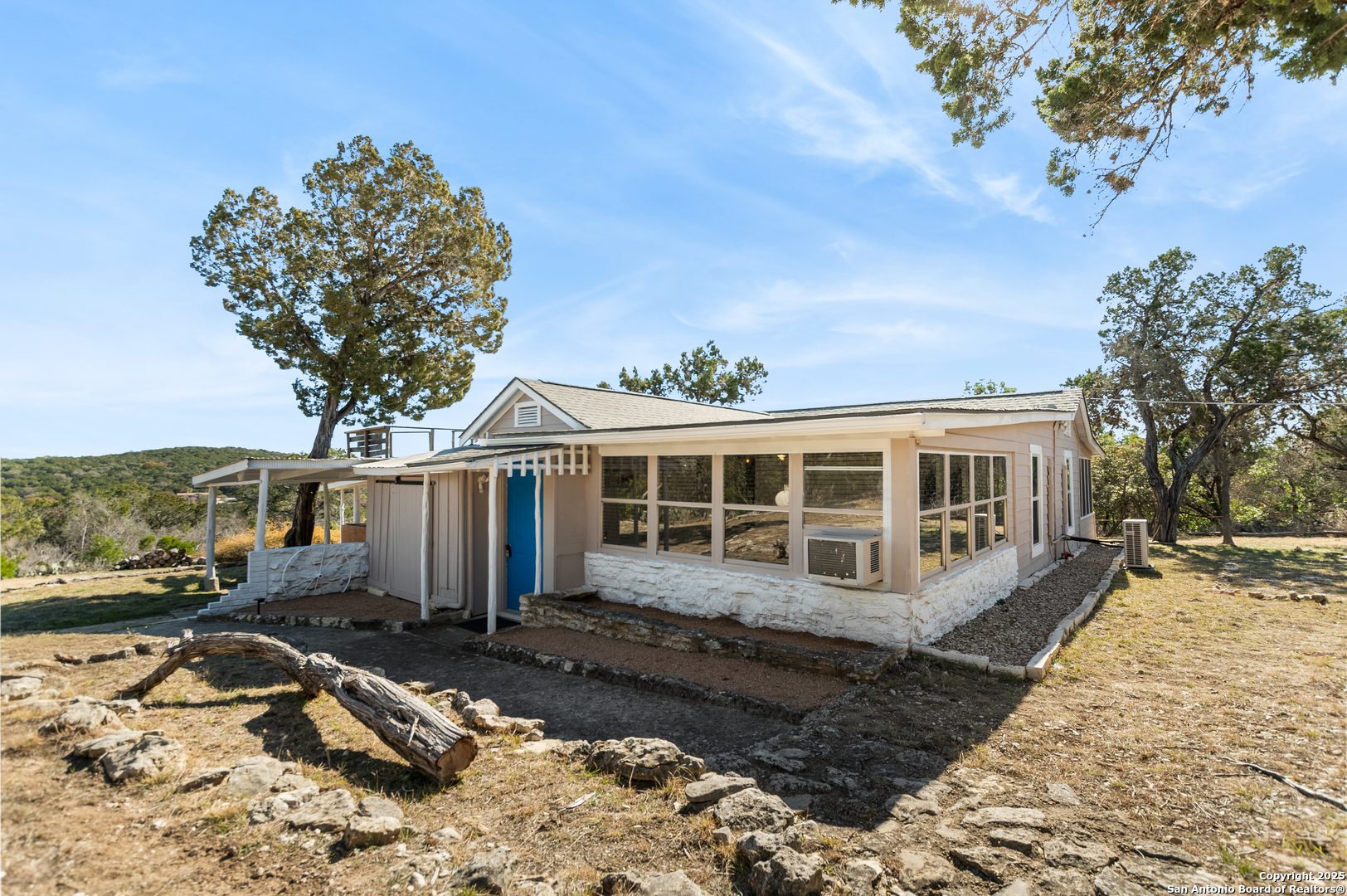 Secluded 2.1-acre retreat overlooking Medina Lake. Perched high with sweeping sunrise views, this charming stone-and-frame cottage offers peace and privacy. The home's character shines through its original stonework, thoughtfully expanded to create a cozy lake view escape. Both bedrooms open to a screened porch with unobstructed lake views, and even the kitchen is positioned to take in the scenery. A unique bird's nest platform provides an elevated perch to enjoy the panorama. Morning light fills the home, while afternoon shade keeps outdoor spaces cool and inviting. A deep private well-recently updated with a new pump and equipment-serves the property. Ideal as a hidden getaway or a tranquil full-time residence, this lake home blends charm, privacy, and unforgettable views.