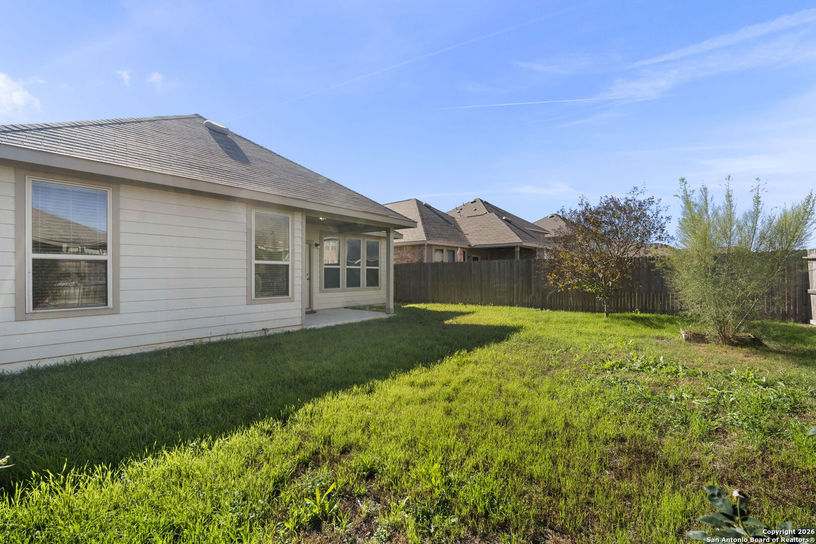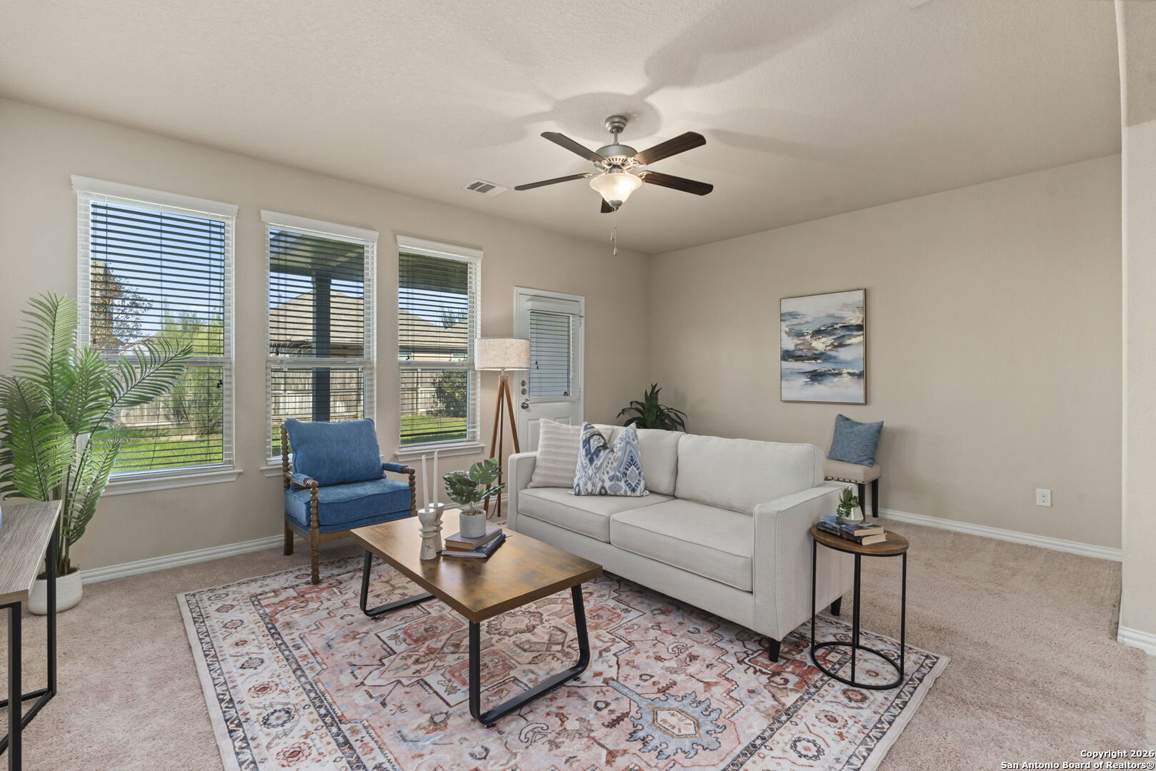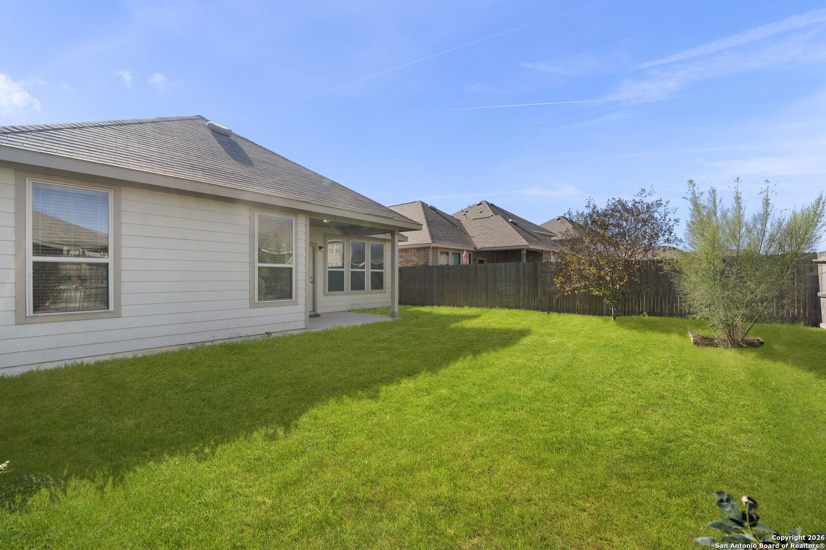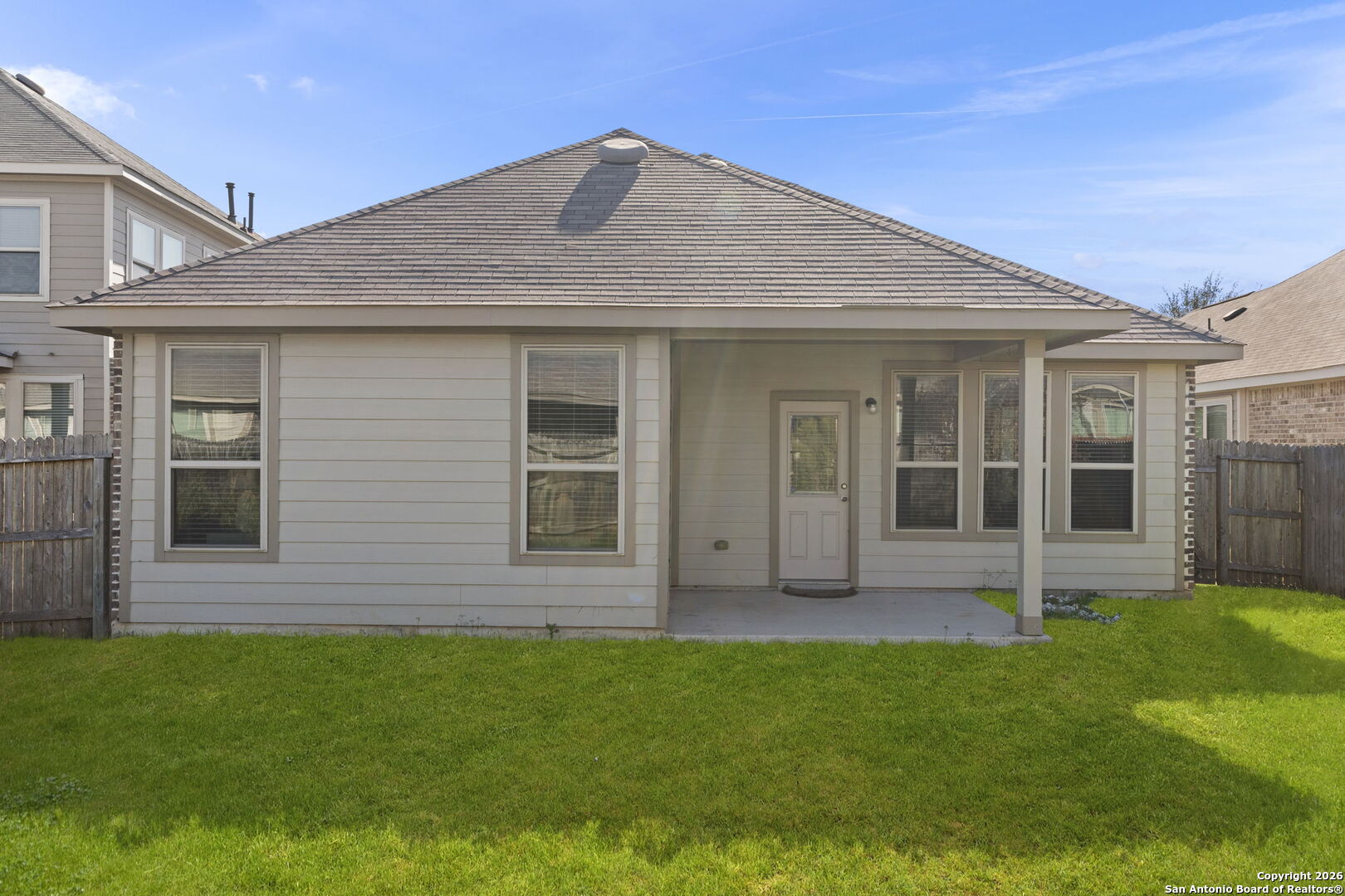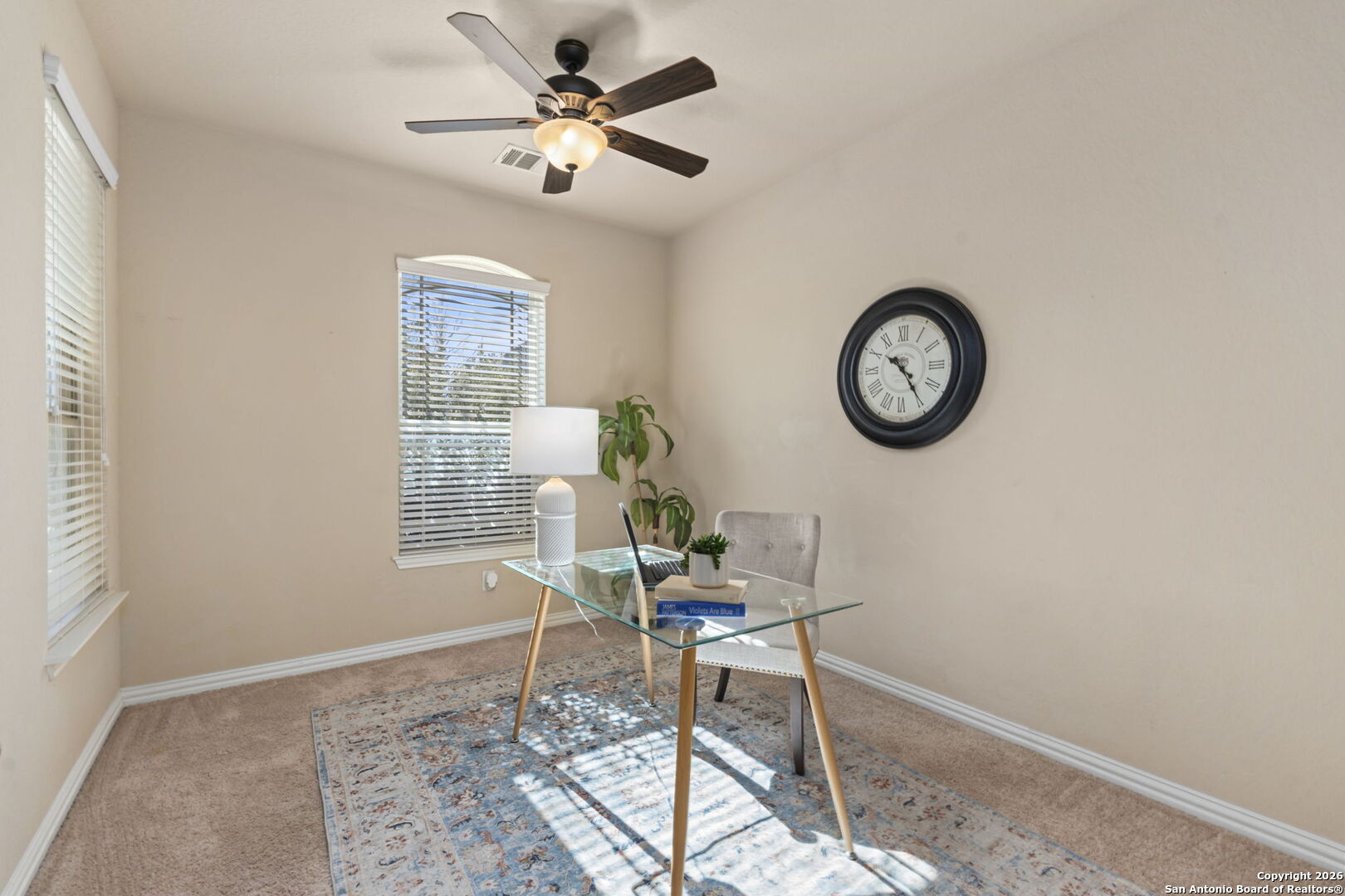 The home opens to a welcoming foyer, where French double doors to the right lead into a light filled office, creating an ideal space for work or study. Continuing forward, the layout unfolds into an open concept kitchen, living, and dining area designed for comfort and connection. The eat in kitchen features a large island, walk in pantry, and abundant cabinet space, while expansive windows throughout the living and dining areas fill the home with natural light. The primary bedroom offers a spacious walk-in closet and a well-appointed bathroom with a soaking tub, stand up shower, and double vanity. Cozy secondary bedrooms provide flexibility for family or guests, and a covered patio overlooks a large lawn, perfect for outdoor relaxation and entertaining.