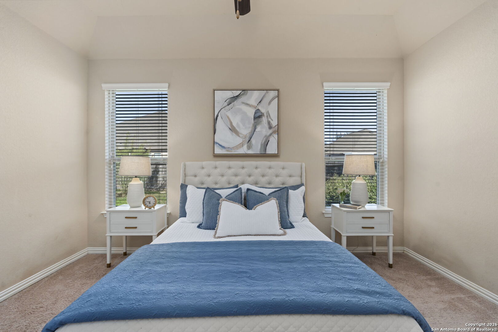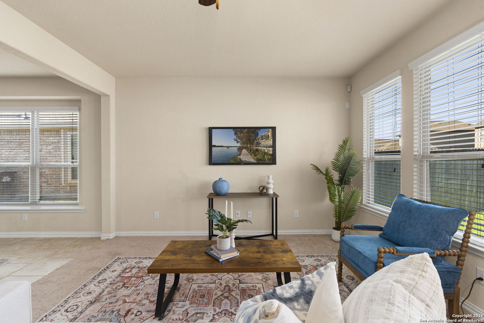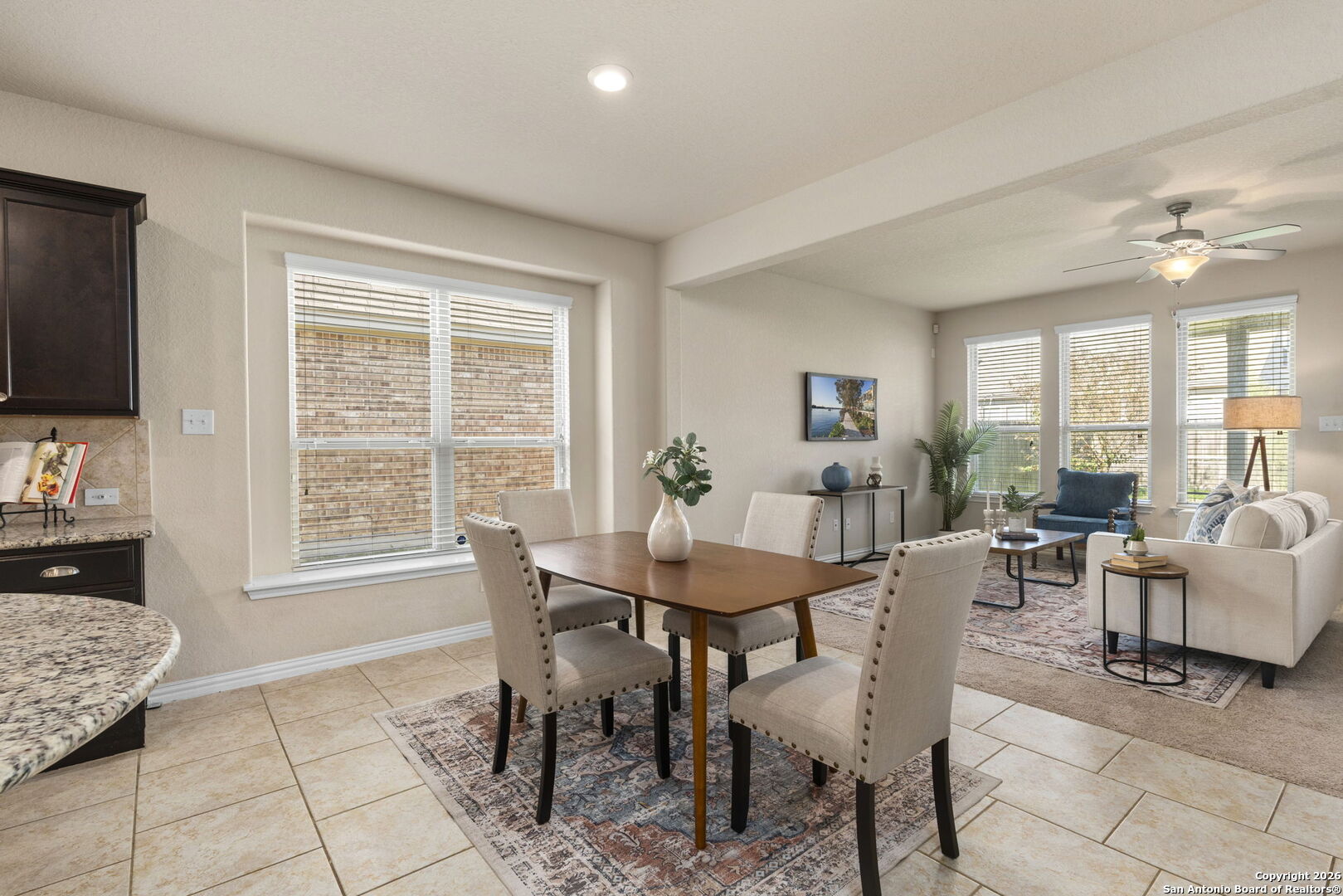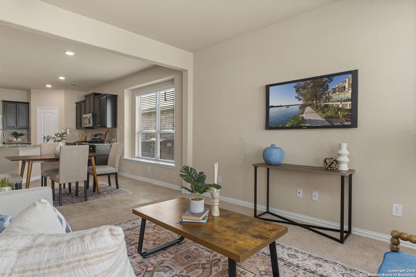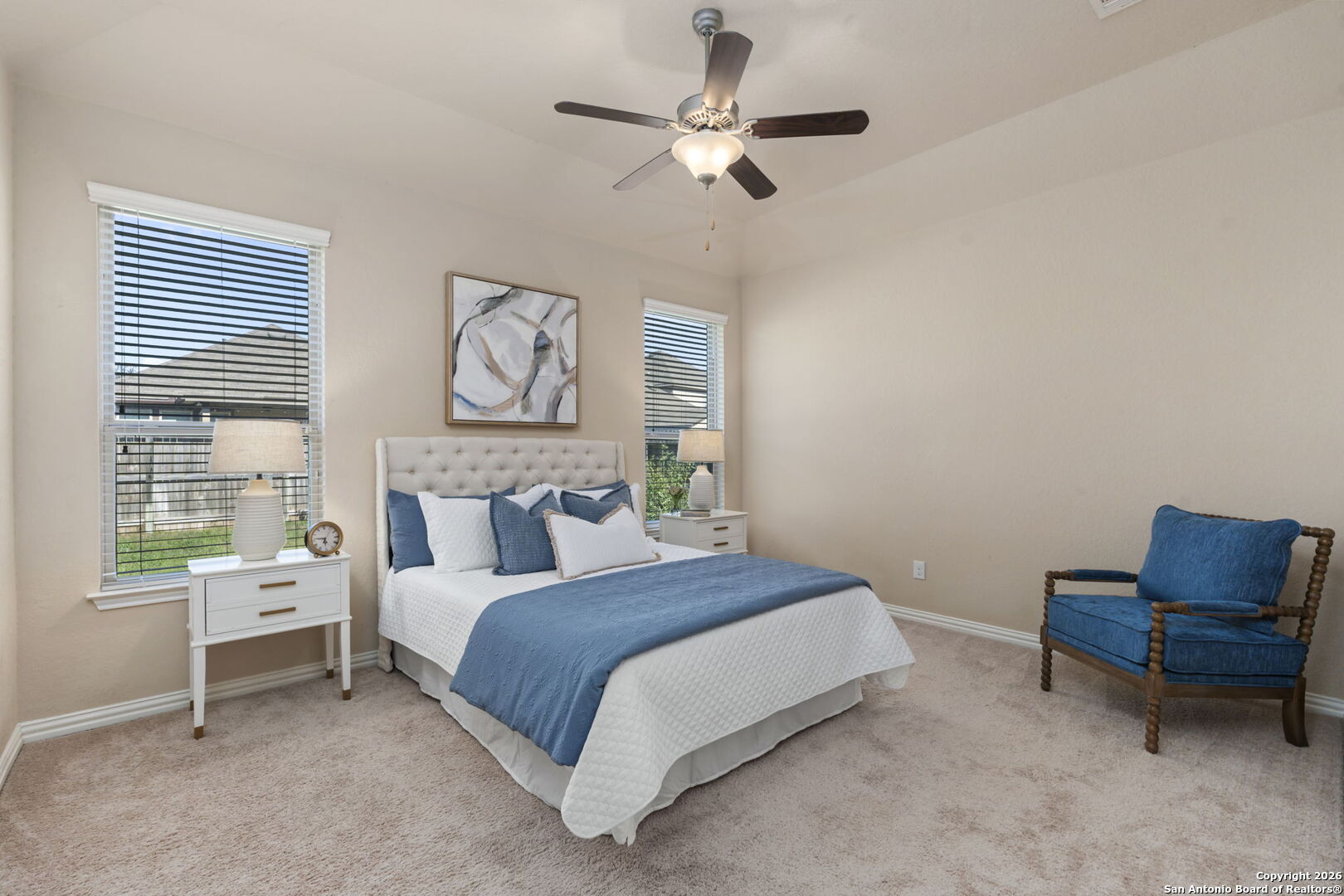 The home opens to a welcoming foyer, where French double doors to the right lead into a light filled office, creating an ideal space for work or study. Continuing forward, the layout unfolds into an open concept kitchen, living, and dining area designed for comfort and connection. The eat in kitchen features a large island, walk in pantry, and abundant cabinet space, while expansive windows throughout the living and dining areas fill the home with natural light. The primary bedroom offers a spacious walk-in closet and a well-appointed bathroom with a soaking tub, stand up shower, and double vanity. Cozy secondary bedrooms provide flexibility for family or guests, and a covered patio overlooks a large lawn, perfect for outdoor relaxation and entertaining.