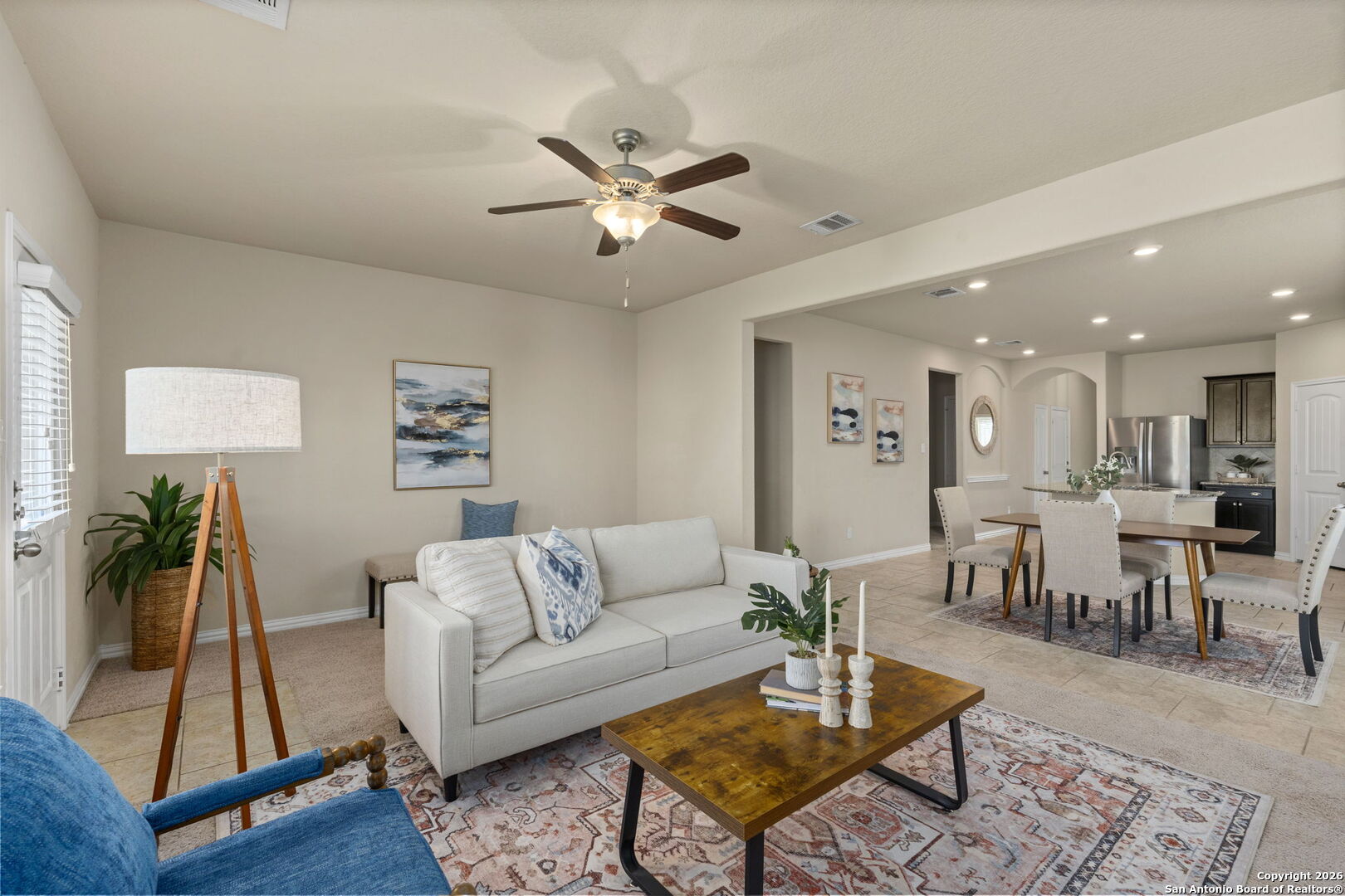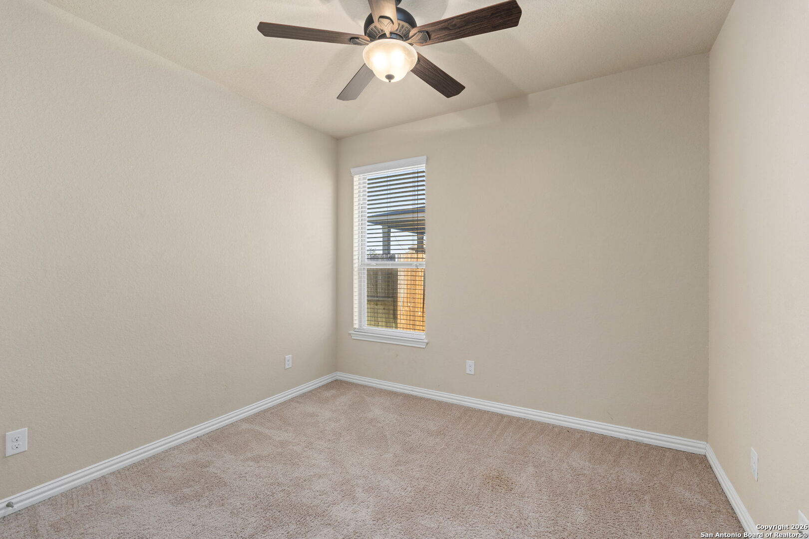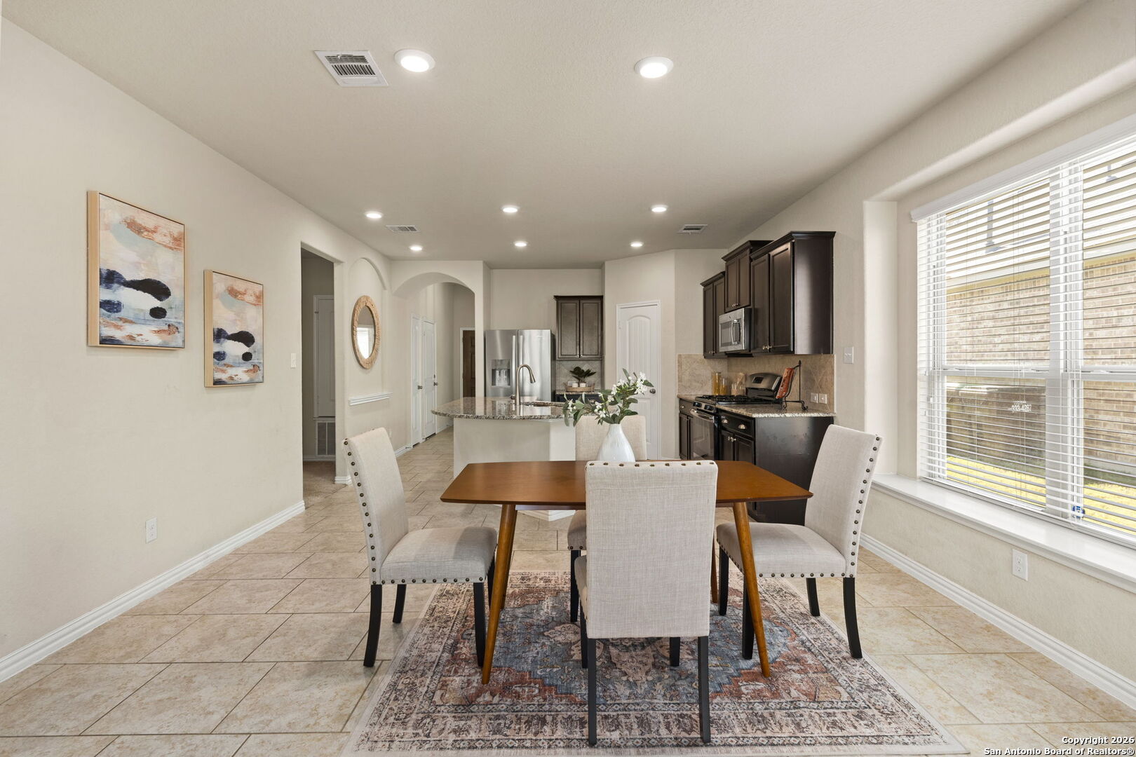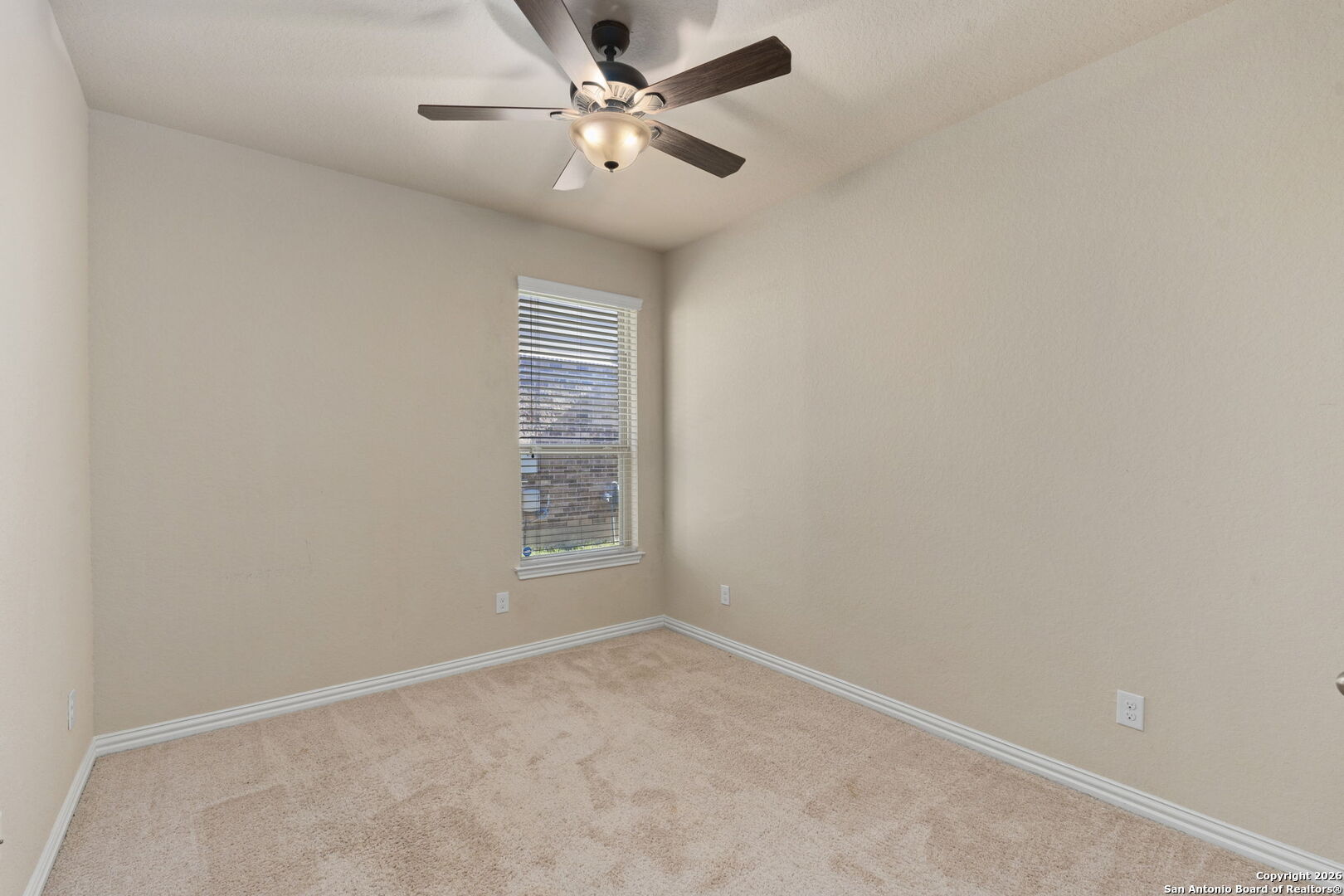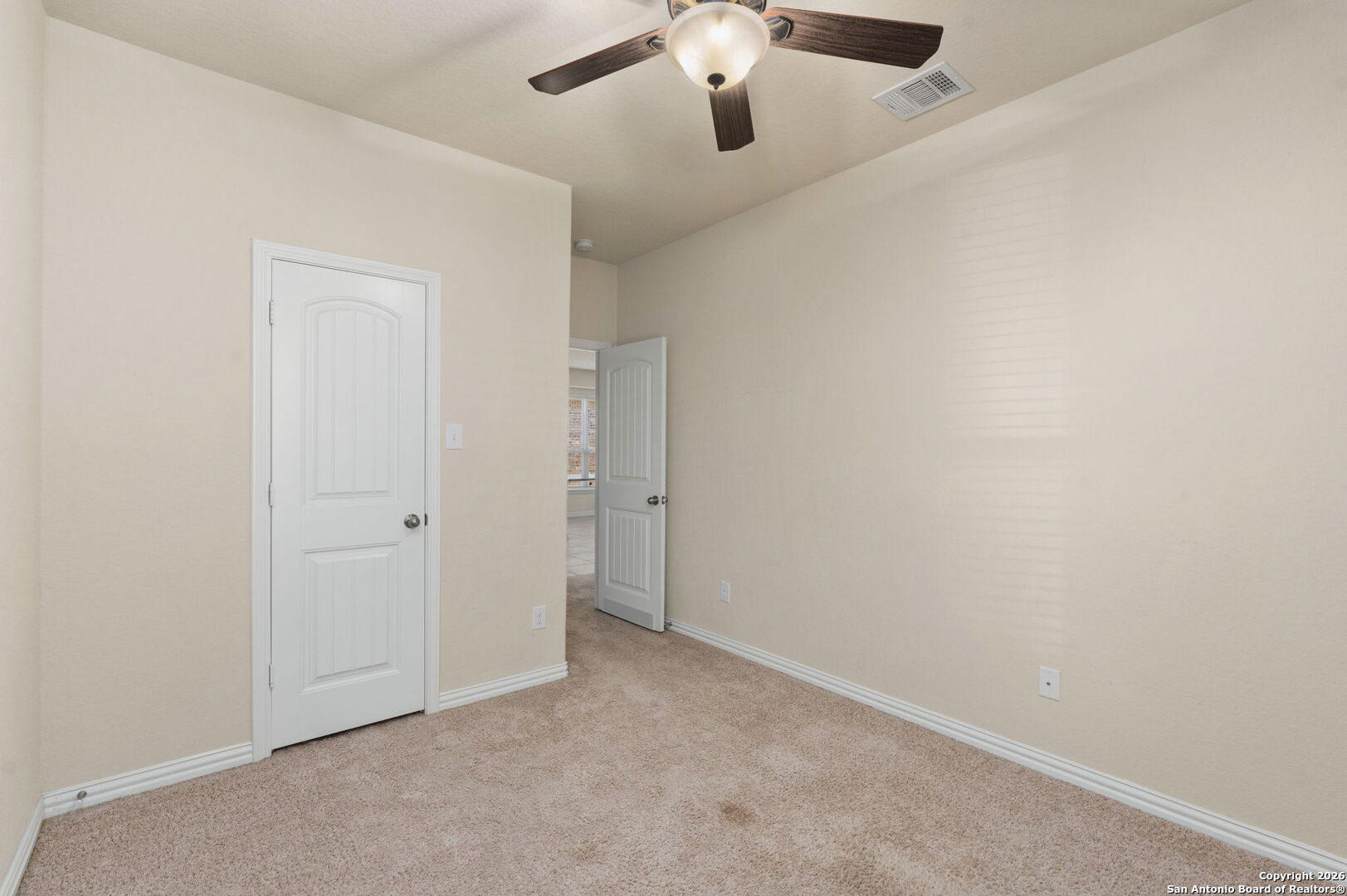 The home opens to a welcoming foyer, where French double doors to the right lead into a light filled office, creating an ideal space for work or study. Continuing forward, the layout unfolds into an open concept kitchen, living, and dining area designed for comfort and connection. The eat in kitchen features a large island, walk in pantry, and abundant cabinet space, while expansive windows throughout the living and dining areas fill the home with natural light. The primary bedroom offers a spacious walk-in closet and a well-appointed bathroom with a soaking tub, stand up shower, and double vanity. Cozy secondary bedrooms provide flexibility for family or guests, and a covered patio overlooks a large lawn, perfect for outdoor relaxation and entertaining.