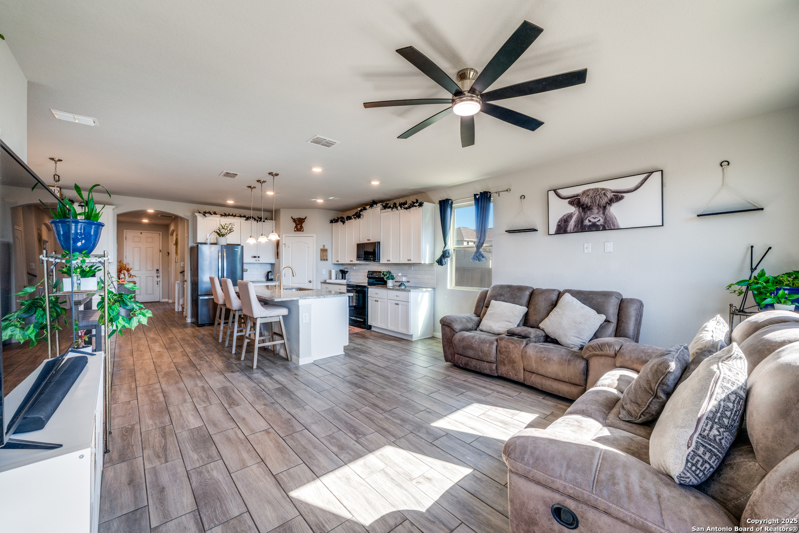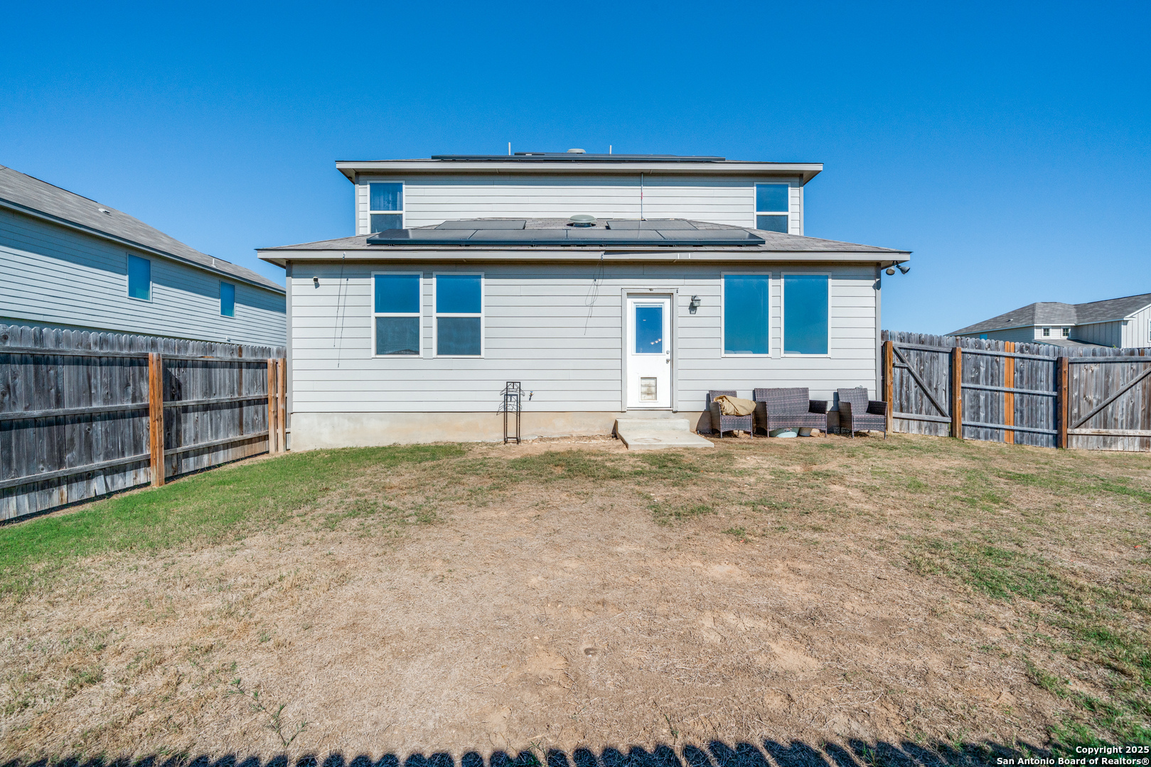 Welcome home to this modern and inviting 2-story residence featuring 4 spacious bedrooms, 3.5 baths, and a dedicated office/study, perfectly situated just off Highway 46 in a rapidly growing corridor between New Braunfels and Seguin. Designed for both style and functionality, the open-concept layout is filled with natural light and centers around a sleek contemporary kitchen offering a large island, stainless appliances, and a built-in beverage bar-ideal for everyday living and entertaining. The primary suite provides a relaxing retreat, while additional bedrooms and living spaces offer flexibility for family, guests, or hobbies. Step outside to a fenced backyard with plenty of room to unwind, play, or host gatherings. Just minutes from the Stars & Stripes Drive-In Theater, dining, shopping, and hospital-and with quick access to both I-35 and I-10-this home is perfectly positioned for an easy drive to San Antonio or Austin. A blend of modern design, comfort, and convenience in a community that continues to thrive.