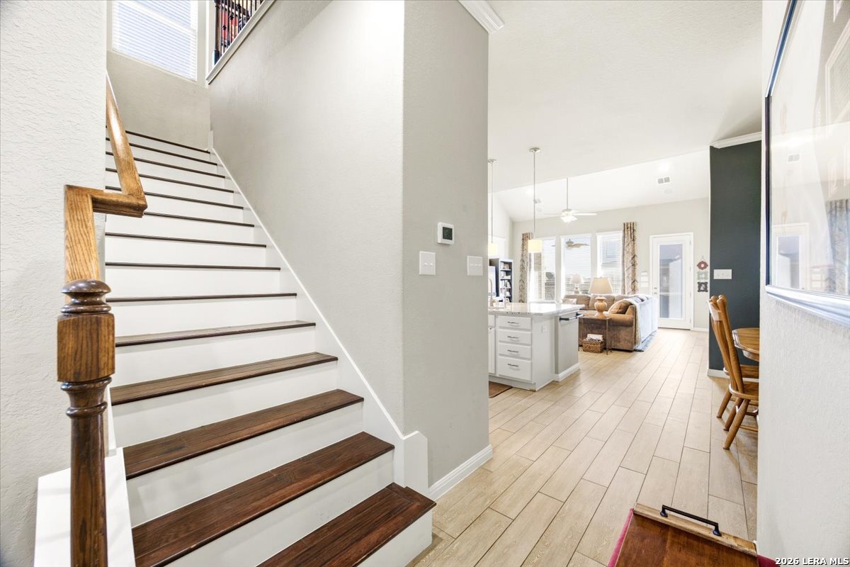 Welcome home to this beautiful, well-maintained two-story home in the highly desirable Waterford Park community. Featuring 4 bedrooms and 3.5 bathrooms, this home offers a spacious open floor plan with a neutral color palette and ceramic tile throughout the main living areas. Large windows fill the home with natural light, creating a bright and inviting atmosphere. The dream kitchen is designed for both everyday living and entertaining, featuring gas cooking, granite countertops, a large center island, and abundant storage. The spacious primary suite is conveniently located downstairs and includes a spa-like bathroom with a garden tub, separate shower, and plenty of space to relax and unwind. Upstairs you'll find a spacious game room with beautiful wood floors, along with three additional bedrooms and two full bathrooms. Situated on a large corner lot, nestled well within the subdivision, this home offers excellent curb appeal. Conveniently located off Culebra with easy access to Loop 1604, shopping, dining, and entertainment. Schedule your showing today!