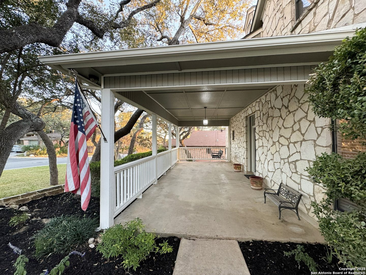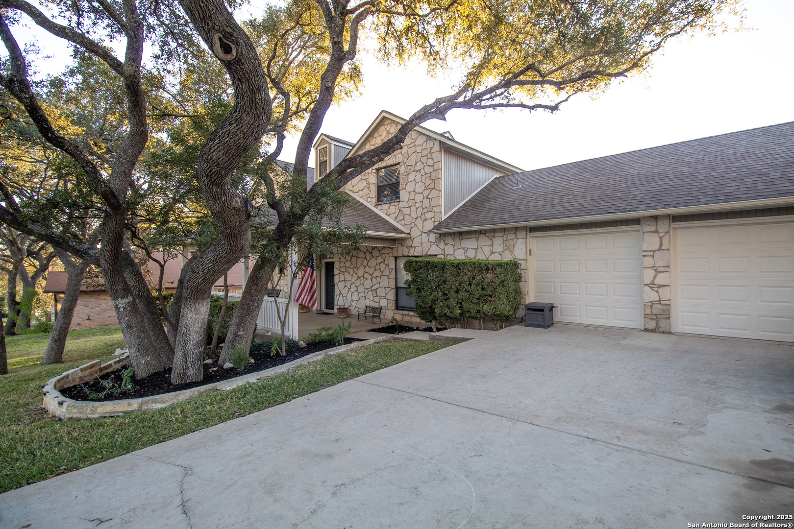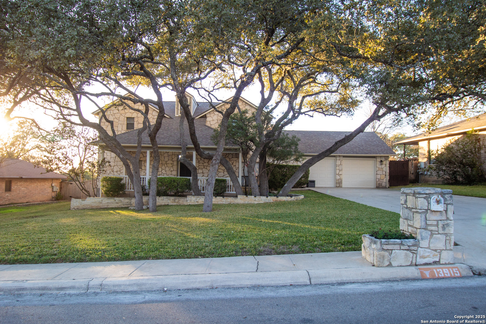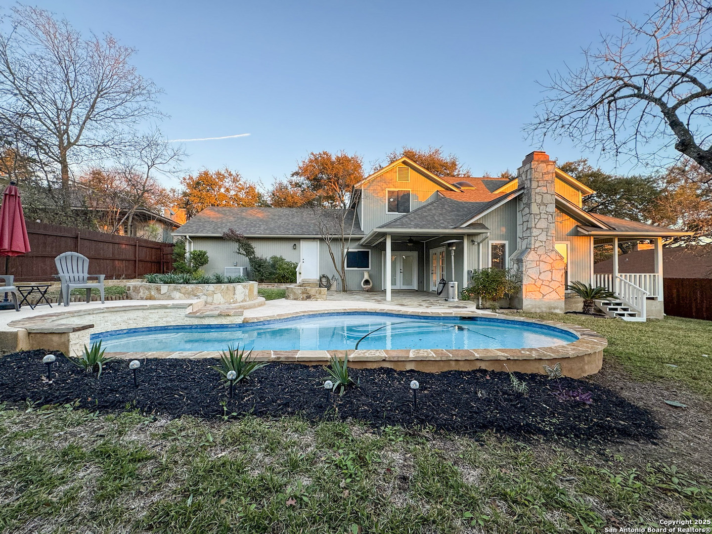 This home highlights numerous attributes that make it a standout property in the community. This residence boasts great curb appeal and features a beautiful large covered front porch perfect for relaxation or entertaining guests. Inside, you will find many custom elements, including a stunning wood ceiling, a skylight, and elegant dual French doors in the living room that open to two covered porches, further enhancing the entertaining space. Additionally, the home includes a heated pool, freshly built in 2022, and has recently renovated master and upstairs bathrooms. The property also comes equipped with a sprinkler system and is surrounded by many established oak trees. Notably, the home has a new roof and a brand-new water softener, ensuring its well-maintained status. Situated conveniently near 1604, IH 10, UTSA, La Cantera Mall, and an HEB coming soon, it is in an excellent location within a quiet neighborhood. This is a unique opportunity to enjoy a private backyard and a comfortable Texas country-living experience.