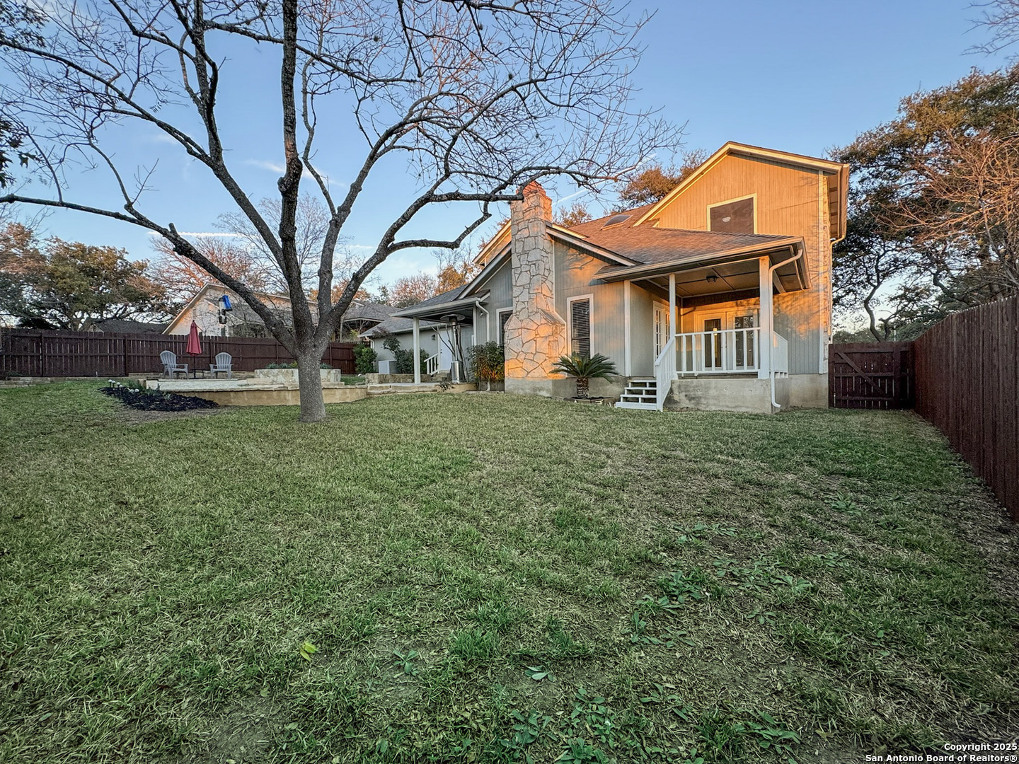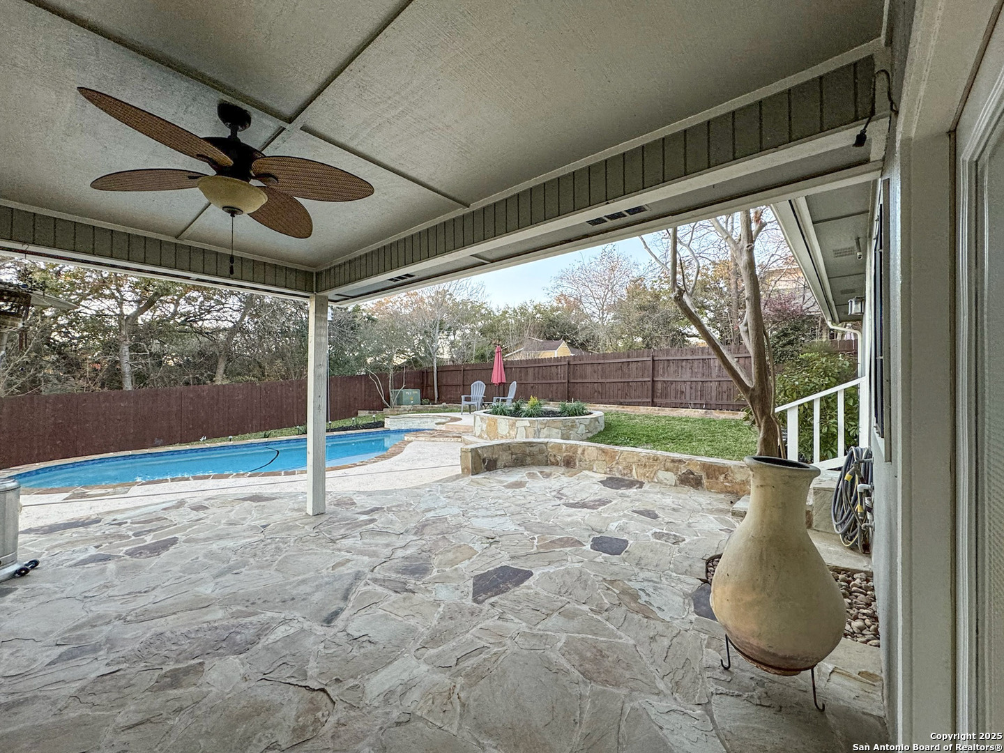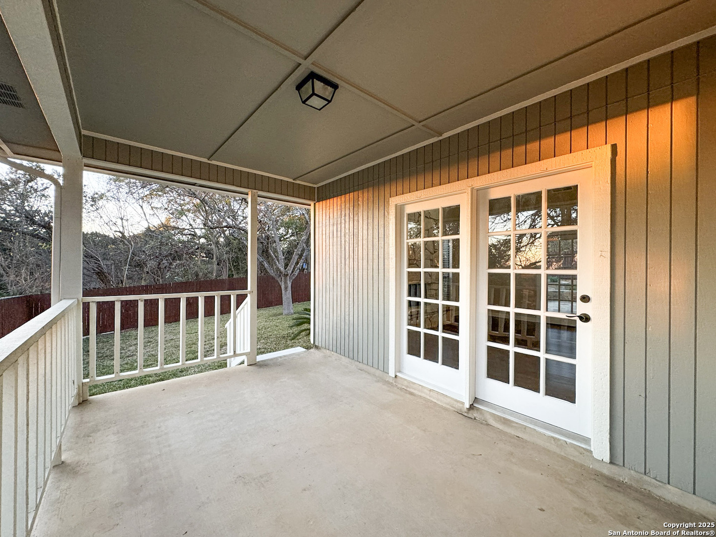 This home highlights numerous attributes that make it a standout property in the community. This residence boasts great curb appeal and features a beautiful large covered front porch perfect for relaxation or entertaining guests. Inside, you will find many custom elements, including a stunning wood ceiling, a skylight, and elegant dual French doors in the living room that open to two covered porches, further enhancing the entertaining space. Additionally, the home includes a heated pool, freshly built in 2022, and has recently renovated master and upstairs bathrooms. The property also comes equipped with a sprinkler system and is surrounded by many established oak trees. Notably, the home has a new roof and a brand-new water softener, ensuring its well-maintained status. Situated conveniently near 1604, IH 10, UTSA, La Cantera Mall, and an HEB coming soon, it is in an excellent location within a quiet neighborhood. This is a unique opportunity to enjoy a private backyard and a comfortable Texas country-living experience.