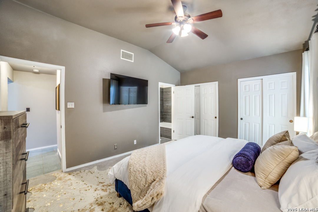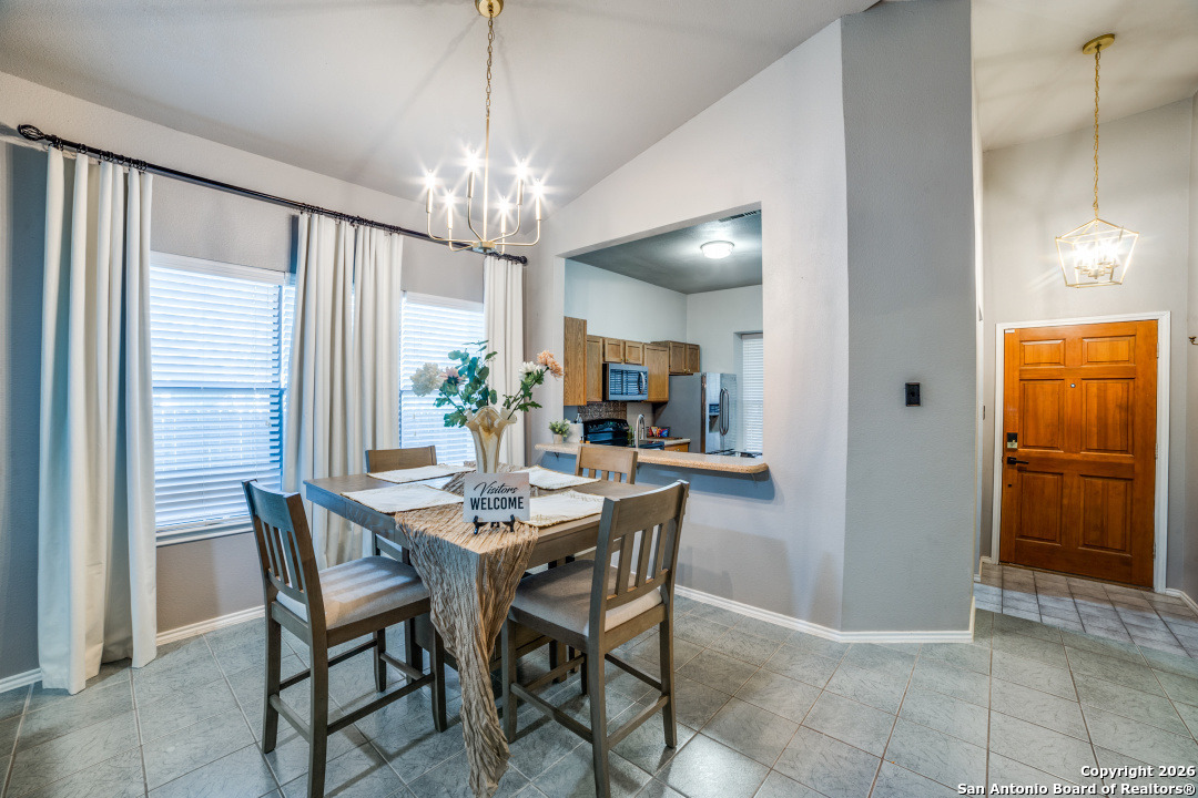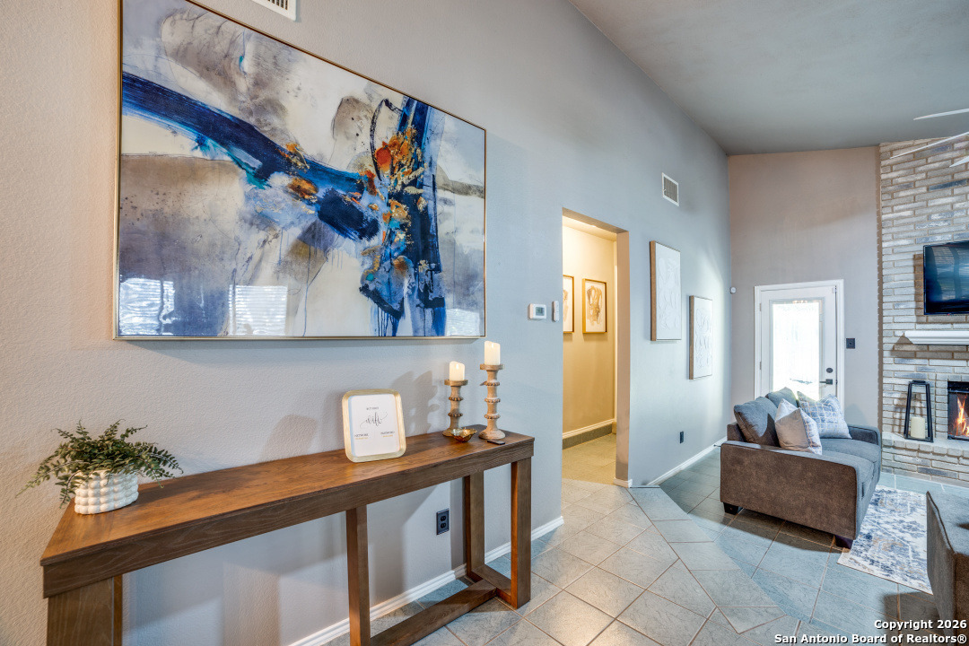 Prime location of San Antonio! Right off NW Military Highway and Salado Creek Trail. Highly sought after schools and lots of amenities close by including shopping and dining. Beautiful well kept one story, 3 bedroom, 2 bath home with a 2 car garage. Unique floor plan, with high ceilings throughout, two secondary bedrooms, one with an access door to a full bathroom. The spacious master bedroom was painted a dark grey for a deeper sleep on the weekends and the master bath has upgraded tile throughout with a tub/shower garden tub combo, oil rubbed bronze fixtures, a single vanity and a separate door to the toilet. Carpets replaced 2021, roof replaced 2022 and HVAC recently serviced. Four extra parking spaces with an elongated driveway! spacious 2 car garage as well. Pets are negotiable. Schedule your showing today!