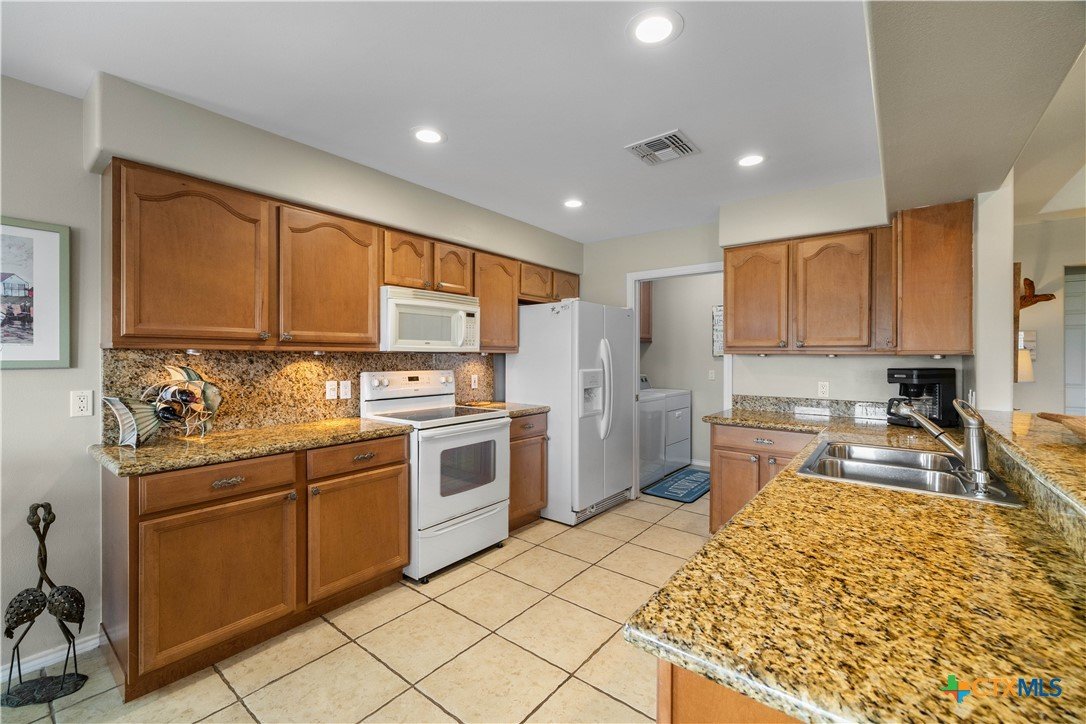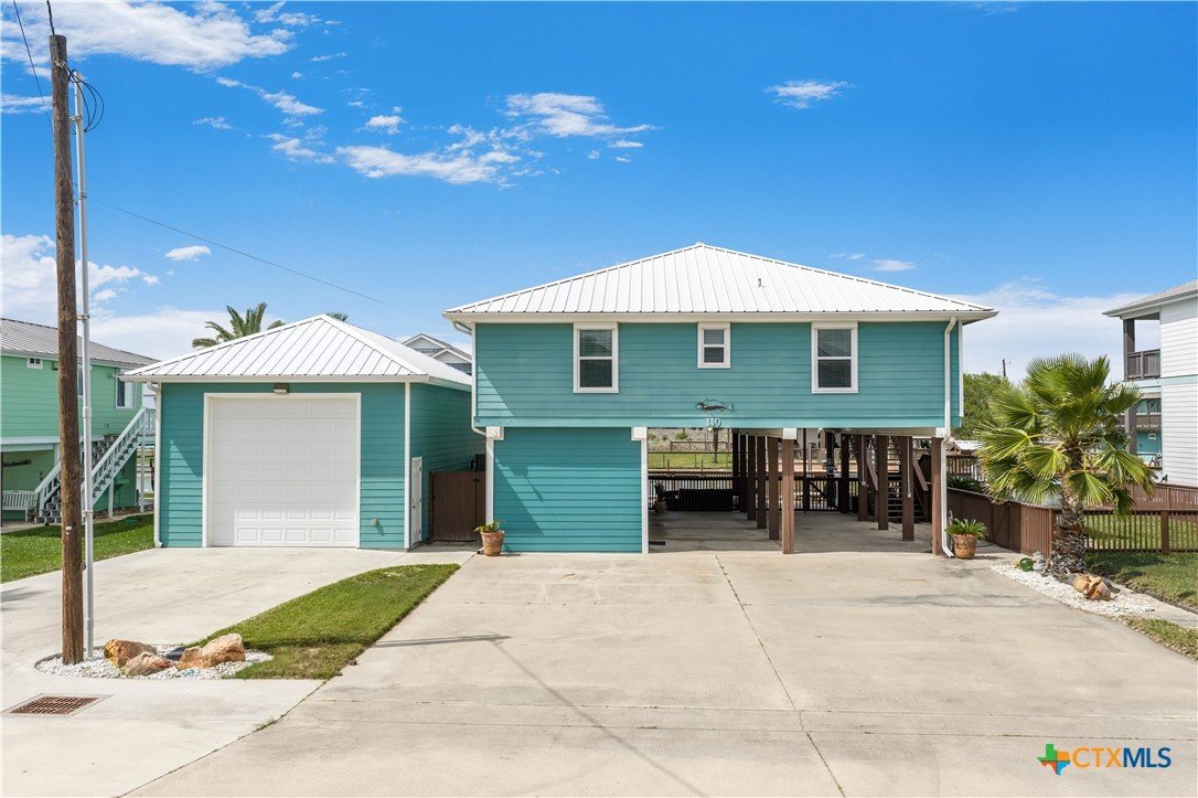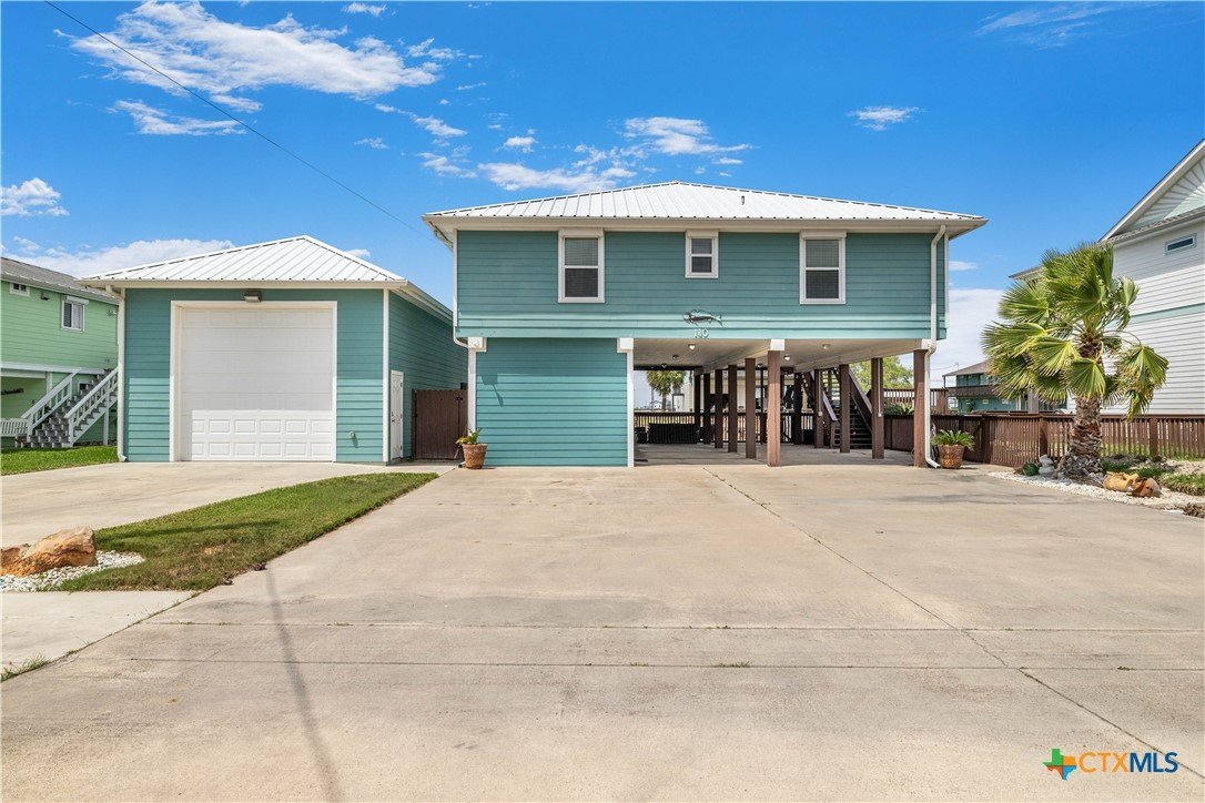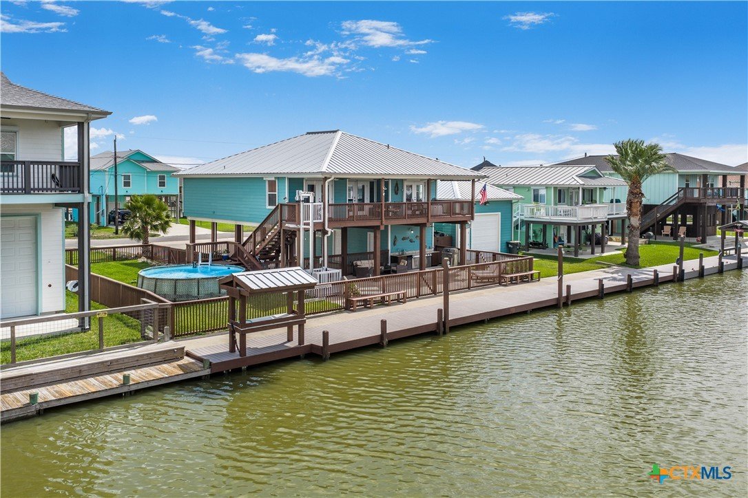 Canal-front, dockable coastal retreat in Holiday Beach designed for entertaining and large gatherings. Situated on two combined lots, this property offers exceptional indoor-outdoor living with water access and the ability to comfortably accommodate up to 19 guests. The primary living level is located upstairs and features an open-concept layout with a spacious living area, large kitchen, and access to a covered porch overlooking the canal. The primary suite and two guest bedrooms are also on this level, with the primary offering dual vanities, a jetted tub, and separate shower. Electric storm shutters provide added protection and convenience. The ground level includes two additional bedrooms and a full bathroom with direct exterior access—ideal for guests coming in from the pool or outdoor entertaining areas. Outdoor amenities are a standout, featuring a large entertaining space, outdoor kitchen, pool, and fully fenced yard. The canal-front location offers dockable access, perfect for enjoying the coastal lifestyle. A 40’ x 20’ boat barn with a 12’ overhead door and pass-through access from street to canal provides excellent storage and functionality. Equipped with water and electricity, it also includes a fish cleaning station and dedicated dog run area. Additional features include sprinkler system, electric and manual exterior shutters, dehumidifier, and high-speed internet availability. Holiday Beach amenities include a community pool, boat ramp, kayak launch, and fishing pier. Offered fully furnished with a few exclusions, this well-maintained property is turnkey and ready to enjoy.