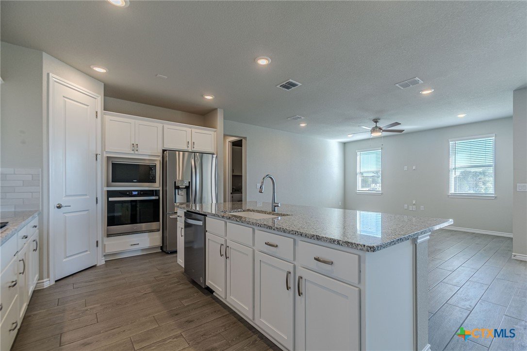 Stunning Trevino Floor Plan on a large corner lot! Enjoy breathtaking views you won’t find just anywhere—from your own back patio, relax with your morning coffee while soaking in the serene Hill Country landscape. This beautifully designed floor plan offers an open, spacious layout with thoughtful upgrades throughout. Inside, you'll find wood-look ceramic tile flooring, an island kitchen with granite countertops, and stainless steel appliances—all combining style with functionality. The split-bedroom layout ensures maximum privacy, perfect for hosting guests or sharing your home with a roommate. Better than new, barely lived in - fabulous condition! Better than NEW! Located in the sought-after Kissing Tree community, this home offers more than just great design—it offers a lifestyle. Enjoy a wide variety of clubs, social groups, and planned activities to keep you engaged and connected. Prefer to stay active? You'll love the bocce ball courts, darts, pickleball, swimming, water aerobics, and a fully equipped fitness center with a variety of classes. All of this comes with the added peace of mind of a security guard-gated community. Don’t miss your opportunity to enjoy Hill Country living at its best—come tour your new home today!