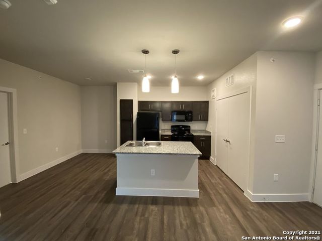 Spacious living room off the entry with a large kitchen Island and plenty of Cabinets and counter space. You will also find a spacious dining room, off the kitchen. This apartment home also comes with brushed nickel hardware pulls on the cabinets and pendant lighting over the island in the apartment. The 2-inch faux wood blinds and the two-tone paint comes standard in all our apartment homes along with the vinyl style wood flooring throughout the common areas except for the bedroom which is carpeted throughout.