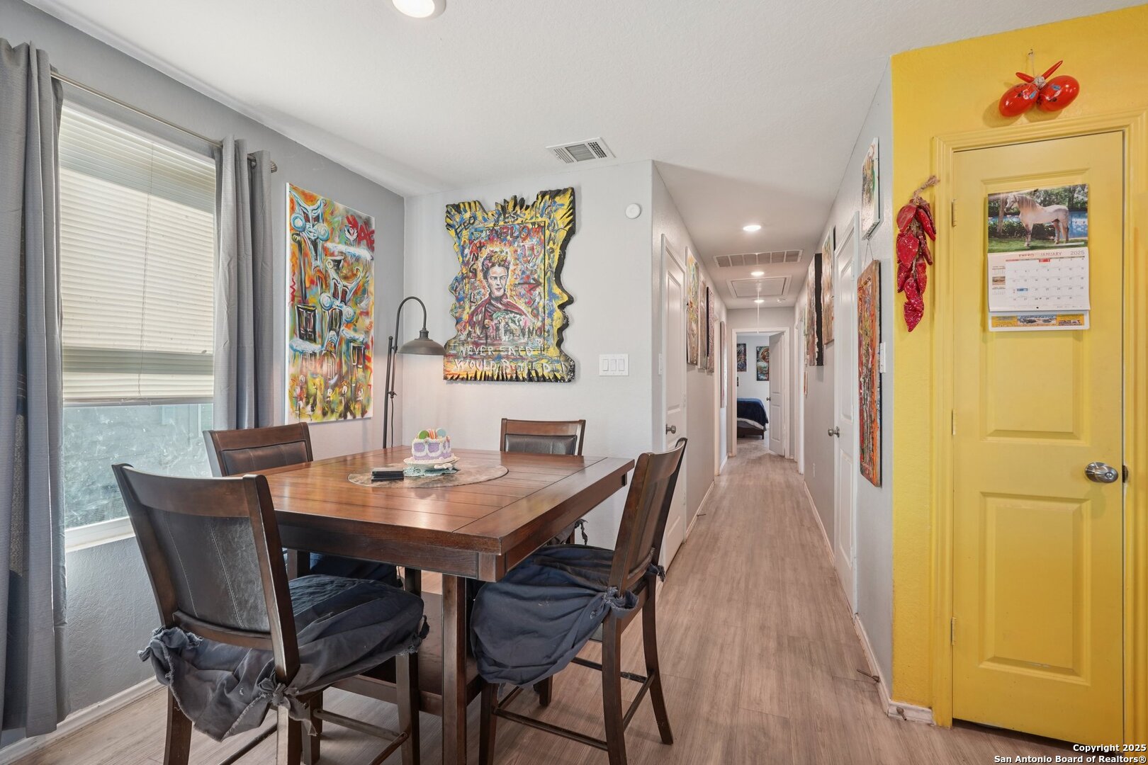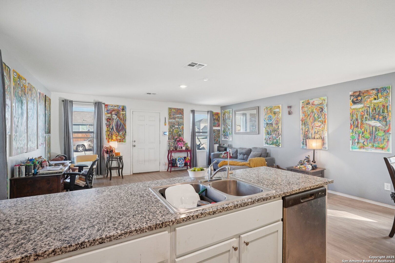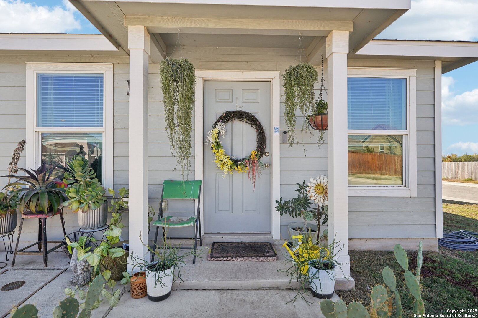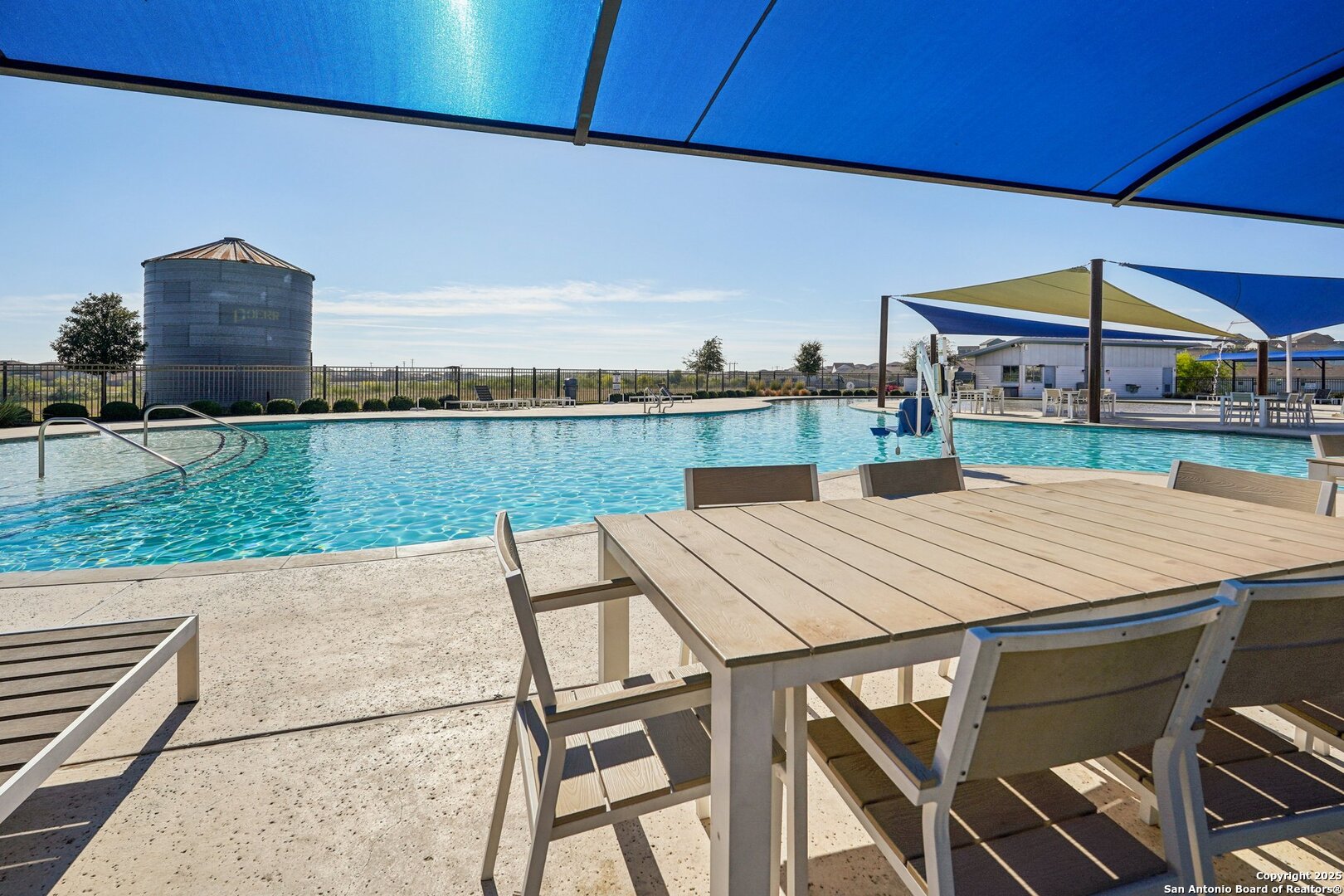 Enjoy low maintenance living at this darling home on a corner lot that backs up to a greenbelt. 4.7 VA assumable rate. Located near Hwy 90 and 211 in the popular Silos community with a gorgeous pool, playground, BBQ area, clubhouse, and fitness center. This lovely home is like-new with an open floor plan, 3 bedrooms, 2 full baths, and vinyl plank flooring throughout with zero carpet. The kitchen includes granite counters, stainless steel appliances, and gas cooking. Enjoy your spacious primary bedroom with dual closets, a full bathroom with granite counters, and easy access to the back yard for your furry friends. There's room for everyone with 2 additional bedrooms, a 2nd full bathroom, and laundry room in the hall. Washer/dryer, refrigerator, and water softener included. Only minutes from Lackland AFB, Loop 410, Loop 1604, Sea World, Costco, HEB, and dining nearby.