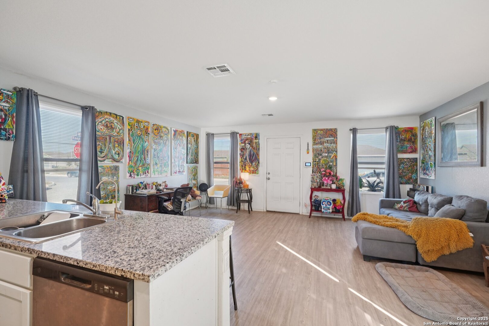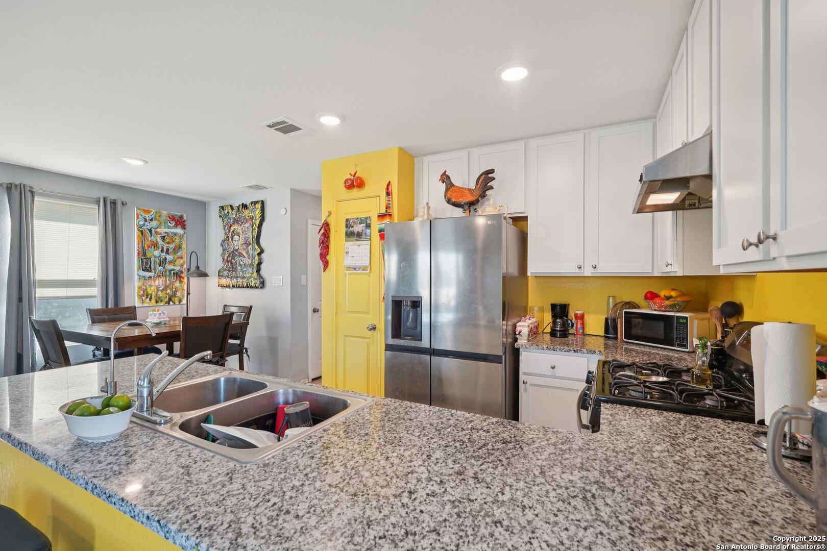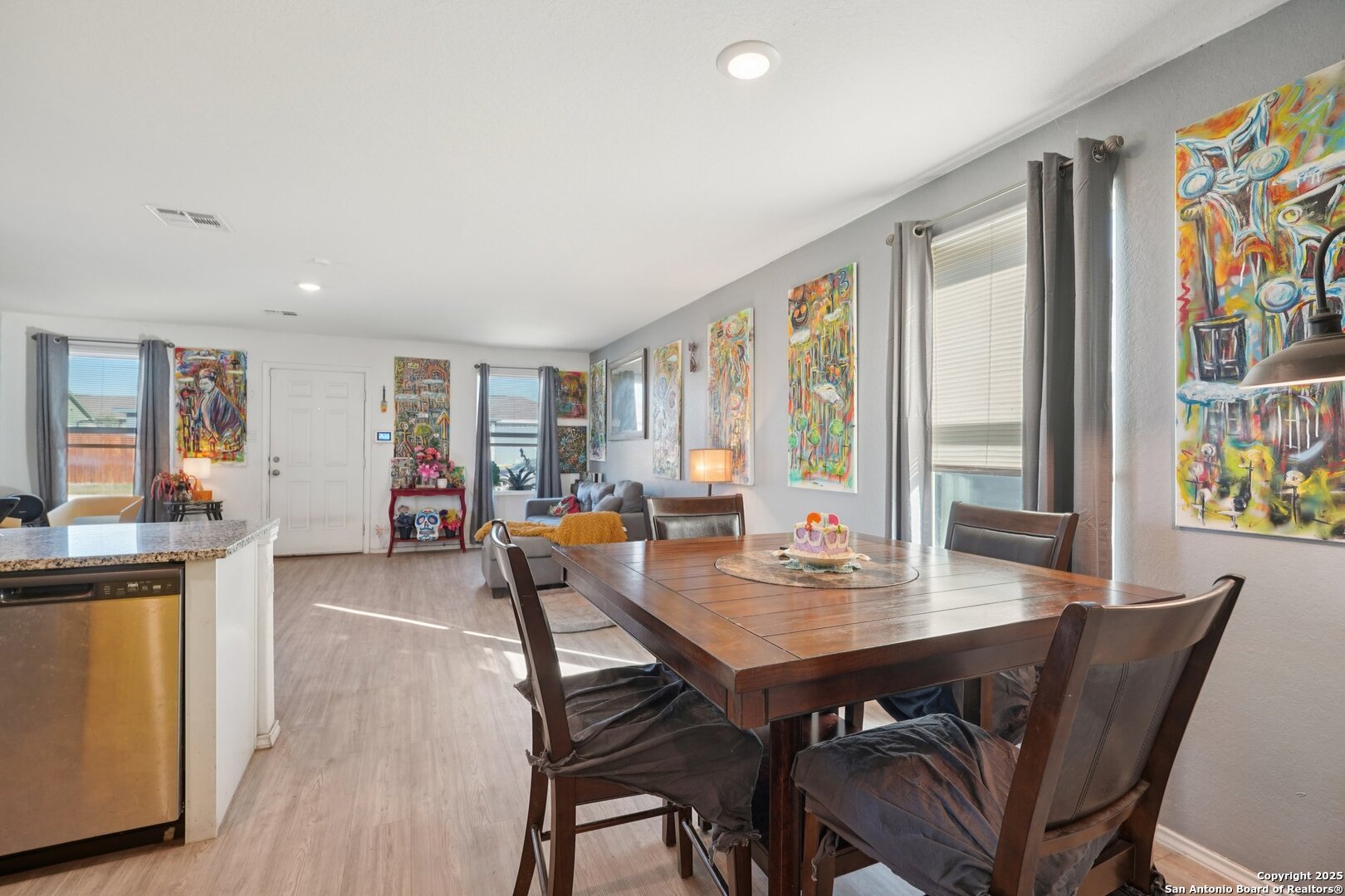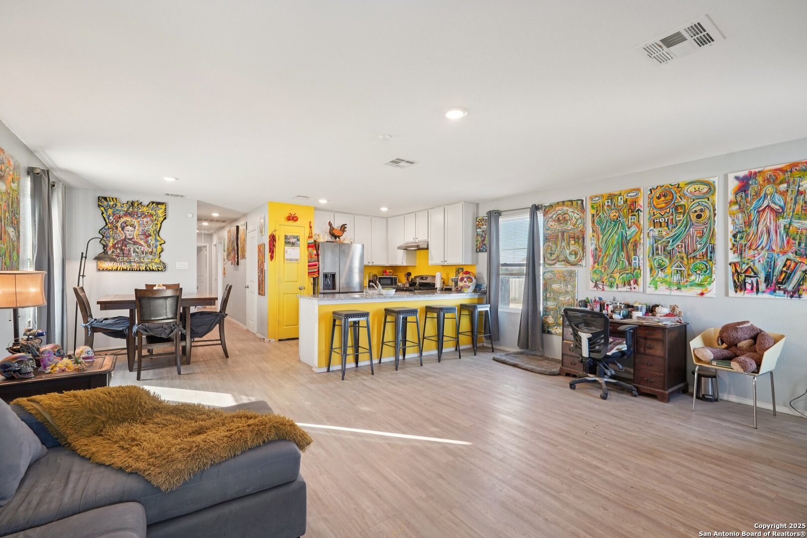 Enjoy low maintenance living at this darling home on a corner lot that backs up to a greenbelt. 4.7 VA assumable rate. Located near Hwy 90 and 211 in the popular Silos community with a gorgeous pool, playground, BBQ area, clubhouse, and fitness center. This lovely home is like-new with an open floor plan, 3 bedrooms, 2 full baths, and vinyl plank flooring throughout with zero carpet. The kitchen includes granite counters, stainless steel appliances, and gas cooking. Enjoy your spacious primary bedroom with dual closets, a full bathroom with granite counters, and easy access to the back yard for your furry friends. There's room for everyone with 2 additional bedrooms, a 2nd full bathroom, and laundry room in the hall. Washer/dryer, refrigerator, and water softener included. Only minutes from Lackland AFB, Loop 410, Loop 1604, Sea World, Costco, HEB, and dining nearby.